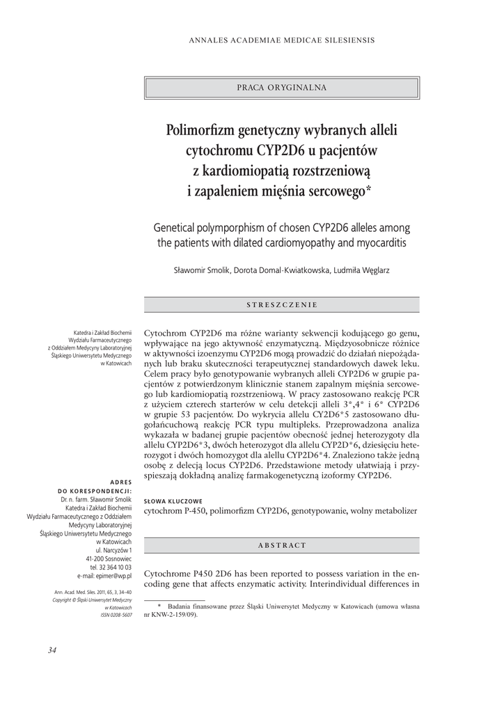 Polimorfizm genetyczny wybranych alleli cytochromu CYP2D6 u