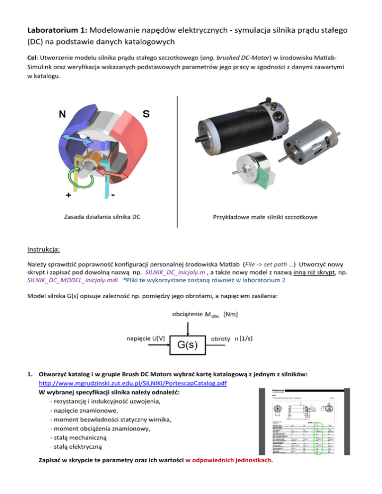Laboratorium 1: Modelowanie napędów elektrycznych - symulacja silnika prądu stałego (DC) na podstawie danych katalogowych Cel: Utworzenie modelu silnika prądu stałego szczotkowego (ang. brushed DC-Motor) w środowisku MatlabSimulink oraz weryfikacja wskazanych podstawowych parametrów jego pracy w zgodności z danymi zawartymi w katalogu. Zasada działania silnika DC Przykładowe małe silniki szczotkowe Instrukcja: Należy sprawdzić poprawność konfiguracji personalnej środowiska Matlab (File -> set path …) Utworzyć nowy skrypt i zapisać pod dowolną nazwą np. SILNIK_DC_inicjaly.m , a także nowy model z nazwą inną niż skrypt, np. SILNIK_DC_MODEL_inicjaly.mdl *Pliki te wykorzystane zostaną również w laboratorium 2 Model silnika G(s) opisuje zależność np. pomiędzy jego obrotami, a napięciem zasilania: 1. Otworzyć katalog i w grupie Brush DC Motors wybrać kartę katalogową z jednym z silników: http://www.mgrudzinski.zut.edu.pl/SILNIKI/PortescapCatalog.pdf W wybranej specyfikacji silnika należy odnaleźć: - rezystancję i indukcyjność uzwojenia, - napięcie znamionowe, - moment bezwładności statyczny wirnika, - moment obciążenia znamionowy, - stałą mechaniczną - stałą elektryczną Zapisać w skrypcie te parametry oraz ich wartości w odpowiednich jednostkach. 2. Utworzenie równań opisujących bilans napięć oraz bilans momentów: a) Uzasilania(t) = Urezystancji(t) + Ucewki(t) + SEM(t) b) Msilnika(t) = Mbezwladnosci(t) + Mobciążenia(t) Urezystancji Ucewki uzależnić od prądu Mbezwładności uzależnić od obrotów ω. 3. Przekształcenie powyższych równań do postaci operatorowej i wyznaczenie transmitancji cząstkowych G1 oraz G2 - stałe niezależne od czasu (operatora) po prawej stronie równania, zmienne po lewej stronie. 4. Uzupełnienie poniższego modelu o transmitancje cząstkowe G1, G2 oraz k1, k2. Uzupełnienie stałych ka1 oraz k2 na podstawie znajomości wyjść i wejść G1 oraz G2. Czym będą parametry k1 oraz k2 ? Jaka mają jednostkę? Sprawdzić w specyfikacji. 5. Podłączenie momentu obciążenia silnika do odpowiedniego miejsca schematu blokowego. Gdzie na schemacie występuje moment? Jakiego operatora matematycznego należy użyć? Co jest realnym obciążeniem dla silnika? 6. Budowa i uruchomienie modelu w Simulinku np. według poniższego schematu. Sygnałem zadanym może być step lub dowolny inny wygenerowany przebieg napięcia, np. suma stepów, prostokąt itp. Można wykorzystać automatyczne wywołanie wykresów z poziomu skryptu. W blokach „To workspace” należy zmienić typ danych wyjściowych na Array. Wywołanie symulacji i wydruk za pomocą komend skryptu: sim(‘SILNIK_DC_MODEL_inicjaly’, czas_sym); figure(1); plot(czas_sym, OUT(:,1), czas_sym, OUT(:,2), ... ); … 7. Przedstawić na jednym wykresie, lub grupie wykresów, prąd moment na wale silnika i obroty w funkcji czasu. Sprawdzić: a) jakie obroty uzyskuje silnik obciążony i nieobciążony? b) czy dla obciążenia znamionowego prąd osiąga wartość znamionową? c) jaki jest prąd silnika nieobciążonego w stanie ustalonym? d) jaki jest czas rozruchu silnika? e) * jak zachowa się silnik po załączeniu momentu krytycznego (stall torque) Sprawozdanie: Strona tytułowa. Powinna zawierać: temat, datę wykonania, datę oddania, nazwę grupy dziekańskiej ,nazwiska autorów , nazwisko prowadzącego. Treść: 1. Wyjaśnienie krótkie czym jest silnik prądu stałego i jakie są jego podstawowe typy. 2. Przebieg obliczeń, wyznaczone transmitancje cząstkowe i ich złożenie w pełen model silnika. 3. Wykresy charakterystycznych parametrów silnika wraz z komentarzami. Proszę stosować oznaczenia osi i jednostki wykresów. 4. Odpowiedzieć na pytania z pkt 4, 7 instrukcji. 5. Krótkie podsumowanie czy model odzwierciedla specyfikację, jakie są różnice i z czego mogą wynikać. Forma: elektroniczna (w wyjątkowych sytuacjach papierowa) w formacie *.pdf *.doc lub *.docx Nazwa pliku zgodnie ze schematem: nazwisko1_nazwisko2_(nazwisko3)_kierunek_grupa_rok_DC.doc np. Nowak_Kowalski_MT1-21C_DC.doc Proszę o przesyłanie na adres [email protected] Termin: 2 tyg. od daty przeprowadzenia laboratorium. Spóźnienie o każdy tydzień skutkuje obniżeniem oceny o pół stopnia.