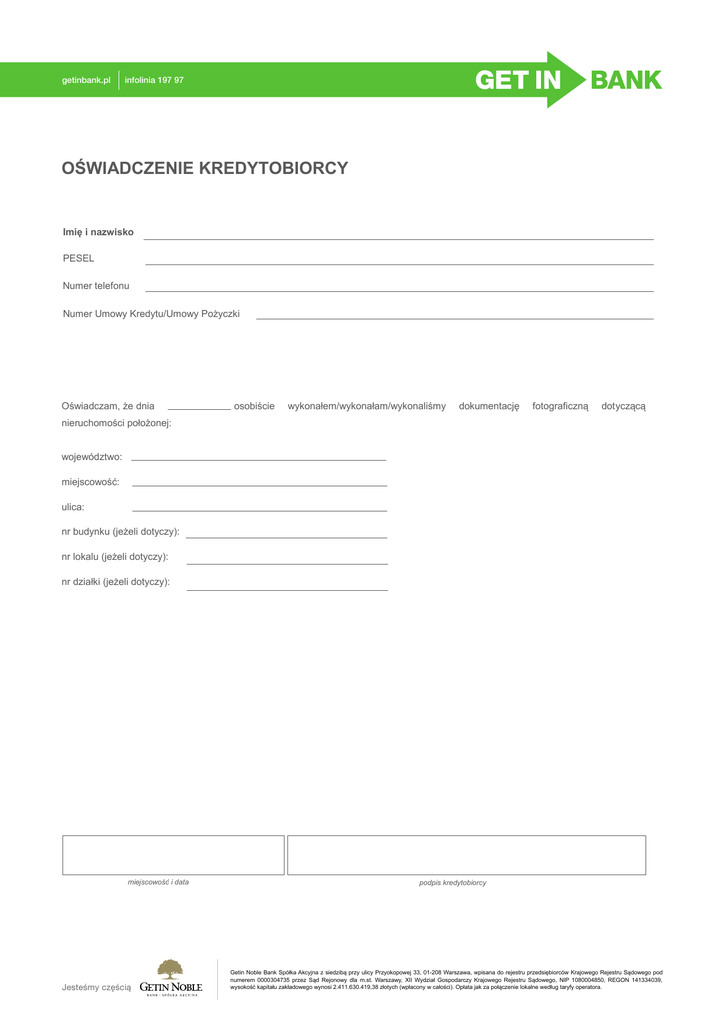 getinbank.pl infolinia 197 97 OŚWIADCZENIE KREDYTOBIORCY Imię i nazwisko PESEL Numer telefonu Numer Umowy Kredytu/Umowy Pożyczki Oświadczam, że dnia osobiście wykonałem/wykonałam/wykonaliśmy dokumentację fotograficzną dotyczącą nieruchomości położonej: województwo: miejscowość: ulica: nr budynku (jeżeli dotyczy): nr lokalu (jeżeli dotyczy): nr działki (jeżeli dotyczy): miejscowość i data Jesteśmy częścią podpis kredytobiorcy Getin Noble Bank Spółka Akcyjna z siedzibą przy ulicy Przyokopowej 33, 01-208 Warszawa, wpisana do rejestru przedsiębiorców Krajowego Rejestru Sądowego pod numerem 0000304735 przez Sąd Rejonowy dla m.st. Warszawy, XII Wydział Gospodarczy Krajowego Rejestru Sądowego, NIP 1080004850, REGON 141334039, wysokość kapitału zakładowego wynosi 2.411.630.419,38 złotych (wpłacony w całości). Opłata jak za połączenie lokalne według taryfy operatora.