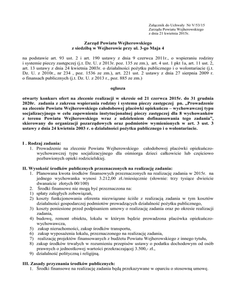 Załącznik do Uchwały Nr V/53/15 Zarządu Powiatu Wejherowskiego z dnia 21 kwietnia 2015r. Zarząd Powiatu Wejherowskiego z siedzibą w Wejherowie przy ul. 3-go Maja 4 na podstawie art. 93 ust. 2 i art. 190 ustawy z dnia 9 czerwca 2011r., o wspieraniu rodziny i systemie pieczy zastępczej (j.t. Dz. U. z 2013r. poz. 135 ze zm.), art. 4 ust. 1 pkt 1a, art. 11 ust. 2, art. 13 ustawy z dnia 24 kwietnia 2003r. o działalności poŜytku publicznego i o wolontariacie (j.t. Dz. U. z 2010r., nr 234 , poz. 1536 ze zm.), art. 221 ust. 2 ustawy z dnia 27 sierpnia 2009 r. o finansach publicznych (j.t. Dz. U. z 2013 r., poz. 885 ze zm.) ogłasza otwarty konkurs ofert na zlecenie realizacji w okresie od 21 czerwca 2015r. do 31 grudnia 2020r. zadania z zakresu wspierania rodziny i systemu pieczy zastępczej pn. ,,Prowadzenie na zlecenie Powiatu Wejherowskiego całodobowej placówki opiekuńczo – wychowawczej typu socjalizacyjnego w celu zapewnienia instytucjonalnej pieczy zastępczej dla 8 wychowanków z terenu Powiatu Wejherowskiego wraz z udzieleniem dofinansowania tego zadania”, skierowany do organizacji pozarządowych oraz podmiotów wymienionych w art. 3 ust. 3 ustawy z dnia 24 kwietnia 2003 r. o działalności poŜytku publicznego i o wolontariacie. I . Rodzaj zadania: 1. Prowadzenie na zlecenie Powiatu Wejherowskiego całodobowej placówki opiekuńczowychowawczej typu socjalizacyjnego dla ośmiorga dzieci całkowicie lub częściowo pozbawionych opieki rodzicielskiej. II. Wysokość środków publicznych przeznaczonych na realizację zadania: 1. Planowana kwota środków finansowych przeznaczonych na realizację zadania w 2015r. na jednego wychowanka wynosi 3.212,00 zł./miesięcznie (słownie: trzy tysiące dwieście dwanaście złotych 00/100) 2. Środki finansowe nie mogą być przeznaczona na: 1) spłaty zaległych zobowiązań, 2) koszty funkcjonowania oferenta niezwiązane ściśle z realizacją zadania w tym kosztów działalności gospodarczej podmiotów prowadzących działalność poŜytku publicznego, 3) koszty poniesione przed podpisaniem umowy o realizację zadania oraz po okresie realizacji zadania, 4) budowę, remont obiektu, lokalu w którym będzie prowadzona placówka opiekuńczowychowawcza, 5) zakup nieruchomości, zakup środków transportu, 6) zakup wyposaŜenia lokalu, przeznaczonego na realizację zadania, 7) realizację projektów finansowanych z budŜetu Powiatu Wejherowskiego z innego tytułu, 8) zakup środków trwałych w rozumieniu przepisów ustawy o podatku dochodowym od osób prawnych o jednostkowej wartości przekraczającej 3.500,- zł., 9) działalność polityczną i religijną. III. Zasady przyznania środków publicznych: 1. Środki finansowe na realizację zadania będą przekazywane w oparciu o stosowną umowę. 2. Warunkiem podpisania umowy o realizację zadania jest przedstawienie aktualnego zezwolenia Wojewody Pomorskiego na prowadzenie placówki opiekuńczo - wychowawczej typu socjalizacyjnego dla 8 dzieci, w której podmiot ma zamiar realizować zadanie. 3. Środki finansowe będą przekazywane w wysokości miesięcznej stanowiącej 1/7 kwoty przeznaczonej na realizację zadania w 2015 roku, do 10-go kaŜdego miesiąca kalendarzowego, w kolejnych latach w wysokości 1/12 kwoty określonej na dany rok budŜetowy, po przedłoŜeniu informacji o liczbie podopiecznych przebywających w placówce na koniec poprzedniego miesiąca. 4. Miesięczną wysokość środków finansowych ustala się w wysokości odpowiadającej iloczynowi liczby podopiecznych w placówce na koniec miesiąca i jednostkowego miesięcznego wydatku na utrzymanie dziecka w placówce. IV. Termin i warunki realizacji zadania: 1. Termin: 1) Zadanie będzie realizowane w okresie od 21 czerwca 2015r. do 31 grudnia 2020r. 2) Podmiot, któremu Powiat zleci realizację zadania, po jego zakończeniu zobowiązany jest do złoŜenia szczegółowego sprawozdania merytorycznego i finansowego z wykonania zadania, w terminie 30 dni od dnia zakończenia jego realizacji, na formularzu zgodnym ze wzorem załącznika nr 3 do rozporządzenia Ministra Pracy i Polityki Społecznej z dnia 15 grudnia 2010r. w sprawie wzoru oferty i ramowego wzoru umowy dotyczących realizacji zadania publicznego oraz wzoru sprawozdania z wykonania tego zadania ( Dz. U . z 2011, Nr 6, poz. 25). 3) Okresem sprawozdawczym jest rok budŜetowy. 2. Warunki realizacji zadania: 1) warunki merytoryczne: a. zapewnienie dzieciom całodobowej opieki i wychowania oraz zaspakajania ich niezbędnych potrzeb, w szczególności emocjonalnych, rozwojowych, zdrowotnych, bytowych, społecznych kulturowych i religijnych, b. zapewnienie dzieciom wyŜywienia dostosowanego do potrzeb rozwojowych oraz dostępu przez całą dobę do podstawowych produktów Ŝywnościowych oraz napojów, c. zapewnienie dzieciom dostępu do opieki zdrowotnej i zaopatrzenia w produkty lecznicze, d. zapewnienie dzieciom dostępu do zajęć wychowawczych, kompensacyjnych, a takŜe terapeutycznych i rewalidacyjnych, o ile takie są wskazane dla dziecka, e. zapewnienie dzieciom pomocy psychologicznej, f. zapewnienie dzieciom wyposaŜenia w odzieŜ, obuwie, bieliznę, zabawki, środki higieny osobistej i inne przedmioty stosownie do wieku i indywidualnych potrzeb, g. zapewnienie dzieciom zaopatrzenia w podręczniki, pomoce i przybory szkolne, h. zapewnienie dzieciom od 5 roku Ŝycia kwoty pienięŜnej do własnego dysponowania, w wysokości zgodnej z § 18 ust. 1 pkt 8 rozporządzenia Ministra Pracy i Polityki Społecznej z dnia 22 grudnia 2011r., w sprawie instytucjonalnej pieczy zastępczej ( Dz. U. Nr 292. poz. 1720), i. zapewnienie dzieciom dostępu do nauki w zaleŜności od potrzeb dziecka oraz pomocy w nauce, w szczególności przy odrabianiu zadań domowych oraz w miarę potrzeby udział w zajęciach wyrównawczych, j. zapewnienie dzieciom uczestnictwa w zajęciach pozalekcyjnych i rekreacyjno-sportowych, k. zapewnienie dzieciom opłaty w bursie lub internacie, je