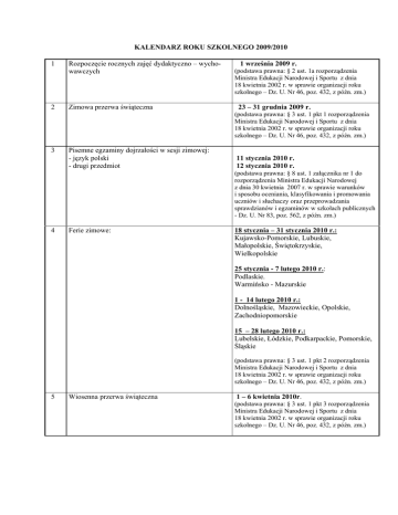 KALENDARZ ROKU SZKOLNEGO 2009/2010 1 2 Rozpoczęcie rocznych zajęć dydaktyczno – wychowawczych Zimowa przerwa świąteczna 1 września 2009 r. (podstawa prawna: § 2 ust. 1a rozporządzenia Ministra Edukacji Narodowej i Sportu z dnia 18 kwietnia 2002 r. w sprawie organizacji roku szkolnego – Dz. U. Nr 46, poz. 432, z późn. zm.) 23 – 31 grudnia 2009 r. (podstawa prawna: § 3 ust. 1 pkt 1 rozporządzenia Ministra Edukacji Narodowej i Sportu z dnia 18 kwietnia 2002 r. w sprawie organizacji roku szkolnego – Dz. U. Nr 46, poz. 432, z późn. zm.) 3 Pisemne egzaminy dojrzałości w sesji zimowej: - język polski - drugi przedmiot 11 stycznia 2010 r. 12 stycznia 2010 r. (podstawa prawna: § 8 ust. 1 załącznika nr 1 do rozporządzenia Ministra Edukacji Narodowej z dnia 30 kwietnia 2007 r. w sprawie warunków i sposobu oceniania, klasyfikowania i promowania uczniów i słuchaczy oraz przeprowadzania sprawdzianów i egzaminów w szkołach publicznych - Dz. U. Nr 83, poz. 562, z późn. zm.) 4 Ferie zimowe: 18 stycznia – 31 stycznia 2010 r.: Kujawsko-Pomorskie, Lubuskie, Małopolskie, Świętokrzyskie, Wielkopolskie 25 stycznia - 7 lutego 2010 r.: Podlaskie. Warmińsko - Mazurskie 1 - 14 lutego 2010 r.: Dolnośląskie, Mazowieckie, Opolskie, Zachodniopomorskie 15 – 28 lutego 2010 r.: Lubelskie, Łódzkie, Podkarpackie, Pomorskie, Śląskie (podstawa prawna: § 3 ust. 1 pkt 2 rozporządzenia Ministra Edukacji Narodowej i Sportu z dnia 18 kwietnia 2002 r. w sprawie organizacji roku szkolnego – Dz. U. Nr 46, poz. 432, z późn. zm.) 5 Wiosenna przerwa świąteczna 1 – 6 kwietnia 2010r. (podstawa prawna: § 3 ust. 1 pkt 3 rozporządzenia Ministra Edukacji Narodowej i Sportu z dnia 18 kwietnia 2002 r. w sprawie organizacji roku szkolnego – Dz. U. Nr 46, poz. 432, z późn. zm.) 6 Sprawdzian przeprowadzany w ostatnim roku nauki w szkole podstawowej: a) w szkołach dla dorosłych, w których nauka kończy się w semestrze jesiennym b) dodatkowy termin sprawdzianu w szkołach wymienionych w lit. a c) w pozostałych szkołach podstawowych d) dodatkowy termin sprawdzianu w szkołach wymienionych w lit. c ustalił dyrektor Centralnej Komisji Egzaminacyjnej 12 stycznia 2010 r. 8 kwietnia 2010 r. 8 kwietnia 2010 r. 8 czerwca 2010 r. (podstawa prawna: § 33 rozporządzenia Ministra Edukacji Narodowej z dnia 30 kwietnia 2007 r. w sprawie warunków i sposobu oceniania, klasyfikowania i promowania uczniów i słuchaczy oraz przeprowadzania sprawdzianów i egzaminów w szkołach publicznych - Dz. U. Nr 83, poz. 562, z późn. zm.) 7 8 9 Egzamin przeprowadzany w ostatnim roku nauki w gimnazjum: a) w gimnazjach dla dorosłych, w których nauka kończy się w semestrze jesiennym: - część humanistyczna - część matematyczno-przyrodnicza - część z języka obcego nowożytnego b) dodatkowy termin w gimnazjach wymienionych w lit. a: - część humanistyczna - część matematyczno-przyrodnicza - część z języka obcego nowożytnego c) w pozostałych gimnazjach: - część humanistyczna - część matematyczno-przyrodnicza - część z języka obcego nowożytnego d) dodatkowe terminy w gimnazjach wymienionych w lit. c: - część humanistyczna - część matematyczno-przyrodnicza - część z języka obcego nowożytnego Zakończenie zajęć w klasach (semestrach) programowo najwyższych w szkołach ponadgimnazjalnych ( z wyjątkiem szkół wymienionych w pkt 9): Zakończenie zajęć w klasach (semestrach) programowo najwyższych zasadniczych szkół zawodowych i szkół policealnych ustalił dyrektor Centralnej Komisji Egzaminacyjnej 11 stycznia 2010 r. 12 stycznia 2010 r. 13 stycznia 2010 r. 27 kwietnia 2010 r. 28 kwietnia 2010 r. 29 kwietnia 2010 r. 27 kwietnia 2010 r. 28 kwietnia 2010 r. 29 kwietnia 2010 r. 8 czerwca 2010 r. 9 czerwca 2010 r. 10 czerwca 2010 r. (podstawa prawna: § 33 rozporządzenia Ministra Edukacji Narodowej z dnia 30 kwietnia 2007 r. w sprawie warunków i sposobu oceniania, klasyfikowania i promowania uczniów i słuchaczy oraz przeprowadzania sprawdzianów i egzaminów w szkołach publicznych - Dz. U. Nr 83, poz. 562, z późn. zm.) 8 stycznia 2010 r (sesja zimowa) 30 kwietnia 2010 r. (sesja wiosenna) (podstawa prawna: § 2 ust. 4 rozporządzenia Ministra Edukacji Narodowej i Sportu z dnia 18 kwietnia 2002 r. w sprawie organizacji roku szkolnego – Dz. U. Nr 46, poz. 432, z późn. zm.) 15 stycznia 2010 r. lub 18 czerwca 2010 r. (podstawa prawna: § 2 ust. 3 rozporządzenia Ministra Edukacji Narodowej i Sportu z dnia 18 kwietnia 2002 r. w sprawie organizacji roku szkolnego – Dz. U. Nr 46, poz. 432, z późn. zm.) 10 11 Pisemne egzaminy dojrzałości w sesji wiosennej - język polski - drugi przedmiot - język ojczysty – w szkołach lub oddziałach z ojczystym językiem nauczania mniejszości narodowej 11 maja 2010 r. 12 maja 2010 r. 13 maja 2010 r. (podstawa prawna: § 8 ust. 1 załącznika nr 1 do rozporządzenia Ministra Edukacji Narodowej z dnia 30 kwietnia 2007 r. w sprawie warunków i sposobu oceniania, klasyfikowania i promowania uczniów i słuchaczy oraz przeprowadzania sprawdzianów i egzaminów w szkołach publicznych - Dz. U. Nr 83, poz. 562, z późn. zm.) Egzamin maturalny: ustalił dyrektor Centralnej Komisji Egzaminacyjnej - 4 – 28 maja 2010 r. początek 4 maja 2010 r. część ustna część pisemna (podstawa prawna: § 61 rozporządzenia Ministra Edukacji Narodowej z dnia 30 kwietnia 2007 r. w sprawie warunków i sposobu oceniania, klasyfikowania i promowania uczniów i słuchaczy oraz przeprowadzania sprawdzianów i egzaminów w szkołach publicznych - Dz. U. Nr 83, poz. 562, z późn. zm.) 12 Egzamin potwierdzający kwalifikacje zawodowe a) sesja zimowa - etap pisemny - etap praktyczny b) sesja letnia - etap pisemny - etap praktyczny ustalił dyrektor Centralnej Komisji Egzaminacyjnej 19 stycznia 2010 r. od 20 stycznia 2010 r. 21 czerwca 2010 r. od 22 czerwca 2010 r. (podstawa prawna: § 113 rozporządzenia Ministra Edukacji Narodowej z dnia