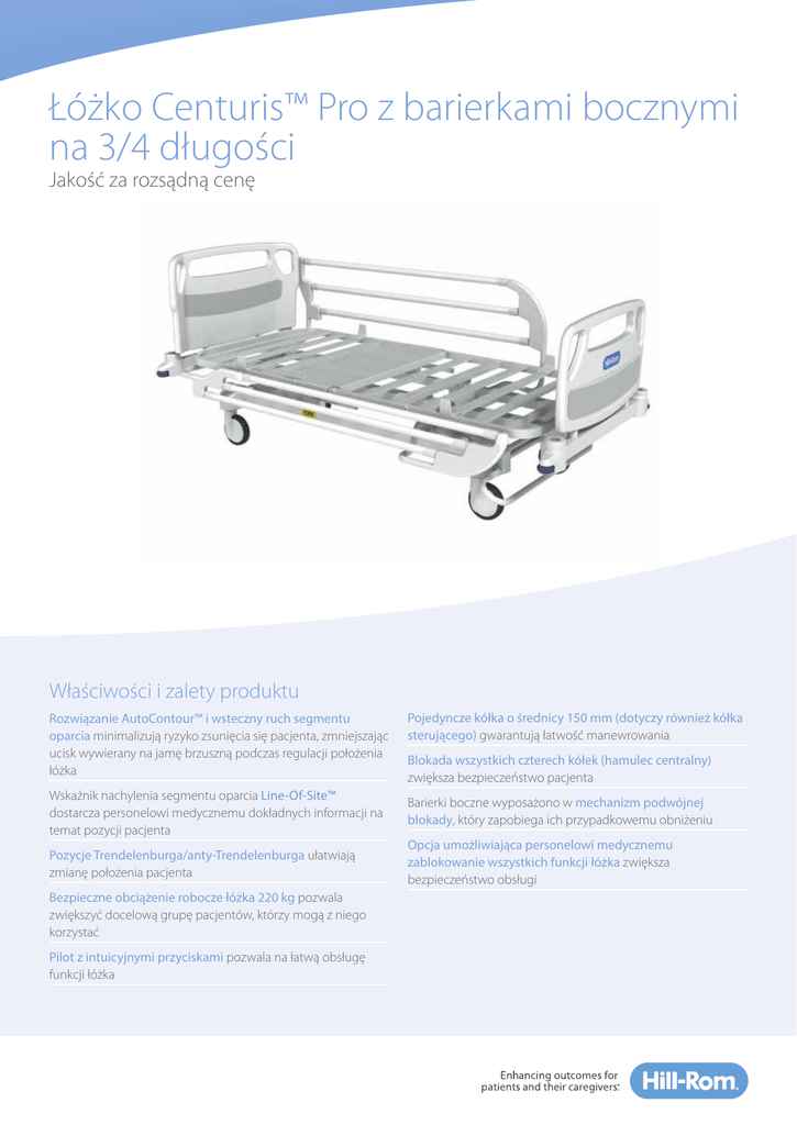Łóżko Centuris™ Pro z barierkami bocznymi na 3/4 długości Jakość za rozsądną cenę Właściwości i zalety produktu Rozwiązanie AutoContour™ i wsteczny ruch segmentu oparcia minimalizują ryzyko zsunięcia się pacjenta, zmniejszając ucisk wywierany na jamę brzuszną podczas regulacji położenia łóżka Wskaźnik nachylenia segmentu oparcia Line-Of-Site™ dostarcza personelowi medycznemu dokładnych informacji na temat pozycji pacjenta Pozycje Trendelenburga/anty-Trendelenburga ułatwiają zmianę położenia pacjenta Bezpieczne obciążenie robocze łóżka 220 kg pozwala zwiększyć docelową grupę pacjentów, którzy mogą z niego korzystać Pilot z intuicyjnymi przyciskami pozwala na łatwą obsługę funkcji łóżka Pojedyncze kółka o średnicy 150 mm (dotyczy również kółka sterującego) gwarantują łatwość manewrowania Blokada wszystkich czterech kółek (hamulec centralny) zwiększa bezpieczeństwo pacjenta Barierki boczne wyposażono w mechanizm podwójnej blokady, który zapobiega ich przypadkowemu obniżeniu Opcja umożliwiająca personelowi medycznemu zablokowanie wszystkich funkcji łóżka zwiększa bezpieczeństwo obsługi Łóżko Centuris Pro z barierkami bocznymi na 3/4 długości Pilot Wskaźnik nachylenia segmentu oparcia Line-Of-Site Mechaniczna dźwignia RKO po obu stronach łóżka Dane techniczne Bezpieczne obciążenie robocze 220 kg Masa łóżka 124,5 kg Regulacja wysokości od 39 do 77 cm Klasa wodoszczelności IPX4 Regulacja nachylenia łóżka Segment oparcia od 0 do 65° Segment ud od 0 do 28° Segment nożny od -22 do -3° Kółko sterujące po stronie segmentu oparcia Hamulec centralny po stronie segmentu nożnego Uchwyty na statywy na kroplówkę w 4 rogach Mechaniczna dźwignia RKO po obu stronach łóżka Pozycja Trendelenburga/ anty-Trendelenburga od -17 do +17° Szerokość leża 90 cm Długość leża 200 cm Powierzchnia leża metal Wysokość barierki bocznej 38 cm Kółka 150 mm, pojedyncze Firma Hill-Rom jest światowym liderem w dziedzinie technologii medycznych, zatrudniającym około 10 000 pracowników na całym świecie. Współdziałając z placówkami służby zdrowia w ponad 100 krajach, opracowujemy rozwiązania z zakresu opieki medycznej, które pozwalają uzyskiwać doskonałe pod względem klinicznym i finansowym rezultaty w następujących pięciu podstawowych obszarach: stopniowe uruchamianie pacjentów, terapia ran i zapobieganie ich powstawaniu, przebieg opieki medycznej, bezpieczeństwo i skuteczność zabiegów chirurgicznych oraz zdrowie dróg oddechowych. Celem wszystkich pracowników firmy Hill-Rom i oferowanych przez nas programów oraz produktów jest poprawa wyników leczenia pacjentów oraz warunków pracy personelu medycznego na całym świecie. Niektóre produkty/elementy opcjonalne nie są dostępne w sprzedaży w niektórych krajach. Dalsze informacje o oferowanych przez nas produktach lub usługach można uzyskać u lokalnego przedstawiciela firmy Hill-Rom lub na stronie internetowej: www.hill‑rom.com Niniejszy dokument jest przeznaczony wyłącznie dla personelu medycznego. Wyroby medyczne opisane w niniejszej broszurze są przeznaczone do stosowania wyłącznie u pacjentów przebywających w placówkach medycznych. Wymienione tu urządzenia medyczne są produktami medycznymi posiadającymi oznaczenie CE wskazujące na ich zgodność ze stosownymi dyrektywami. Firma Hill-Rom zaleca dokładne zapoznanie się ze szczegółowymi instrukcjami dotyczącymi bezpiecznego i właściwego użytkowania sprzętu, dołączonymi do wyrobów medycznych. Odpowiedzialność za właściwe użytkowanie i konserwację tych wyrobów medycznych ponosi personel placówek służby zdrowia. Firma Hill-Rom zastrzega sobie prawo do wprowadzania zmian w projekcie, danych technicznych oraz modelach produktów bez wcześniejszego powiadomienia. Jedyną gwarancją, jakiej udziela firma Hill-Rom, jest wyraźna gwarancja pisemna udzielona w trakcie sprzedaży lub dzierżawy produktów. ©2015 Hill‑Rom Services, Inc. WSZELKIE PRAWA ZASTRZEŻONE. Nr dok.: 5PL133302-01, 3 lutego 2016