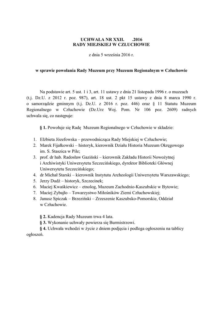 UCHWAŁA NR XXII. .2016 RADY MIEJSKIEJ W CZŁUCHOWIE z dnia 5 września 2016 r. w sprawie powołania Rady Muzeum przy Muzeum Regionalnym w Człuchowie Na podstawie art. 5 ust. 1 i 3, art. 11 ustawy z dnia 21 listopada 1996 r. o muzeach (t.j. Dz.U. z 2012 r. poz. 987), art. 18 ust. 2 pkt 15 ustawy z dnia 8 marca 1990 r. o samorządzie gminnym (t.j. Dz.U. z 2016 r. poz. 446) oraz § 11 Statutu Muzeum Regionalnego w Człuchowie (Dz.Urz Woj. Pom. Nr 106 poz. 2609) radnych uchwala się, co następuje: § 1. Powołuje się Radę Muzeum Regionalnego w Człuchowie w składzie: 1. Elżbieta Józefowska – przewodnicząca Rady Miejskiej w Człuchowie; 2. Marek Fijałkowski – historyk, kierownik Działu Historia Muzeum Okręgowego im. S. Staszica w Pile; 3. prof. dr hab. Radosław Gaziński – kierownik Zakładu Historii Nowożytnej i Archiwistyki Uniwersytetu Szczecińskiego, dyrektor Biblioteki Głównej Uniwersytetu Szczecińskiego; 4. dr Michał Starski – kierownik Instytutu Archeologii Uniwersytetu Warszawskiego; 5. Jerzy Dudź – historyk, Szczecinek; 6. Maciej Kwaśkiewicz – etnolog, Muzeum Zachodnio-Kaszubskie w Bytowie; 7. Maciej Zybajło – Towarzystwo Miłośników Ziemi Człuchowskiej; 8. Janusz Spiczak – Brzeziński – Zrzeszenie Kaszubsko-Pomorskie, Oddział w Człuchowie. § 2. Kadencja Rady Muzeum trwa 4 lata. § 3. Wykonanie uchwały powierza się Burmistrzowi. § 4. Uchwała wchodzi w życie z dniem podjęcia i podlega ogłoszeniu na tablicy ogłoszeń. Uzasadnienie: W związku zakończeniem kadencji Rady Muzeum na wniosek dyrektora Muzeum Regionalnego w Człuchowie zgodnie ze statutem muzeum przedstawia się nowy skład Rady Muzeum na kadencję 2016-2020. Sporz. MP