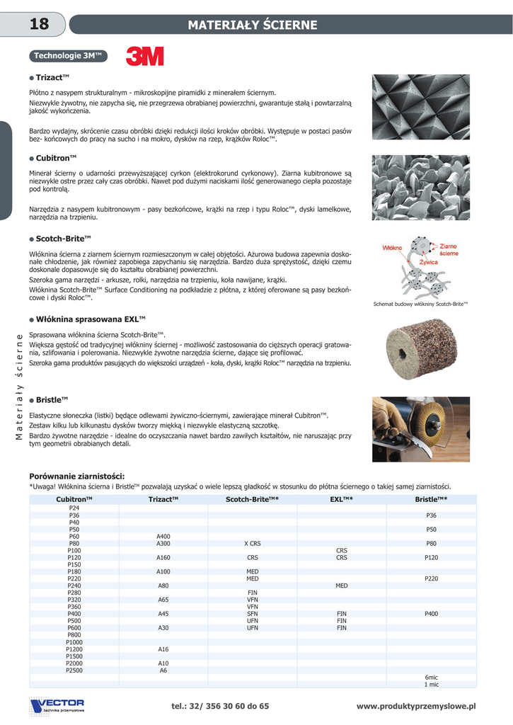 18 MATERIAŁY ŚCIERNE Technologie 3M™ Trizact™ Płótno z nasypem strukturalnym - mikroskopijne piramidki z minerałem ściernym. Niezwykle żywotny, nie zapycha się, nie przegrzewa obrabianej powierzchni, gwarantuje stałą i powtarzalną jakość wykończenia. Bardzo wydajny, skrócenie czasu obróbki dzięki redukcji ilości kroków obróbki. Występuje w postaci pasów bez- końcowych do pracy na sucho i na mokro, dysków na rzep, krążków Roloc™. Cubitron™ Minerał ścierny o udarności przewyższającej cyrkon (elektrokorund cyrkonowy). Ziarna kubitronowe są niezwykle ostre przez cały czas obróbki. Nawet pod dużymi naciskami ilość generowanego ciepła pozostaje pod kontrolą. Narzędzia z nasypem kubitronowym - pasy bezkońcowe, krążki na rzep i typu Roloc™, dyski lamelkowe, narzędzia na trzpieniu. Scotch-Brite™ Włóknina ścierna z ziarnem ściernym rozmieszczonym w całej objętości. Ażurowa budowa zapewnia doskonałe chłodzenie, jak również zapobiega zapychaniu się narzędzia. Bardzo duża sprężystość, dzięki czemu doskonale dopasowuje się do kształtu obrabianej powierzchni. Szeroka gama narzędzi - arkusze, rolki, narzędzia na trzpieniu, koła nawijane, krążki. Włóknina Scotch-Brite™ Surface Conditioning na podkładzie z płótna, z której oferowane są pasy bezkońcowe i dyski Roloc™. Schemat budowy włókniny Scotch-Brite™ Materiały ścierne Włóknina sprasowana EXL™ Sprasowana włóknina ścierna Scotch-Brite™. Większa gęstość od tradycyjnej włókniny ściernej - możliwość zastosowania do cięższych operacji gratowania, szlifowania i polerowania. Niezwykle żywotne narzędzia ścierne, dające się profilować. Szeroka gama produktów pasujących do większości urządzeń - koła, dyski, krążki Roloc™ narzędzia na trzpieniu. Bristle™ Elastyczne słoneczka (listki) będące odlewami żywiczno-ściernymi, zawierające minerał Cubitron™. Zestaw kilku lub kilkunastu dysków tworzy miękką i niezwykle elastyczną szczotkę. Bardzo żywotne narzędzie - idealne do oczyszczania nawet bardzo zawiłych kształtów, nie naruszając przy tym geometrii obrabianych detali. Porównanie ziarnistości: *Uwaga! Włóknina ścierna i BristleTM pozwalają uzyskać o wiele lepszą gładkość w stosunku do płótna ściernego o takiej samej ziarnistości. CubitronTM P24 P36 P40 P50 P60 P80 P100 P120 P150 P180 P220 P240 P280 P320 P360 P400 P500 P600 P800 P1000 P1200 P1500 P2000 P2500 TrizactTM Scotch-BriteTM* EXLTM* BristleTM* P36 P50 A400 A300 X CRS A160 CRS A100 MED MED A80 A65 A45 A30 FIN VFN VFN SFN UFN UFN CRS CRS MED FIN FIN FIN P80 P120 P220 P400 A16 A10 A6 6mic 1 mic tel.: 32/ 356 30 60 do 65 www.produktyprzemyslowe.pl MATERIAŁY ŚCIERNE 19 Dyski fibrowe 3M™ NOWOŚĆ: Cubitron II unikalna ziarnistość 36+, 60+, 80+ Wraz z rozwojem technologii obróbki ściernej system ziarnistości podlegał ciągłym zmianom. Cubitron II nie jest tu wyjątkiem. Zaprojektowane przez inżynierów 3M trójkątne ziarna ścierne nie mieszczą się w tradycyjnej klasyfikacji ziarnistości. Precyzyjnie ukształtowane ziarna ścierne Cubitron II są większe, wydajniejsze, szybciej skrawające i bardziej żywotne niż ziarna występujące w klasyfikacji ANSI. Dyski fibrowe 987C Cubitron II Jeśli pracujesz na materiałach wrażliwych na ciepło np. stal nierdzewna z pewnością docenisz sposób pracy dysków fibrowych 987C, które nie przegrzewają obrabianej powierzchni, szlifują szybciej bez potrzeby nacisku i wykazują dłuższą żywotność w porównaniu z tradycyjnymi dyskami ściernymi. Dyski fibrowe Cubitron II Dyski fibrowe 982C szlifują dużo szybciej, wytrzymują dłużej i potrzebują mniejszego nacisku operatora w porównaniu do tradycyjnych dysków fibrowych z konkurencyjnym ziarnem ściernym. To oznacza mniejsze zmęczenie operatora i lepszy komfort pracy co z kolei prowadzi do mniejszej ilości błędów, większej jednorodności obrabianych elementów i poprawy wydajności pracy. Materiały ścierne 785C dyski fibrowe 3M™ Cechy ogólne: Dyski fibrowe zalecane do obróbki stali nierdzewnych. Mają nasyp z ceramicznego tlenku glinu - Cubitron™, ze specjalnym dodatkiem chłodzącym. Zalety i korzyści: Dzięki zastosowaniu opatentowanego minerału Cubitron™ gwarantują zwiększoną wydajność i wygodę pracy. Dodatkowe informacje: Dyski fibrowe 3M dostępne są w średnicach 115 mm, 125 mm i 180 mm. 988C dyski fibrowe 3M™ Cechy ogólne: Dyski 3M 988C mają nasyp z ceramicznego tlenku glinu - Cubitron™ na podkładzie z twardej fibry. Charakteryzują się rewelacyjną siłą ścierania i żywotnością 2-3 razy wyższą od tradycyjnych dysków korundowych. Zalecane są do obróbki stali konstrukcyjnej, żeliwa i metali nieżelaznych. Dodatkowe informacje: Dyski fibrowe 3M dostępne są w średnicach 115 mm, 125 mm i 180 mm. 581C dyski fibrowe 3M™ Cechy ogólne: 3M 581C dyski fibrowe ogólnego zastosowania z nasypem cyrkonowym. Zalety i korzyści: Wysoka wydajność i agresywna siła ścierania. Do miękkich stali i metali nieżelaznych. Dodatkowe informacje: Dyski fibrowe 3M dostępne są w średnicach 115 mm, 125 mm i 180 mm. Akcesoria do dysków fibrowych: Podkładka: 9583 - 115 mm, 9584 - 125 mm, 9921 - 180 mm. www.produktyprzemyslowe.pl tel.: 32/ 356 30 60 do 65 20 MATERIAŁY ŚCIERNE Dyski lamelkowe 3M™ Dyski lamelkowe 3M™ do użycia na szlifierkach kątowych, służą do usuwania spoin oraz do wykańczania elementów ze stali miękkich, stali nierdzewnych oraz innych metali nieżelaznych. Specjalna budowa dysków lamelkowych zapewnia delikatniejszą pracę oraz zwiększoną żywotność w porównaniu z dyskami fibrowymi. Dyski lamelkowe nie wymagają stosowania żadnych podkładek. 574F dyski lamelkowe 3M™ Cechy ogólne: Wykonane ze sztywnego, wytrzymałego płótna poliestrowego z nasypem z elektrokorundu cyrkonowego. Dodatkowe informacje: Zalecane do zgrubnego szlifowania i pracy na krawę