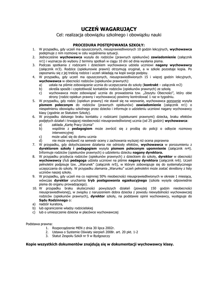 UCZEŃ WAGARUJĄCY Cel: realizacja obowiązku szkolnego i obowiązku nauki 1. PROCEDURA POSTĘPOWANIA SZKOŁY: W przypadku, gdy uczeń ma opuszczonych, nieusprawiedliwionych 10 godzin lekcyjnych, wychowawca podejmuje z nim rozmowę w celu wyjaśnienia sytuacji. 2. Jednocześnie wychowawca wysyła do rodziców (prawnych opiekunów) zawiadomienie (załącznik nr1) i wyznacza do wyboru 2 terminy spotkań w ciągu 10 dni od dnia wysłania pisma. 3. Podczas spotkania z rodzicami i dzieckiem wychowawca udziela uczniowi nagany wychowawcy (załącznik nr3). Rodzice (opiekunowie prawni) otrzymują oryginał, a w szkole pozostaje kopia. Po zapoznaniu się z jej treścią rodzice i uczeń składają na kopii swoje podpisy. 4. W przypadku, gdy uczeń ma opuszczonych, nieusprawiedliwionych 15 i więcej godzin lekcyjnych, wychowawca w obecności rodziców (opiekunów prawnych): a) ustala na piśmie zobowiązanie ucznia do uczęszczania do szkoły (kontrakt – załącznik nr2) b) określa sposób i częstotliwość kontaktów rodziców (opiekunów prawnych) ze szkołą c) wychowawca może zobowiązać ucznia do prowadzenia tzw. „Zeszytu Obecności”, który obie strony (rodzic-opiekun prawny i wychowawca) powinny kontrolować 1 raz w tygodniu. 5. W przypadku, gdy rodzic (opiekun prawny) nie stawił się na wezwanie, wychowawca ponownie wysyła pismem poleconym do rodziców (prawnych opiekunów) zawiadomienie (załącznik nr1) o niespełnieniu obowiązku szkolnego przez dziecko i informuje o udzieleniu uczniowi nagany wychowawcy klasy (zgodnie ze Statutem Szkoły). 6. W przypadku dalszego braku kontaktu z rodzicami (opiekunami prawnymi) dziecka, braku efektów podjętych działań i trwającej nieobecności nieusprawiedliwionej ucznia (od 25 godzin) wychowawca: a) zakłada „Kartę Pracy Ucznia” b) wspólnie z pedagogiem może zwrócić się z prośbą do policji o odbycie rozmowy interwencyjnej c) może udać się do domu ucznia d) nie może wystawić na semestr oceny z zachowania wyższej niż ocena poprawna 7. W przypadku, gdy dotychczasowe działania nie odniosły efektów, wychowawca w porozumieniu z dyrektorem szkoły i pedagogiem wysyła pismem poleconym upomnienie (załącznik nr4). Informuje rodziców (opiekunów prawnych) o udzieleniu dziecku nagany dyrektora. 8. W przypadku przybycia rodziców (opiekunów prawnych) z dzieckiem do szkoły, dyrektor w obecności wychowawcy i/lub pedagoga udziela uczniowi na piśmie nagany dyrektora (załącznik nr6). Uczeń pełnoletni podpisuje tzw. „Warunek” (załącznik nr5), w którym zobowiązuje się do systematycznego uczęszczania do szkoły. W przypadku złamania „Warunku” uczeń pełnoletni może zostać skreślony z listy uczniów naszej szkoły. 9. W przypadku, gdy uczeń ma co najmniej 50% nieobecności nieusprawiedliwionych w okresie 1 miesiąca, wówczas dyrektor uruchamia tryb postępowania egzekucyjnego (szkoła wysyła odpowiednie pisma do organu prowadzącego). 10. W przypadku braku skuteczności powyższych działań (powyżej 150 godzin nieobecności nieusprawiedliwionej), w związku z naruszeniem dobra dziecka z powodu niewydolności wychowawczej rodziców (opiekunów prawnych), dyrektor szkoły, na podstawie opinii wychowawcy, występuje do Sądu Rodzinnego o: a) nadzór kuratora, b) lub ograniczenie władzy rodzicielskiej c) lub o umieszczenie dziecka w placówce wychowawczej Podstawa prawna: 1. Rozporządzenie MEN z dnia 30 lipca 2002r. 2. Ustawa o Systemie Oświaty sierpień 2008r. art. 20 pkt. 1-2 3. Statut Zespołu Szkół nr 9 w Bydgoszczy Kopie wszystkich dokumentów znajdują się w dokumentacji wychowawcy klasy.