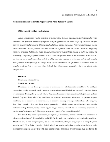 1 29. niedziela zwykła, Rok C, Łk 18,1-8 Niedziela misyjna w parafii Najśw. Serca Pana Jezusa w Opolu Z Ewangelii według św. Łukasza Jezus opowiedział swoim uczniom przypowieść o tym, że zawsze powinni się modlić i nie ustawać: «W pewnym mieście żył sędzia, który Boga się nie bał i nie liczył się z ludźmi. W tym samym mieście żyła wdowa, która przychodziła do niego z prośbą: "Obroń mnie przed moim przeciwnikiem". Przez pewien czas nie chciał; lecz potem rzekł do siebie: "Chociaż Boga się nie boję ani się z ludźmi nie liczę, to jednak ponieważ naprzykrza mi się ta wdowa, wezmę ją w obronę, żeby nie przychodziła bez końca i nie zadręczała mnie"». I Pan dodał: «Słuchajcie, co ten nie sprawiedliwy sędzia mówi. A Bóg czyż nie weźmie w obronę swoich wybranych, którzy dniem i nocą wołają do Niego, i czy będzie zwlekał w ich sprawie? Powiadam wam, że prędko weźmie ich w obronę. Czy jednak Syn Człowieczy znajdzie wiarę na ziemi, gdy przyjdzie?» Homilia Skuteczność modlitwy Modlitwa i wiara Dzisiejsze słowo Boże poucza nas o konieczności i skuteczności modlitwy. W każdym czasie i w każdej sytuacji, czyli „zawsze powinniśmy modlić się i nie ustawać” – mówi Jezus w dzisiejszej Ewangelii (por. Łk 18,1). Czy jednak rzeczywiście czynimy tak, jak nam poleca Jezus? Czy modlimy się? Czy modlimy się często i wytrwale? Owszem, na pewno często modlimy się o zdrowie, o pomyślność, o poprawę naszej sytuacji materialnej. Chcemy, by Pan Bóg spełnił taką czy inną naszą potrzebę. I kiedy nasze oczekiwania nie zostają natychmiast spełnione, wydaje nam się, że Bóg o nas zapomniał, że nie interesuje się nami, a może w ogóle Go nie ma? Dlaczego pozostaje „głuchy” na nasze błagania? Św. Jakub daje nam odpowiedź: „Pożądacie, a nie macie, żywicie morderczą zazdrość, a nie możecie osiągnąć. Prowadzicie walki i kłótnie, a nic nie posiadacie, gdyż się nie modlicie. Modlicie się, a nie otrzymujecie, bo się źle modlicie, starając się jedynie o zaspokojenie swych żądz” (Jk 4,2-3). I dodaje: „Jeżeli więc ktoś zamierzałby być przyjacielem świata, staje się nieprzyjacielem Boga” (Jk 4,4). Jak formułowane przez nas prośby mogą być modlitwą do 2 Boga, skoro cała nasza uwaga koncentruje się wokół spraw tego świata – tego, co materialne i przemijające! Jak zatem powinniśmy się modlić? O co powinniśmy się modlić? Przedmiotem naszej modlitwy winno być przede wszystkim to, co jest przedmiotem troski chrześcijanina, wszystkich jego wysiłków i zabiegań: spotkanie z Bogiem po śmierci, czyli zbawienie wieczne. Nikt nie potrafi osiągnąć zbawienia, spotkać Boga, by z Nim przebywać na zawsze, czyli osiągnąć szczęścia wiecznego sam, bez pomocy samego Boga, ponieważ zbawienie nie leży w zasięgu naszych naturalnych możliwości. Zbawienie możemy otrzymać jedynie od Boga jako dar Jego miłości. Z naszej jednak strony potrzebna jest wiara w Niego, zaufanie, bezwarunkowe i dobrowolne oddanie się w Jego ręce oraz wola przyjęcia i uznania Jego świętego prawa i życia zgodnego z nim. Czym jest wiara? Wiara to osobista relacja, nasza żywa więź z Bogiem, nasze odniesienie do Niego. Rozwija się ona, wzrasta i umacnia na modlitwie. Jest zatem ściśle związana z modlitwą. Nie można modlić się, nie wierząc w Boga, a wiara bez modlitwy jest słaba i możemy ją utracić. Papież Franciszek mówi: „Modlitwa jest kluczem, który otwiera drzwi wierze. Jeśli jednak się nie modlimy, porzucamy naszą wiarę i wpadamy w ideologię i moralizatorstwo”. Świadectwo chrześcijanina, który się nie modli, jest powierzchowne. Kto się nie modli, staje się zarozumiały, dumny i zbyt pewny siebie. Nie ma w nim pokory. Szuka własnych korzyści. Z kolei gdy chrześcijanin modli się, nie odchodzi od wiary, rozmawia z Jezusem. Papież odróżnia „modenie się” od „odmawiania modlitwy”. Uczeni w Piśmie i faryzeusza odmawiali bowiem wiele modlitw, ale czynili to, aby ludzie ich widzieli. Pan Jezus natomiast mówi, że: „gdy chcesz się modlić, wejdź do swej izdebki, zamknij drzwi i módl się do Ojca twego, który jest w ukryciu” (Łk 6,6), serce do serca. Czym innym zatem jest modlitwa, a czym innym jej odmawianie. W ideologii, o której mówił papież Franciszek, nie ma Jezusa, Jego czułości, miłości i łagodności. Ideologie są zawsze sztywne. A kiedy chrześcijanin staje się uczniem ideologii, traci wiarę i nie jest już więcej uczniem Jezusa (por. Papież Franciszek, Rzym, 17 października 2013, homilia podczas Mszy św. w Domu Świętej Marty). Wiara, nasza osobista więź z Bogiem, pobudza nas do pokornego szukania i rozpoznawania Jego świętej woli oraz dostosowywania do niej naszego życia. Nasze cele życiowe i modlitwy stają się zgodne z zamysłem Bożym i ułatwiają nam wytrwałe podążanie drogą zbawienia. 3 Przedmiot modlitwy Co powinno być przedmiotem naszej modlitwy? W przypowieści Jezusa wdowa prosi sędziego, który z nikim się nie liczył: „Obroń mnie przed moim przeciwnikiem” (Łk 18,3b). Kim jest nasz przeciwnik, przed którym potrzebujemy obrony, bo sami jesteśmy zbyt słabi, by sobie poradzić? Kim on jest? Oczywiście wiemy o jego istnieniu. To szatan, „ojciec kłamstwa i podstępu, zła i wszelkiej nieprawości”. Jego dziełem jest grzech i wszystkie konsekwencje grzechu: śmierć, cierpienie, ułomności natury ludzkiej, jej skłonności do zła, uległości wobec podstępnych pokus. Nikt sam, bez jakiejkolwiek pomocy nie jest w stanie zwyciężyć w walce z szatanem i złymi duchami będącymi na jego usługach. Nikt z pomocą własnych sił i umiejętności nie jest w stanie oprzeć się grzechowi. Wszyscy potrzebujemy opieki i pomocy Boga. O tę pomoc w walce z „mocami ciemności”, ze złem i szatanem musimy nieustannie prosić. Prośby te, poparte podejmowanymi przez nas próba