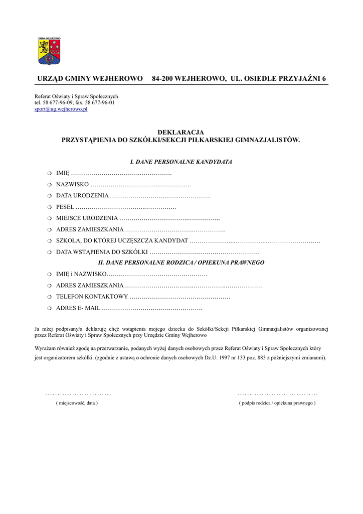 URZĄD GMINY WEJHEROWO 84-200 WEJHEROWO, UL. OSIEDLE PRZYJAŹNI 6 Referat Oświaty i Spraw Społecznych tel. 58 677-96-09, fax. 58 677-96-01 [email protected] DEKLARACJA PRZYSTĄPIENIA DO SZKÓŁKI/SEKCJI PIŁKARSKIEJ GIMNAZJALISTÓW. I. DANE PERSONALNE KANDYDATA IMIĘ …………………………….……………. NAZWISKO …………………………….……………. DATA URODZENIA …………………………….……………. PESEL …………………………….……………. MIEJSCE URODZENIA …………………………….……………. ADRES ZAMIESZKANIA …………………………….……………. SZKOŁA, DO KTÓREJ UCZĘSZCZA KANDYDAT ………………….…………….……………………… DATA WSTĄPIENIA DO SZKÓLKI ……………………………………………… II. DANE PERSONALNE RODZICA / OPIEKUNA PRAWNEGO IMIĘ i NAZWISKO…………………………….……………. ADRES ZAMIESZKANIA …………………………….…………….……………… TELEFON KONTAKTOWY …………………………….……………. ADRES E- MAIL …………………………….……………. Ja niżej podpisany/a deklaruję chęć wstąpienia mojego dziecka do Szkółki/Sekcji Piłkarskiej Gimnazjalistów organizowanej przez Referat Oświaty i Spraw Społecznych przy Urzędzie Gminy Wejherowo Wyrażam również zgodę na przetwarzanie, podanych wyżej danych osobowych przez Referat Oświaty i Spraw Społecznych który jest organizatorem szkółki. (zgodnie z ustawą o ochronie danych osobowych Dz.U. 1997 nr 133 poz. 883 z późniejszymi zmianami). ................... ........ ..................... ............ ( miejscowość, data ) ( podpis rodzica / opiekuna prawnego )