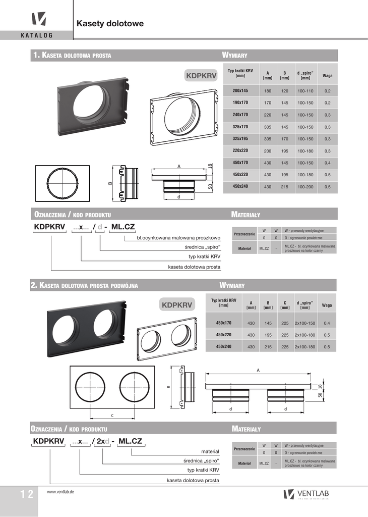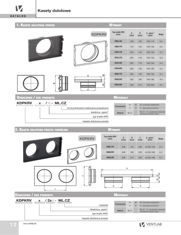 Kasety dolotowe katalog 1. Kaseta dolotowa prosta Wymiary Typ kratki KRV [mm] B KDPKRV 50 B 18 A A [mm] B [mm] d „spiro” [mm] Waga 200x145 180 120 100-110 0.2 190x170 170 145 100-150 0.2 240x170 220 145 100-150 0.3 325x170 305 145 100-150 0.3 325x195 305 170 100-150 0.3 220x220 200 195 100-180 0.3 450x170 430 145 100-150 0.4 450x220 430 195 100-180 0.5 450x240 430 215 100-200 0.5 d A KDPKRV 18 Oznaczenia / kod produktu Materiały ...x... / d - ML.CZ Przeznaczenie 50 bl.ocynkowana malowana proszkowo średnica „spiro” d Materiał W W O O O - ogrzewanie powietrzne - ML.CZ - bl. ocynkowana malowana proszkowo na kolor czarny ML.CZ W - przewody wentylacyjne typ kratki KRV B kaseta dolotowa prosta 2. Kaseta dolotowa prosta podwójna Wymiary Typ kratki KRV C [mm] A [mm] B [mm] C [mm] d „spiro” [mm] Waga 450x170 430 145 225 2x100-150 0.4 450x220 430 195 225 2x100-180 0.5 450x240 430 215 225 2x100-180 0.5 KDPKRV d B 50 18 A d C Wymiar Waga ewnętrzny A B C d "spiro" oła kratki [mm] [mm] [mm] [mm] [kg] 450x170 430 145 225 100-150 0.44 450x220 430 195 225 100-150 0.52 450x240 430 215 225 100-150 0.54 A B 50 18 [mm] d d C KDPKRV ...x... / 2xd - ML.CZ d 50 18 Oznaczenia / kod produktu M ateriały A d materiał Wymiar zewnętrzny średnica „spiro” A czoła kratki [mm] typ kratki KRV Przeznaczenie Materiał B [mm] W W W - przewody wentylacyjne O O O - ogrzewanie powietrzne ML.CZ - CML.CZ - bl. ocynkowana d "spiro" malowana proszkowo na kolor czarny Waga [mm] [mm] [kg] [mm] kaseta dolotowa 450x170 prosta 430 12 www.ventlab.de Wymiar 145 225 100-150 0.44 450x220 430 195 225 100-150 0.52 450x240 430 215 225 100-150 0.54 zewnętrzny A B C d "spiro" Waga czoła kratki [mm] [mm] [mm] [mm] [kg] [mm] Kasety dolotowe katalog 3. Kaseta dolotowa boczna Wymiary Typ kratki KRV[mm] B KDBKRV 180 d B A 50 A [mm] B [mm] d „spiro” [mm] Waga 200x145 180 120 100-110 0.6 190x170 170 145 100-150 0.6 240x170 220 145 100-150 0.7 325x170 305 145 100-150 0.9 325x195 305 170 100-150 1.0 220x220 200 195 100-180 0.8 450x170 430 145 100-150 1.4 450x220 430 195 100-180 1.4 450x240 430 215 100-200 1.5 A Oznaczenia / kod produktu Materiały ...x... / d - ML.CZ d 180 KDBKRV Przeznaczenie materiał średnica „spiro” Materiał W W O O O - ogrzewanie powietrzne - ML.CZ - bl. ocynkowana malowana proszkowo na kolor czarny ML.CZ W - przewody wentylacyjne typ kratki KRV 50 C 180 kaseta dolotowa boczna B 4. Kaseta dolotowa boczna podwójna Wymiary KDBKRV d Typ kratki KRV [mm] A [mm] B [mm] C [mm] D [mm] d „spiro” [mm] Waga 450x170 430 145 225 180 2x100-150 1.3 450x220 430 219 225 230 2x100-180 1.4 450x240 430 215 250 2x100-180 1.4 d A Wymiar zewnętrzny A B C d "spiro" Waga czoła kratki [mm] [mm] [mm] [mm] [kg] 450x170 430 145 225 100-150 1.30 450x220 430 195 225 100-150 1.40 450x240 430 215 225 100-150 1.45 180 [mm] C 225 C B B 180 D d d C 180 A Oznaczenia / kod produktu Materiały Oznaczenia / kod produktu Materiały d d A ...x... / 2xd - ML.CZ B KDBKRV Wymiar zewnętrzny A B czoła kratki [mm] [mm] [mm] materiał Wymiar 145 450x170 430 zewnętrzny Aśrednica „spiro” B 450x220 430 195 czoła kratki [mm] [mm] 450x240 typ430 kratki KRV215 [mm] d 145 430 kaseta dolotowa boczna 450x170 d A C C [mm] W W WWaga - przewody wentylacyjne O O O - ogrzewanie powietrzne d "spiro" [mm] Przeznaczenie [mm] [kg] 225 100-150 1.30 Waga ML.CZ - bl. ocynkowana malowana d "spiro"ML.CZ Materiał 225 100-150 1.40 proszkowo na kolor czarny 225 [mm] 100-150 [kg] 225 100-150 1.30 450x220 430 195 225 100-150 1.40 450x240 430 215 225 100-150 1.45 1.45 www.ventlab.de Wymiar ewnętrzny A B C d "spiro" Waga 13
