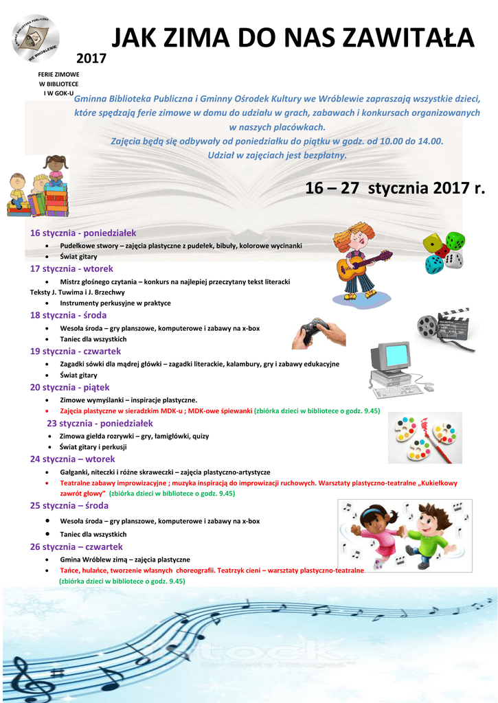 2017 JAK ZIMA DO NAS ZAWITAŁA FERIE ZIMOWE W BIBLIOTECE I W GOK-U Gminna Biblioteka Publiczna i Gminny Ośrodek Kultury we Wróblewie zapraszają wszystkie dzieci, które spędzają ferie zimowe w domu do udziału w grach, zabawach i konkursach organizowanych w naszych placówkach. Zajęcia będą się odbywały od poniedziałku do piątku w godz. od 10.00 do 14.00. Udział w zajęciach jest bezpłatny. 16 – 27 stycznia 2017 r. 16 stycznia - poniedziałek Pudełkowe stwory – zajęcia plastyczne z pudełek, bibuły, kolorowe wycinanki Świat gitary 17 stycznia - wtorek Mistrz głośnego czytania – konkurs na najlepiej przeczytany tekst literacki Teksty J. Tuwima i J. Brzechwy Instrumenty perkusyjne w praktyce 18 stycznia - środa Wesoła środa – gry planszowe, komputerowe i zabawy na x-box Taniec dla wszystkich 19 stycznia - czwartek Zagadki sówki dla mądrej główki – zagadki literackie, kalambury, gry i zabawy edukacyjne Świat gitary 20 stycznia - piątek Zimowe wymyślanki – inspiracje plastyczne. Zajęcia plastyczne w sieradzkim MDK-u ; MDK-owe śpiewanki (zbiórka dzieci w bibliotece o godz. 9.45) 23 stycznia - poniedziałek Zimowa giełda rozrywki – gry, łamigłówki, quizy Świat gitary i perkusji 24 stycznia – wtorek Gałganki, niteczki i różne skraweczki – zajęcia plastyczno-artystycze Teatralne zabawy improwizacyjne ; muzyka inspiracją do improwizacji ruchowych. Warsztaty plastyczno-teatralne „Kukiełkowy zawrót głowy” (zbiórka dzieci w bibliotece o godz. 9.45) 25 stycznia – środa Wesoła środa – gry planszowe, komputerowe i zabawy na x-box Taniec dla wszystkich 26 stycznia – czwartek Gmina Wróblew zimą – zajęcia plastyczne Tańce, hulańce, tworzenie własnych choreografii. Teatrzyk cieni – warsztaty plastyczno-teatralne (zbiórka dzieci w bibliotece o godz. 9.45) 27 stycznia - piątek Papierowe mozaiki – zajęcia plastyczne Taniec dla wszystkich