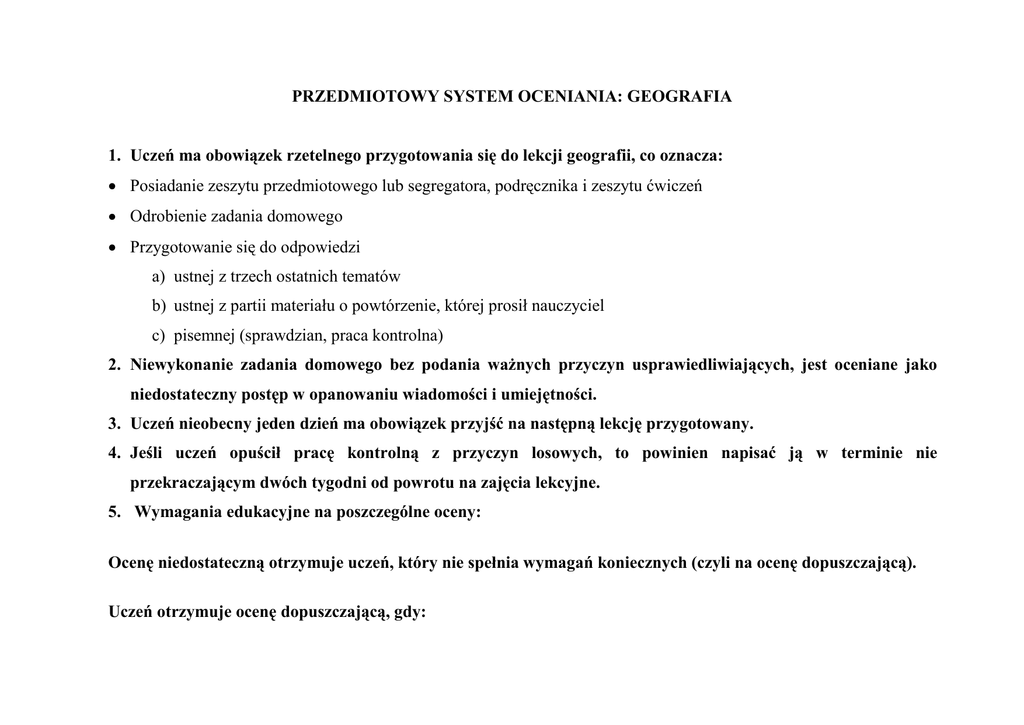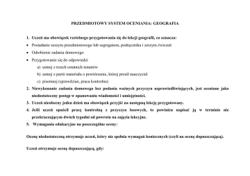 PRZEDMIOTOWY SYSTEM OCENIANIA: GEOGRAFIA 1. Uczeń ma obowiązek rzetelnego przygotowania się do lekcji geografii, co oznacza: Posiadanie zeszytu przedmiotowego lub segregatora, podręcznika i zeszytu ćwiczeń Odrobienie zadania domowego Przygotowanie się do odpowiedzi a) ustnej z trzech ostatnich tematów b) ustnej z partii materiału o powtórzenie, której prosił nauczyciel c) pisemnej (sprawdzian, praca kontrolna) 2. Niewykonanie zadania domowego bez podania ważnych przyczyn usprawiedliwiających, jest oceniane jako niedostateczny postęp w opanowaniu wiadomości i umiejętności. 3. Uczeń nieobecny jeden dzień ma obowiązek przyjść na następną lekcję przygotowany. 4. Jeśli uczeń opuścił pracę kontrolną z przyczyn losowych, to powinien napisać ją w terminie nie przekraczającym dwóch tygodni od powrotu na zajęcia lekcyjne. 5. Wymagania edukacyjne na poszczególne oceny: Ocenę niedostateczną otrzymuje uczeń, który nie spełnia wymagań koniecznych (czyli na ocenę dopuszczającą). Uczeń otrzymuje ocenę dopuszczającą, gdy: -uczeń posiada umiejętności potrzebne do świadomego udziału w zajęcia szkolnych, -zna i rozumie najprostsze, niewymagające modyfikacji i niezbędne w dalszym kształceniu, definicje i pojęcia, -wie gdzie i jak szukać rzetelnej wiedzy o przyrodzie, -wskazuje na mapie główne jednostki fizycznogeograficzne, -odczytuje współrzędne geograficzne dowolnych punktów na mapie i globusie Uczeń otrzymuje ocenę dostateczną, gdy: -obejmuje podstawowe wiadomości i umiejętności, które będąc stosunkowo łatwymi do opanowania są całkowicie niezbędne w dalszej nauce i bezpośrednio użyteczne w życiu codziennym, -wskazuje na mapie wybrane jednostki fizycznogeograficzne, -odczytuje wiadomości zawarte na mapach, wykresach, tabelach i tablicach -zna i rozumie proste procesy, zjawiska i zależności zachodzące w przyrodzie, w relacji człowiek-środowisko, Uczeń otrzymuje ocenę dobrą, gdy: -obejmuje wiadomości i umiejętności umiarkowanie trudne do opanowania, przydatne, ale nie niezbędne w dalszej nauce, -Potrafi znaleźć potrzebną informację, -posługuje się mapą i planem do lokalizowania obiektów i zjawisk, -zna i rozumie złożone procesy, zjawiska i zależności zachodzące w przyrodzie, w relacji człowiek-środowisko, Uczeń otrzymuje ocenę bardzo dobrą, gdy: -obejmuje wiadomości i umiejętności wyspecjalizowane. Stosunkowo trudne do opanowania, ale rozwijające myślenie twórcze, -potrafi interpretować tabele, wykresy, tablice, mapy, -samodzielnie wykonuje wykresy, tabele, mapy, Wyjaśnia przyczyny i konsekwencje zjawisk występujących w przyrodzie, w relacji człowiek-środowisko. Uczeń otrzymuje ocenę celującą, gdy: -wykazuje się wiedzą i umiejętnościami wykraczającymi poza program nauczania w danej klasie -uzyskuje ze sprawdzianów i prac kontrolnych maksymalną ilość punktów i odpowiada na pytania dodatkowe. -rozwija swoje umiejętności, osiąga sukcesy w olimpiadach geograficznych na szczeblu okręgowym lub krajowym wykazuje się wiedza na poziomie ponad ocenę bardzo dobrą..