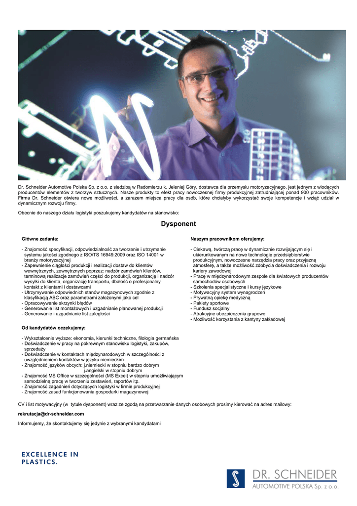 Dr. Schneider Automotive Polska Sp. z o.o. z siedzibą w Radomierzu k. Jeleniej Góry, dostawca dla przemysłu motoryzacyjnego, jest jednym z wiodących producentów elementów z tworzyw sztucznych. Nasze produkty to efekt pracy nowoczesnej firmy produkcyjnej zatrudniającej ponad 900 pracowników. Firma Dr. Schneider otwiera nowe możliwości, a zarazem miejsca pracy dla osób, które chciałyby wykorzystać swoje kompetencje i wziąć udział w dynamicznym rozwoju firmy. Obecnie do naszego działu logistyki poszukujemy kandydatów na stanowisko: Dysponent Główne zadania: Naszym pracownikom oferujemy: - Znajomość specyfikacji, odpowiedzialność za tworzenie i utrzymanie systemu jakości zgodnego z ISO/TS 16949:2009 oraz ISO 14001 w branży motoryzacyjnej - Zapewnienie ciągłości produkcji i realizacji dostaw do klientów wewnętrznych, zewnętrznych poprzez: nadzór zamówień klientów, terminową realizacje zamówień części do produkcji, organizację i nadzór wysyłki do klienta, organizację transportu, dbałość o profesjonalny kontakt z klientami i dostawcami - Utrzymywanie odpowiednich stanów magazynowych zgodnie z klasyfikacją ABC oraz parametrami założonymi jako cel - Opracowywanie skrzynki błędów - Generowanie list montażowych i uzgadnianie planowanej produkcji - Generowanie i uzgadnianie list zaległości - Ciekawą, twórczą pracę w dynamicznie rozwijającym się i ukierunkowanym na nowe technologie przedsiębiorstwie produkcyjnym, nowoczesne narzędzia pracy oraz przyjazną atmosferę, a także możliwość zdobycia doświadczenia i rozwoju kariery zawodowej - Pracę w międzynarodowym zespole dla światowych producentów samochodów osobowych - Szkolenia specjalistyczne i kursy językowe - Motywacyjny system wynagrodzeń - Prywatną opiekę medyczną - Pakiety sportowe - Fundusz socjalny - Atrakcyjne ubezpieczenia grupowe - Możliwość korzystania z kantyny zakładowej Od kandydatów oczekujemy: - Wykształcenie wyższe: ekonomia, kierunki techniczne, filologia germańska - Doświadczenie w pracy na pokrewnym stanowisku logistyki, zakupów, sprzedaży - Doświadczenie w kontaktach międzynarodowych w szczególności z uwzględnieniem kontaktów w języku niemieckim - Znajomość języków obcych: j.niemiecki w stopniu bardzo dobrym j.angielski w stopniu dobrym - Znajomość MS Office w szczególności (MS Excel) w stopniu umożliwiającym samodzielną pracę w tworzeniu zestawień, raportów itp. - Znajomość zagadnień dotyczących logistyki w firmie produkcyjnej - Znajomość zasad funkcjonowania gospodarki magazynowej CV i list motywacyjny (w tytule dysponent) wraz ze zgodą na przetwarzanie danych osobowych prosimy kierować na adres mailowy: [email protected] Informujemy, że skontaktujemy się jedynie z wybranymi kandydatami