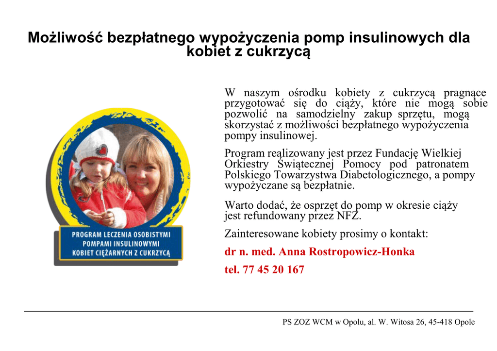 Możliwość bezpłatnego wypożyczenia pomp insulinowych dla kobiet z cukrzycą W naszym ośrodku kobiety z cukrzycą pragnące przygotować się do ciąży, które nie mogą sobie pozwolić na samodzielny zakup sprzętu, mogą skorzystać z możliwości bezpłatnego wypożyczenia pompy insulinowej. Program realizowany jest przez Fundację Wielkiej Orkiestry Świątecznej Pomocy pod patronatem Polskiego Towarzystwa Diabetologicznego, a pompy wypożyczane są bezpłatnie. Warto dodać, że osprzęt do pomp w okresie ciąży jest refundowany przez NFZ. Zainteresowane kobiety prosimy o kontakt: dr n. med. Anna Rostropowicz-Honka tel. 77 45 20 167 PS ZOZ WCM w Opolu, al. W. Witosa 26, 45-418 Opole