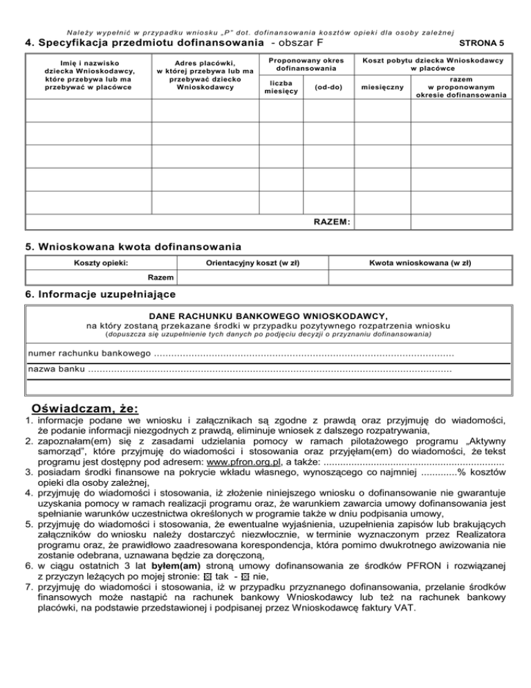 N a l e ży w y p e ł n i ć w p r zy p a d k u w n i o s k u „ P ” d o t . d o f i n a n s o w a n i a k o s zt ó w o p i e k i d l a o s o b y za l e żn e j 4. Specyfikacja przedmiotu dofinansowania - obszar F Imię i nazwisko dziecka Wnioskodawcy, które przebywa lub ma przebywać w placówce Adres placówki, w której przebywa lub ma przebywać dziecko Wnioskodawcy Proponowany okres dofinansowania liczba miesięcy (od-do) STRONA 5 Koszt pobytu dziecka Wnioskodawcy w placówce miesięczny razem w proponowanym okresie dofinansowania RAZEM: 5. Wnioskowana kwota dofinansowania Koszty opieki: Orientacyjny koszt (w zł) Kwota wnioskowana (w zł) Razem 6. Informacje uzupełniające DANE RACHUNKU BANKOWEGO WNIOSKODAWCY, na który zostaną przekazane środki w przypadku pozytywnego rozpatrzenia wniosku (dopuszcza się uzupełnienie tych danych po podjęciu decyzji o przyznaniu dofinansowania) numer rachunku bankowego ........................................................................................................ nazwa banku .............................................................................................................................. Oświadczam, że: 1. informacje podane we wniosku i załącznikach są zgodne z prawdą oraz przyjmuję do wiadomości, że podanie informacji niezgodnych z prawdą, eliminuje wniosek z dalszego rozpatrywania, 2. zapoznałam(em) się z zasadami udzielania pomocy w ramach pilotażowego programu „Aktywny samorząd”, które przyjmuję do wiadomości i stosowania oraz przyjęłam(em) do wiadomości, że tekst programu jest dostępny pod adresem: www.pfron.org.pl, a także: ................................................................. 3. posiadam środki finansowe na pokrycie wkładu własnego, wynoszącego co najmniej .............% kosztów opieki dla osoby zależnej, 4. przyjmuję do wiadomości i stosowania, iż złożenie niniejszego wniosku o dofinansowanie nie gwarantuje uzyskania pomocy w ramach realizacji programu oraz, że warunkiem zawarcia umowy dofinansowania jest spełnianie warunków uczestnictwa określonych w programie także w dniu podpisania umowy, 5. przyjmuję do wiadomości i stosowania, że ewentualne wyjaśnienia, uzupełnienia zapisów lub brakujących załączników do wniosku należy dostarczyć niezwłocznie, w terminie wyznaczonym przez Realizatora programu oraz, że prawidłowo zaadresowana korespondencja, która pomimo dwukrotnego awizowania nie zostanie odebrana, uznawana będzie za doręczoną, 6. w ciągu ostatnich 3 lat byłem(am) stroną umowy dofinansowania ze środków PFRON i rozwiązanej z przyczyn leżących po mojej stronie: tak - nie, 7. przyjmuję do wiadomości i stosowania, iż w przypadku przyznanego dofinansowania, przelanie środków finansowych może nastąpić na rachunek bankowy Wnioskodawcy lub też na rachunek bankowy placówki, na podstawie przedstawionej i podpisanej przez Wnioskodawcę faktury VAT. ST RO NA 6 Wnioskodawca nie mogący pisać, lecz mogący czytać, zamiast podpisu może uczynić na dokumencie tuszowy odcisk palca, a obok tego odcisku inna osoba wypisze jej imię i nazwisko umieszczając swój podpis; zamiast Wnioskodawcy może także podpisać się inna osoba, z tym że jej podpis musi być poświadczony przez notariusza lub wójta (burmistrza, prezydenta miasta), starostę lub marszałka województwa z zaznaczeniem, że podpis został złożony na życzenie nie mogącego pisać, lecz mogącego czytać. ...................................... dnia ..... /....... /20..... r. .................................... podpis Wnioskodawcy 7. Załączniki: wymagane do wniosku oraz dodatkowe (wiersze 6-12) WYPEŁNIA WYŁĄCZNIE REALIZATOR PROGRAMU (należy zaznaczyć właściwe) Nazwa załącznika Dołączono do wniosku 1. Kserokopia aktualnego orzeczenia o znacznym lub umiarkowanym stopniu niepełnosprawności (lub orzeczenia równoważnego) 2. Oświadczenie o wysokości średnich miesięcznych dochodów brutto w przeliczeniu na jednego członka rodziny pozostającego we wspólnym gospodarstwie domowym (sporządzone wg wzoru określonego w załączniku nr 1 do wniosku) 3. Oświadczenia o wyrażeniu zgody na przetwarzanie danych osobowych przez Realizatora programu i PFRON (sporządzone wg wzoru określonego w załączniku nr 3 do formularza wniosku) - wypełnione przez Wnioskodawcę oraz inne osoby posiadające zdolność do czynności prawnych, których dane osobowe zostały przekazane do Realizatora programu 4. Kserokopia/e aktu urodzenia dziecka/dzieci, sztuk ........ 5. Kserokopia dokumentu/ów podopiecznym/podopiecznymi – o ile dotyczy 6. Inne załączniki (należy wymienić): 7. 8. 9. 10. 11. 12. stanowiących opiekę prawną nad Uzupełniono Data uzupełnienia /uwagi