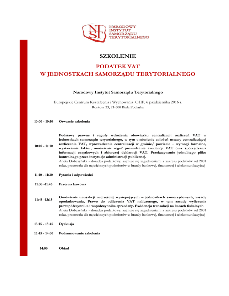 SZKOLENIE PODATEK VAT W JEDNOSTKACH SAMORZĄDU TERYTORIALNEGO Narodowy Instytut Samorządu Terytorialnego Europejskie Centrum Kształcenia i Wychowania OHP, 6 października 2016 r. Roskosz 23, 21-500 Biała Podlaska 10:00 - 10:10 10:10 - 11:10 Otwarcie szkolenia Podstawy prawne i reguły wdrożenia obowiązku centralizacji rozliczeń VAT w jednostkach samorządu terytorialnego, w tym omówienie założeń ustawy centralizującej rozliczenia VAT, wprowadzenie centralizacji w gminie/ powiecie – wymogi formalne, wystawianie faktur, omówienie reguł prowadzenia ewidencji VAT oraz sporządzania informacji cząstkowych i zbiorczej deklaracji VAT. Przekazywanie jednolitego pliku kontrolnego przez instytucje administracji publicznej. Aneta Dobczyńska - doradca podatkowy, zajmuje się zagadnieniami z zakresu podatków od 2001 roku, pracowała dla największych podmiotów w branży bankowej, finansowej i telekomunikacyjnej 11:10 - 11:30 Pytania i odpowiedzi 11:30 -11:45 Przerwa kawowa 11:45 -13:15 Omówienie transakcji najczęściej występujących w jednostkach samorządowych, zasady opodatkowania, Prawo do odliczenia VAT naliczonego, w tym zasady wyliczenia prewspółczynnika i współczynnika sprzedaży. Ewidencja transakcji na kasach fiskalnych Aneta Dobczyńska - doradca podatkowy, zajmuje się zagadnieniami z zakresu podatków od 2001 roku, pracowała dla największych podmiotów w branży bankowej, finansowej i telekomunikacyjnej 13:15 - 13:45 Dyskusja 13:45 - 14:00 Podsumowanie szkolenia 14:00 Obiad