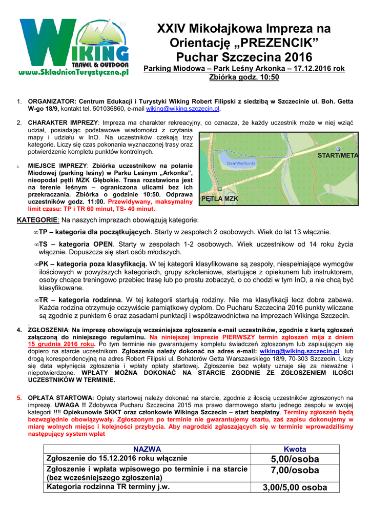 XXIV Mikołajkowa Impreza na Orientację „PREZENCIK” Puchar Szczecina 2016 Parking Miodowa – Park Leśny Arkonka – 17.12.2016 rok Zbiórka godz. 10:50 1. ORGANIZATOR: Centrum Edukacji i Turystyki Wiking Robert Filipski z siedzibą w Szczecinie ul. Boh. Getta W-go 18/9, kontakt tel. 501036860, e-mail [email protected], 2. CHARAKTER IMPREZY: Impreza ma charakter rekreacyjny, co oznacza, że każdy uczestnik może w niej wziąć udział, posiadając podstawowe wiadomości z czytania mapy i udziału w InO. Na uczestników czekają trzy kategorie. Liczy się czas pokonania wyznaczonej trasy oraz potwierdzenie kompletu punktów kontrolnych. 3. MIEJSCE IMPREZY: Zbiórka uczestnikow na polanie Miodowej (parking leśny) w Parku Leśnym „Arkonka”, nieopodal pętli MZK Głębokie. Trasa rozstawiona jest na terenie leśnym – ograniczona ulicami bez ich przekraczania. Zbiórka o godzinie 10:50. Odprawa uczestników godz. 11:00. Przewidywany, maksymalny limit czasu: TP i TR 60 minut, TS- 40 minut. KATEGORIE: Na naszych imprezach obowiązują kategorie: • TP – kategoria dla początkujących. Starty w zespołach 2 osobowych. Wiek do lat 13 włącznie. • TS – kategoria OPEN. Starty w zespołach 1-2 osobowych. Wiek uczestnikow od 14 roku życia włącznie. Dopuszcza się start osób młodszych. • PK – kategoria poza klasyfikacją. W tej kategorii klasyfikowane są zespoły, niespełniające wymogów ilościowych w powyższych kategoriach, grupy szkoleniowe, startujące z opiekunem lub instruktorem, osoby chcące treningowo przebiec trasę lub po prostu zobaczyć, o co chodzi w tym InO, a nie chcą być klasyfikowane. • TR – kategoria rodzinna. W tej kategorii startują rodziny. Nie ma klasyfikacji lecz dobra zabawa. Każda rodzina otrzymuje oczywiście pamiątkowy dyplom. Do Pucharu Szczecina 2016 punkty wliczane są zgodnie z punktem 6 oraz zasadami punktacji i współzawodnictwa na imprezach Wikinga Szczecin. • 4. ZGŁOSZENIA: Na imprezę obowiązują wcześniejsze zgłoszenia e-mail uczestników, zgodnie z kartą zgłoszeń załączoną do niniejszego regulaminu. Na niniejszej imprezie PIERWSZY termin zgłoszeń mija z dniem 15 grudnia 2016 roku. Po tym terminie nie gwarantujemy kompletu świadczeń zgłoszonym lub zapisującym się dopiero na starcie uczestnikom. Zgłoszenia należy dokonać na adres e-mail: [email protected] lub drogą korespondencyjną na adres Robert Filipski ul. Bohaterów Getta Warszawskiego 18/9, 70-303 Szczecin. Liczy się data wpłynięcia zgłoszenia i wpłaty opłaty startowej. Zgłoszenie bez wpłaty uznaje się za nieważne i niepotwierdzone. WPŁATY MOŻNA DOKONAĆ NA STARCIE ZGODNIE ZE ZGŁOSZENIEM ILOŚCI UCZESTNIKÓW W TERMINIE. 5. OPŁATA STARTOWA: Opłaty startowej należy dokonać na starcie, zgodnie z iloscią uczestników zgłoszonych na imprezę. UWAGA !! Zdobywca Pucharu Szczecina 2015 ma prawo darmowego startu jednego zespołu w swojej kategorii !!!! Opiekunowie SKKT oraz członkowie Wikinga Szczecin – start bezpłatny. Terminy zgłoszeń będą bezwzględnie obowiązywały. Zgłoszonym po terminie nie gwarantujemy startu, zaś zapisu dokonujemy w miarę wolnych miejsc i kolejności przybycia. Aby nagrodzić zgłaszających się w terminie wprowadziliśmy następujący system wpłat NAZWA Zgłoszenie do 15.12.2016 roku włącznie Zgłoszenie i wpłata wpisowego po terminie i na starcie (bez wcześniejszego zgłoszenia) Kategoria rodzinna TR terminy j.w. Kwota 5,00/osoba 7,00/osoba 3,00/5,00 osoba IMPREZA SZKOLENIOWA DLA CHĘTNYCH, START GODZ. 13:00. ZAMÓWIENIE INSTRUKTORA DO PROWADZENIA SZKOLENIA W ZAKRESIE UDZIAŁU W IMPREZACH NA ORIENTACJĘ W RAMACH KATEGORII PK WYNOSI ODPOWIEDNIO: • Przy grupie do 15 osób 150,00 • Przy grupie powyżej 15 osób, 9,00 za osobę Uczestnicy nie ponoszą żadnych dodatkowych opłat zaś świadczenia przysługują na takich samach zasadach jak innych uczestników. Zgłoszenia szkolenia należy dokonać minimum tydzien przed wybraną imprezą, abyśmy bez problemu zarezerwowali i zatrudnili prowadzącego zajęcia. 6. ŚWIADCZENIA: Wszystkim uczestnikom, którzy zgłosili się i dokonali wpłaty w pierwszym terminie gwarantujemy udział w imprezie oraz komplet świadczeń na niej przewidzianych. Dla zgłoszonych w drugim terminie gwarantujemy udział w imprezie, jednak świadczenia wydajemy do wyczerpania zasobów według kolejności zgłoszenia. Dla zgłoszonych w dniu imprezy nie garantujemy udziału w imprezie jak i świadczeń. Na imprezie przewidujemy świadczenia: • • • • • • Mapy dla wszystkich uczestników Komplet materiałów startowych dla zespołu Gwarantowane kubki pamiątkowe i medale dla pierwszych trzech miejsc w kategorii TP i TS Dyplomy rodzinne w kategorii TR Punkty do rywalizacji Pucharu Szczecina 2016 Punkty do odznaki imprez na orientację PTTK – 1 punkt. 7. POSTANOWIENIA KOŃCOWE • WSZYSCY UCZESTNICY MUSZĄ POSIADAĆ DŁUGOPIS DO WYPEŁNIANIA KARTY STARTOWEJ ! • Osobom zgłoszonym, a nieobecnym na imprezie nie przysługuje prawo do zwrotu wpisowego. • Impreza odbędzie się bez względu na pogodę. • Organizator nie odpowiada za straty poniesione i spowodowane przez uczestników. • Uczestnicy ubezpieczają się we własnym zakresie. • Osoby niepełnoletnie uczestniczą w imprezie pod opieką opiekunów lub za pisemną zgodą rodziców/opiekunów prawnych. • Uczestnicy poprzez udział w imprezie, wyrażają zgodę na przetwarzanie danych osobowych związanych z obsługą imprezy, umieszczenie danych osobowych w wynikach imprezy oraz publikację wizerunku w materiałach promocyjnych klubu związanych z imprezami na orientację. • Na imprezie obowiązuja zasady punktacji opracowane przez Wikinga Szczecin a udostępnione na stronie internetowej – znajomość obowiązkowa. • Wyniki rywalizacji będą podane w internecie do 3 dni po zakończeniu imprezy. Przez 3 dni można zgłaszać wszelkie poprawki oraz protesty w sprawie wyników. • Ostat