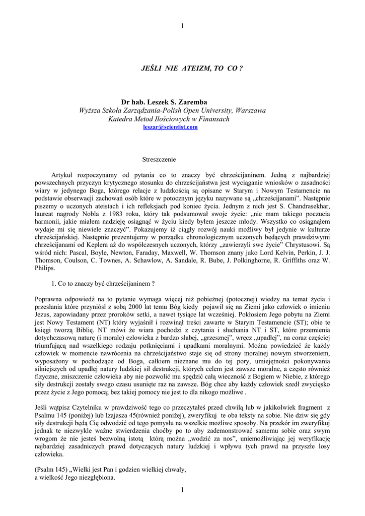 1 JEŚLI NIE ATEIZM, TO CO ? Dr hab. Leszek S. Zaremba WyŜsza Szkoła Zarządzania-Polish Open University, Warszawa Katedra Metod Ilościowych w Finansach [email protected] Streszczenie Artykuł rozpoczynamy od pytania co to znaczy być chrześcijaninem. Jedną z najbardziej powszechnych przyczyn krytycznego stosunku do chrześcijaństwa jest wyciąganie wniosków o zasadności wiary w jedynego Boga, którego relacje z ludzkością są opisane w Starym i Nowym Testamencie na podstawie obserwacji zachowań osób które w potocznym języku nazywane są „chrześcijanami”. Następnie piszemy o uczonych ateistach i ich refleksjach pod koniec Ŝycia. Jednym z nich jest S. Chandrasekhar, laureat nagrody Nobla z 1983 roku, który tak podsumował swoje Ŝycie: „nie mam takiego poczucia harmonii, jakie miałem nadzieję osiągnąć w Ŝyciu kiedy byłem jeszcze młody. Wszystko co osiągnąłem wydaje mi się niewiele znaczyć”. Pokazujemy iŜ ciągły rozwój nauki moŜliwy był jedynie w kulturze chrześcijańskiej. Następnie prezentujemy w porządku chronologicznym uczonych będących prawdziwymi chrześcijanami od Keplera aŜ do współczesnych uczonych, którzy „zawierzyli swe Ŝycie” Chrystusowi. Są wśród nich: Pascal, Boyle, Newton, Faraday, Maxwell, W. Thomson znany jako Lord Kelvin, Perkin, J. J. Thomson, Coulson, C. Townes, A. Schawlow, A. Sandale, R. Bube, J. Polkinghorne, R. Griffiths oraz W. Philips. 1. Co to znaczy być chrześcijaninem ? Poprawna odpowiedź na to pytanie wymaga więcej niŜ pobieŜnej (potocznej) wiedzy na temat Ŝycia i przesłania które przyniósł z sobą 2000 lat temu Bóg kiedy pojawił się na Ziemi jako człowiek o imieniu Jezus, zapowiadany przez proroków setki, a nawet tysiące lat wcześniej. Pokłosiem Jego pobytu na Ziemi jest Nowy Testament (NT) który wyjaśnił i rozwinął treści zawarte w Starym Testamencie (ST); obie te księgi tworzą Biblię. NT mówi Ŝe wiara pochodzi z czytania i słuchania NT i ST, które przemienia dotychczasową naturę (i morale) człowieka z bardzo słabej, „grzesznej”, wręcz „upadłej”, na coraz częściej triumfującą nad wszelkiego rodzaju potknięciami i upadkami moralnymi. MoŜna powiedzieć Ŝe kaŜdy człowiek w momencie nawrócenia na chrześcijaństwo staje się od strony moralnej nowym stworzeniem, wyposaŜony w pochodzące od Boga, całkiem nieznane mu do tej pory, umiejętności pokonywania silniejszych od upadłej natury ludzkiej sił destrukcji, których celem jest zawsze moralne, a często równieŜ fizyczne, zniszczenie człowieka aby nie pozwolić mu spędzić całą wieczność z Bogiem w Niebie, z którego siły destrukcji zostały swego czasu usunięte raz na zawsze. Bóg chce aby kaŜdy człowiek szedł zwycięsko przez Ŝycie z Jego pomocą; bez takiej pomocy nie jest to dla nikogo moŜliwe . Jeśli wątpisz Czytelniku w prawdziwość tego co przeczytałeś przed chwilą lub w jakikolwiek fragment z Psalmu 145 (poniŜej) lub Izajasza 45(równieŜ poniŜej), zweryfikuj te oba teksty na sobie. Nie dziw się gdy siły destrukcji będą Cię odwodzić od tego pomysłu na wszelkie moŜliwe sposoby. Na przekór im zweryfikuj jednak te niezwykle waŜne stwierdzenia choćby po to aby zademonstrować samemu sobie oraz swym wrogom Ŝe nie jesteś bezwolną istotą którą moŜna „wodzić za nos”, uniemoŜliwiając jej weryfikację najbardziej zasadniczych prawd dotyczących natury ludzkiej i wpływu tych prawd na przyszłe losy człowieka. (Psalm 145) „Wielki jest Pan i godzien wielkiej chwały, a wielkość Jego niezgłębiona. 1 2 Pan jest łagodny i miłosierny, nieskory do gniewu i bardzo łaskawy. Pan jest dobry dla wszystkich, a Jego miłosierdzie nad wszystkim, co stworzył. Pan jest sprawiedliwy na wszystkich swych drogach i łaskawy we wszystkich swoich dziełach. Pan jest blisko wszystkich, którzy Go wzywają, wszystkich wzywających Go szczerze.” (Izajasz 45) „Ja jestem Pan i nie ma innego. Ja tworzę światło i stwarzam ciemności, sprawiam pomyślność i stwarzam niedolę. Bóg sprawiedliwy i zbawiający nie istnieje poza mną. Nawróćcie się do mnie by się zbawić wszystkie krańce świata, bo ja jestem Bogiem i nikt inny. Przede mną zegnie się wszelkie kolano, wszelki język na mnie przysięgać będzie, mówiąc: Jedynie u Pana jest sprawiedliwość i moc. Do niego przyjdą zawstydzeni wszyscy , którzy się na niego gniewali”. O prawdziwości powyŜszych stwierdzeń przekonali się wybitni uczeni których nazwiska wspomnieliśmy powyŜej. Oprócz nich, o prawdziwości w/w słów przekonać się moŜe kaŜdy człowiek, bez względu na wykształcenie i środowisko w jakim się wychowywał. O tym jak to zrobić opisuje w swych ksiąŜkach 68letnia dziś kobieta Joyce Meyer z St. Louis (Missouri, USA), której Ŝycie zaczęło się fatalnie gdyŜ od 3-go do 18-go roku Ŝycia była molestowana seksualnie przez swego ojca będącego, jak łatwo się domyśleć, bezwolnym narzędziem w rękach sił destrukcji. Z tego co pisze o sobie nie wynika aby uzyskała biznesowe wykształcenie z Harvardu lub nawet jakiejkolwiek innej uczelni. Niemniej jednak, od ponad 20 lat, mając własną firmę, odnosi co miesiąc wielki sukces finansowy uzyskując przychody kilku milionów dolarów, zaś w skali roku blisko 100 mln dolarów, co umoŜliwia jej m. in. dokarrmianie 600 000 dzieci w róŜnych rejonach świata. W ksiąŜce „Piękno z Popiołów” (Compassion, 2009 r.) pani Meyer wyczerpująco opisuje w jaki sposób zawierzenie Ŝycia Chrystusowi zapewniło jej (a) ciągły wzrost duchowy (dzięki któremu wyeliminowała wszystkie swe dotychczasowe kompleksy i słabości) oraz (b) niesamowite powodzenie biznesu do którego, jak pisze, powołał ją sam Bóg. Ta sama modlitwa pani Meyer o pieniądze która 20-30 lat wcześniej powodowała przypływ gotówki w wysokości $100, ratując jej bardzo skromny wtedy budŜet domowy, teraz wystarcza na wpływy rzędu $ 