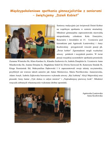 Międzypokoleniowe spotkania gimnazjalistów z seniorami – świętujemy „Dzień Kobiet” Seniorzy tradycyjnie już świętowali Dzień Kobiet na wspólnym spotkaniu w remizie strażackiej. Młodzież gimnazjalna zaprezentowała niezwykłą niespodziankę członkom Koła Rencistów i Inwalidów nr 15. Emerytów, Uczniowie pod kierunkiem pań Agnieszki Łuniewskiej i Anny Kozłowskiej przygotowali wieczór poezji ph. „Świat kobiet” Zgromadzeni mogli wysłuchać utwory polskich i rosyjskich poetów. W świat poezji rosyjskiej uczestników spotkania przeniosły Zuzanna Winnicka IIe, Klara Kardasz Ie, Klaudia Zachowicz Ie, Izabela Żmujdzin Ie. Uczniowie Anna Miastkowska IIe, Joanna Dziejma Ie, Magdalena Sokół Id, Elwira Szewczul Ib, Katarzyna Smalak Ib, Kinga Siemieniuk IId, Maksymilian Dąbrowski I b zaprezentowali swoje talenty recytatorskie, przybliżyli oni wiersze takich autorów jak Adam Mickiewicz, Maria Pawlikowska- Jasnorzewska, Adam Asnyk. Izabela Zajkowska brawurowo wykonała utwory „Być kobietą” Alicji Majewskiej oraz piosenki Anny Jantar „Tyle słońca w całym mieście” i „Najtrudniejszy pierwszy krok”. Młodzież wręczyła zebranych własnoręcznie wykonane drobne upominki. Agnieszka Łuniewska Anna Kozłowska