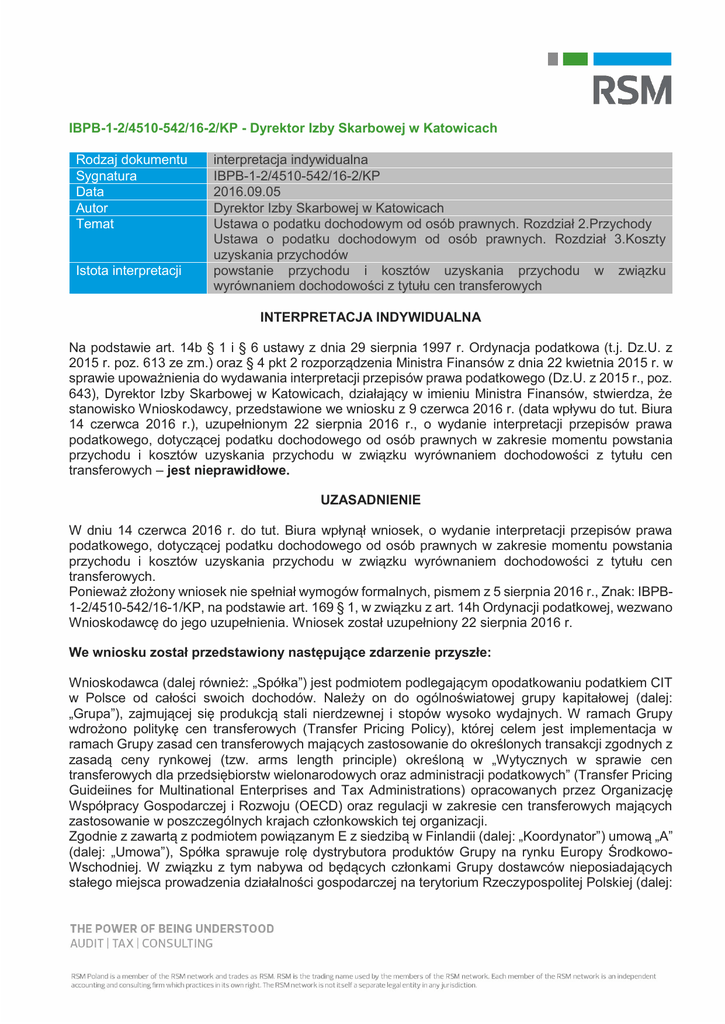 IBPB-1-2/4510-542/16-2/KP - Dyrektor Izby Skarbowej w Katowicach Rodzaj dokumentu Sygnatura Data Autor Temat Istota interpretacji interpretacja indywidualna IBPB-1-2/4510-542/16-2/KP 2016.09.05 Dyrektor Izby Skarbowej w Katowicach Ustawa o podatku dochodowym od osób prawnych. Rozdział 2.Przychody Ustawa o podatku dochodowym od osób prawnych. Rozdział 3.Koszty uzyskania przychodów powstanie przychodu i kosztów uzyskania przychodu w związku wyrównaniem dochodowości z tytułu cen transferowych INTERPRETACJA INDYWIDUALNA Na podstawie art. 14b § 1 i § 6 ustawy z dnia 29 sierpnia 1997 r. Ordynacja podatkowa (t.j. Dz.U. z 2015 r. poz. 613 ze zm.) oraz § 4 pkt 2 rozporządzenia Ministra Finansów z dnia 22 kwietnia 2015 r. w sprawie upoważnienia do wydawania interpretacji przepisów prawa podatkowego (Dz.U. z 2015 r., poz. 643), Dyrektor Izby Skarbowej w Katowicach, działający w imieniu Ministra Finansów, stwierdza, że stanowisko Wnioskodawcy, przedstawione we wniosku z 9 czerwca 2016 r. (data wpływu do tut. Biura 14 czerwca 2016 r.), uzupełnionym 22 sierpnia 2016 r., o wydanie interpretacji przepisów prawa podatkowego, dotyczącej podatku dochodowego od osób prawnych w zakresie momentu powstania przychodu i kosztów uzyskania przychodu w związku wyrównaniem dochodowości z tytułu cen transferowych – jest nieprawidłowe. UZASADNIENIE W dniu 14 czerwca 2016 r. do tut. Biura wpłynął wniosek, o wydanie interpretacji przepisów prawa podatkowego, dotyczącej podatku dochodowego od osób prawnych w zakresie momentu powstania przychodu i kosztów uzyskania przychodu w związku wyrównaniem dochodowości z tytułu cen transferowych. Ponieważ złożony wniosek nie spełniał wymogów formalnych, pismem z 5 sierpnia 2016 r., Znak: IBPB1-2/4510-542/16-1/KP, na podstawie art. 169 § 1, w związku z art. 14h Ordynacji podatkowej, wezwano Wnioskodawcę do jego uzupełnienia. Wniosek został uzupełniony 22 sierpnia 2016 r. We wniosku został przedstawiony następujące zdarzenie przyszłe: Wnioskodawca (dalej również: „Spółka”) jest podmiotem podlegającym opodatkowaniu podatkiem CIT w Polsce od całości swoich dochodów. Należy on do ogólnoświatowej grupy kapitałowej (dalej: „Grupa”), zajmującej się produkcją stali nierdzewnej i stopów wysoko wydajnych. W ramach Grupy wdrożono politykę cen transferowych (Transfer Pricing Policy), której celem jest implementacja w ramach Grupy zasad cen transferowych mających zastosowanie do określonych transakcji zgodnych z zasadą ceny rynkowej (tzw. arms length principle) określoną w „Wytycznych w sprawie cen transferowych dla przedsiębiorstw wielonarodowych oraz administracji podatkowych” (Transfer Pricing Guideiines for Multinational Enterprises and Tax Administrations) opracowanych przez Organizację Współpracy Gospodarczej i Rozwoju (OECD) oraz regulacji w zakresie cen transferowych mających zastosowanie w poszczególnych krajach członkowskich tej organizacji. Zgodnie z zawartą z podmiotem powiązanym E z siedzibą w Finlandii (dalej: „Koordynator”) umową „A” (dalej: „Umowa”), Spółka sprawuje rolę dystrybutora produktów Grupy na rynku Europy ŚrodkowoWschodniej. W związku z tym nabywa od będących członkami Grupy dostawców nieposiadających stałego miejsca prowadzenia działalności gospodarczej na terytorium Rzeczypospolitej Polskiej (dalej: „Dostawcy”) produkty, które następnie odsprzedaje swoim kontrahentom (co do zasady, będącymi podmiotami nienależącymi do Grupy; zdarza się jednak, że sprzedaż dokonywana jest również na rzecz podmiotów z Grupy) na obsługiwanych przez siebie rynkach. Koordynator nie jest jednym z Dostawców. W praktyce niewielką część produktów Spółka nabywa również od podmiotów niepowiązanych (w 2015 r. było to 5,5 % ogółu zakupów) (dalej również: „Dostawcy”). Zakup od podmiotów niepowiązanych jest realizowany wyjątkowo, gdy podmioty z Grupy nie są w stanie zrealizować zapotrzebowania Spółki na określone produkty. Zgodnie z warunkami Umowy Spółka jest zobowiązana do utrzymywania zasobów produktów na określonym poziomie i ich dalszej odsprzedaży oraz do działań marketingowych i realizacji usług serwisowych. Zakup przedmiotowych produktów będzie stanowić dla Spółki wewnątrzwspólnotowe nabycie towarów, import towarów lub dostawę o charakterze krajowym. Koszty nabycia przedmiotowych produktów stanowią dla Spółki koszty podatkowe bezpośrednio związane z przychodami osiąganymi z tytułu ich sprzedaży i są rozpoznawane dla celów podatkowych w momencie wygenerowania tych przychodów. Spółka, stosownie do obowiązującej w Grupie polityki cen transferowych, na skutek prowadzonej działalności powinna osiągać określony poziom dochodowości na poziomie rynkowym. Zgodnie z Umową, zakładany zysk Spółki ze sprzedaży przedmiotowych produktów określony został na rynkowym poziomie EBIT 1,75%. W trakcie danego roku może się zdarzyć, że rzeczywiście realizowany przez Spółkę wynik na działalności dystrybucyjnej będzie odbiegać od przyjętych w Umowie założeń odnośnie poziomu zysku. Wobec powyższego strony Umowy wprowadziły mechanizm ustalania wspomnianej dochodowości z uwzględnieniem korygowania wzajemnych rozliczeń. W ciągu roku (w okresach kwartalnych lub półrocznych), a także po jego zakończeniu, dochodowość Spółki podlegać będzie weryfikacji, a odchylenia od założonego poziomu zysku będą korygowane. W przypadku uzyskania przez Spółkę wyniku odbiegającego od założonego w Umowie, Spółka otrzyma od Koordynatora dokumenty księgowe (dalej: „dokumenty księgowe”) dotyczące wyrównania z tytułu cen transferowych in plus lub in minus (tzw. TP adjustment) w zależności od tego czy uzyskany przez nią zysk będzie niższy lub wyższy od założonego poziomu EBIT. Oznacza to, że w przypadku, gdy zysk Spółki przekroczy założony w Umowie pozi