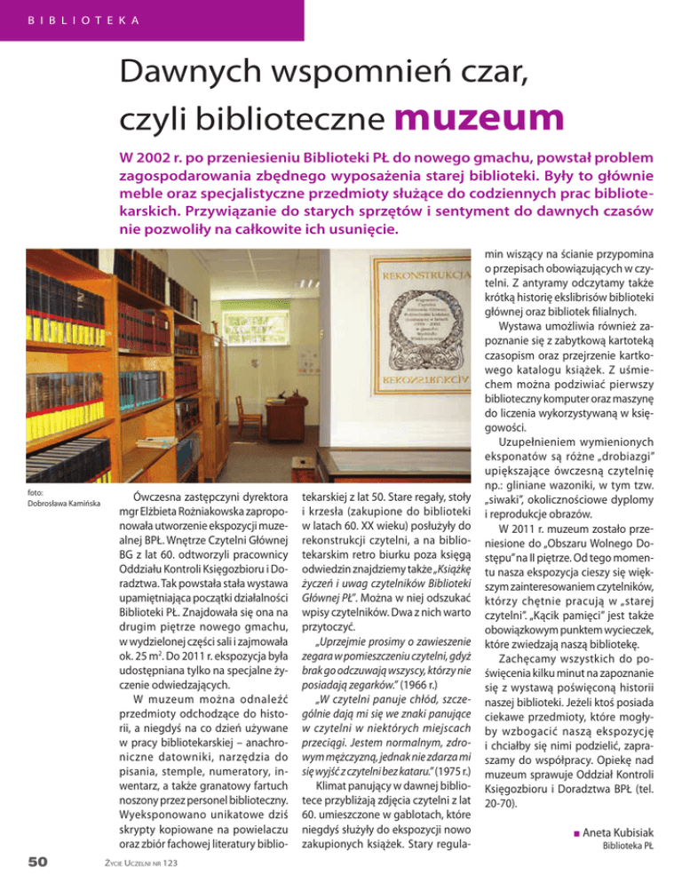 B I B L I O T E K A Dawnych wspomnień czar, czyli biblioteczne muzeum W 2002 r. po przeniesieniu Biblioteki PŁ do nowego gmachu, powstał problem zagospodarowania zbędnego wyposażenia starej biblioteki. Były to głównie meble oraz specjalistyczne przedmioty służące do codziennych prac bibliotekarskich. Przywiązanie do starych sprzętów i sentyment do dawnych czasów nie pozwoliły na całkowite ich usunięcie. foto: Dobrosława Kamińska 50 Ówczesna zastępczyni dyrektora mgr Elżbieta Rożniakowska zaproponowała utworzenie ekspozycji muzealnej BPŁ. Wnętrze Czytelni Głównej BG z lat 60. odtworzyli pracownicy Oddziału Kontroli Księgozbioru i Doradztwa. Tak powstała stała wystawa upamiętniająca początki działalności Biblioteki PŁ. Znajdowała się ona na drugim piętrze nowego gmachu, w wydzielonej części sali i zajmowała ok. 25 m2. Do 2011 r. ekspozycja była udostępniana tylko na specjalne życzenie odwiedzających. W muzeum można odnaleźć przedmioty odchodzące do historii, a niegdyś na co dzień używane w pracy bibliotekarskiej – anachroniczne datowniki, narzędzia do pisania, stemple, numeratory, inwentarz, a także granatowy fartuch noszony przez personel biblioteczny. Wyeksponowano unikatowe dziś skrypty kopiowane na powielaczu oraz zbiór fachowej literatury biblioŻycie Uczelni nr 123 tekarskiej z lat 50. Stare regały, stoły i krzesła (zakupione do biblioteki w latach 60. XX wieku) posłużyły do rekonstrukcji czytelni, a na bibliotekarskim retro biurku poza księgą odwiedzin znajdziemy także „Książkę życzeń i uwag czytelników Biblioteki Głównej PŁ”. Można w niej odszukać wpisy czytelników. Dwa z nich warto przytoczyć. „Uprzejmie prosimy o zawieszenie zegara w pomieszczeniu czytelni, gdyż brak go odczuwają wszyscy, którzy nie posiadają zegarków.” (1966 r.) „W czytelni panuje chłód, szczególnie dają mi się we znaki panujące w czytelni w niektórych miejscach przeciągi. Jestem normalnym, zdrowym mężczyzną, jednak nie zdarza mi się wyjść z czytelni bez kataru.” (1975 r.) Klimat panujący w dawnej bibliotece przybliżają zdjęcia czytelni z lat 60. umieszczone w gablotach, które niegdyś służyły do ekspozycji nowo zakupionych książek. Stary regula- min wiszący na ścianie przypomina o przepisach obowiązujących w czytelni. Z antyramy odczytamy także krótką historię ekslibrisów biblioteki głównej oraz bibliotek filialnych. Wystawa umożliwia również zapoznanie się z zabytkową kartoteką czasopism oraz przejrzenie kartkowego katalogu książek. Z uśmiechem można podziwiać pierwszy biblioteczny komputer oraz maszynę do liczenia wykorzystywaną w księgowości. Uzupełnieniem wymienionych eksponatów są różne „drobiazgi” upiększające ówczesną czytelnię np.: gliniane wazoniki, w tym tzw. „siwaki”, okolicznościowe dyplomy i reprodukcje obrazów. W 2011 r. muzeum zostało przeniesione do „Obszaru Wolnego Dostępu” na II piętrze. Od tego momentu nasza ekspozycja cieszy się większym zainteresowaniem czytelników, którzy chętnie pracują w „starej czytelni”. „Kącik pamięci” jest także obowiązkowym punktem wycieczek, które zwiedzają naszą bibliotekę. Zachęcamy wszystkich do poświęcenia kilku minut na zapoznanie się z wystawą poświęconą historii naszej biblioteki. Jeżeli ktoś posiada ciekawe przedmioty, które mogłyby wzbogacić naszą ekspozycję i chciałby się nimi podzielić, zapraszamy do współpracy. Opiekę nad muzeum sprawuje Oddział Kontroli Księgozbioru i Doradztwa BPŁ (tel. 20-70). n Aneta Kubisiak Biblioteka PŁ
