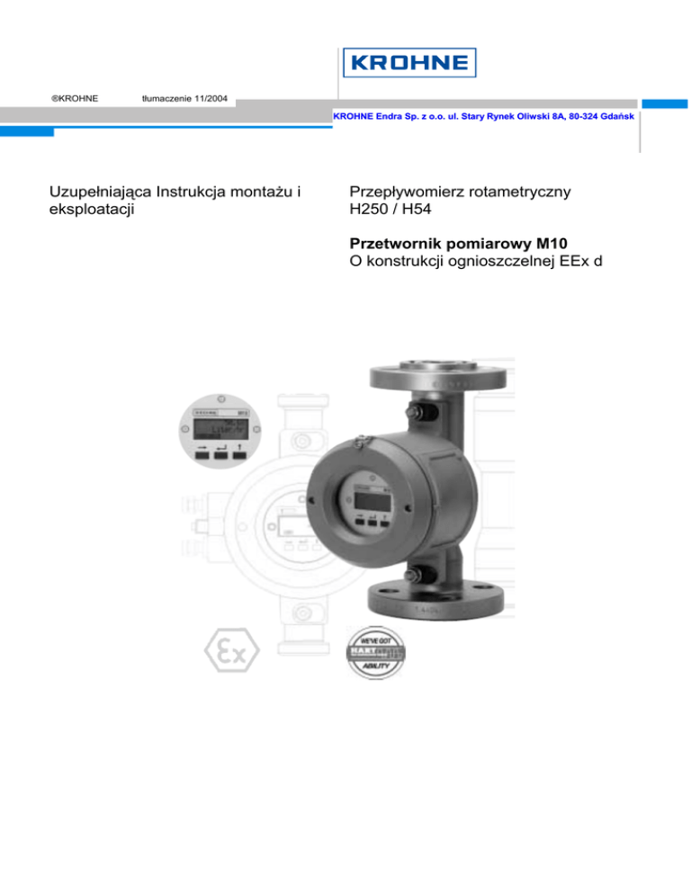 ®KROHNE tłumaczenie 11/2004 KROHNE Endra Sp. z o.o. ul. Stary Rynek Oliwski 8A, 80-324 Gdańsk Uzupełniająca Instrukcja montażu i eksploatacji Przepływomierz rotametryczny H250 / H54 Przetwornik pomiarowy M10 O konstrukcji ognioszczelnej EEx d KROHNE Endra Sp. z o.o. Spis treści Odpowiedzialność i gwarancja produktu 3 Kompletacja dostawy 3 1 Koncepcja obsługi operatorskiej - M10 4 2 Elementy kontrolne i operatorskie 5 3 Funkcjonowanie klawiszy i przełącznika magnetycznego 3.1 Zakończenie czynności operatorskich 5 6 4 Nastawy 4.1 Liczby 4.2 Zmienne i funkcje 6 6 6 5 Tabela menu funkcji 7 6 Tabela nastaw fabrycznych 13 7 Opis 13 8 Podłączenie elektryczne i funkcje 14 9 Podłączenie elektryczne wyjścia prądowego M10 9.1 Podłączenie elektryczne wyjść B1 i B2 15 16 10 Dane techniczne 18 Odesłanie urządzenia do firmy KROHNE w celu przeglądu lub naprawy 19 Przetwornik pomiarowy M10 o konstrukcji ognioszczelnej EEx d – Instrukcja uzupełniająca 2 KROHNE Endra Sp. z o.o. Odpowiedzialność i gwarancja produktu Przepływomierz rotametryczny H.../.../M10 zaprojektowany jest do pomiaru objętościowego natężenia przepływu pary, gazu i cieczy. W przypadku użytkowania urządzenia w obszarze zagrożonym wybuchem, zastosowanie mają przepisy bezpieczeństwa, odnoszące się do urządzeń o konstrukcji ognioszczelnej typu Ex d. Odpowiedzialność w zakresie właściwego doboru i zamierzonego użycia urządzenia spoczywa wyłącznie na użytkowniku. Niepoprawna instalacja lub obsługa urządzenia może prowadzić do utraty gwarancji. Ponadto zastosowanie mają “Ogólne warunki sprzedaży”, stanowiące podstawę umowy sprzedaży. UWAGA! Montaż, instalacja, uruchomienie i obsługa mogą być wykonywane jedynie przez przeszkolony personel. Prace obsługowe mające wpływ na bezpieczeństwo, mogą być wykonywane jedynie przez producenta, jego autoryzowanego przedstawiciela lub mogą być wykonywane pod nadzorem autoryzowanego inspektora. Uwaga: W przypadku produktów łatwopalnych, nie dopusza się stosowania przyłączy łatwo demontowanych zgodnych z DIN 11851, SMS, TriClamp (np. zaciskowe DIN 32676, ISO 2852). Kompletacja dostawy Zakres dostawy dla przepływomierza rotametrycznego w zamówionej wersji, H.../.../M10 EEx d, obejmuje: • “Instrukcję montażu i eksploatacji” H250 lub H54 oraz “Instrukcję uzupełniającą” dla przetwornika pomiarowego M10 • W przypadku wersji “Ex”, stosowne “Instrukcje uzupełniające” dla przetwornika pomiarowego M10, PTB 01 ATEX 1154 • Świadectwo zgodności dla ATEX • Magnes prętowy do obsługi wyświetlacza • Materiały instalacyjne (sworznie montażowe, uszczelki kołnierzowe, okablowanie) – nie podlega dostawie Świadectwa i certyfikaty specjalne (dostarczane wyłącznie na zamówienie) • Raport z nastaw fabrycznych • Świadectwo próby zgodne z EN 10204: próba ciśnienia hydraulicznego, próba wnikania barwnika, próba radiograficzna, próba szczelności, próba ultradźwiękowa, helowa próba szczelności. • Czyszczenie według specyfikacji fabrycznej. Opis, warunki aplikacyjne i wskazówki dotyczące bezpieczeństwa, dla sekcji pomiarowej H250, podane są w “Instrukcji montażu i eksploatacji przepływomierza H250”. Przetwornik pomiarowy M10 o konstrukcji ognioszczelnej EEx d – Instrukcja uzupełniająca 3 KROHNE Endra Sp. z o.o. 1 Koncepcja obsługi operatorskiej - M10 136.49 m3 / hr IIIIII Tryb pomiarowy → Wprowadzenie kodu wejścia, gdy KOD (Fct. 3.15) jest aktywowany. (patrz: strona 5) KOD Kolumna menu Kolumna funkcji Kolum. danych 3.16 WART. POCZĄTK 3.15 KOD WEJŚCIA 3.0 INSTALACJA 3.14 ODC. NISK. PRZE Pozycje menu, patrz 3.13 ZAKR. I JEDN. 2.0 TEST&INFO 1.0 PRACA ↑ → ↵ 2.7 NR. PUNKTU 3.12 PRĄD ALARM. 2.6 WERSJA. PROGR. 3.11 KALIBR. 20mA 2.5 NR. SERYJNY. 3.10 KALIBR. 4mA 2.4 WEJŚCIE B3 3.9 MULTI DROP 2.3 WYJŚCIE B2 3.8 FUNKCJA B3 2.2 WYJŚCIE B1 3.7 IMPULSY/JEDN. 2.1 WYJŚCIE 420mA. 3.6 SZER. IMPULSU 1.5 ZEROWANIE 3.5 ZESTYK B2 1.4 STAŁA CZASOWA 3.4 FUNKCJA B2 1.3 WYŚWIETLACZ 3.3 ZESTYK B1 1.2 WYJŚCIE B2 3.2 FUNKCJA B1 1.1 WYJŚCIE B1 3.1 JĘZYK ↑ → ↵ Przetwornik pomiarowy M10 o konstrukcji ognioszczelnej EEx d – Instrukcja uzupełniająca 4 KROHNE Endra Sp. z o.o. 2 Elementy kontrolne i operatorskie Czynności operatorskie realizowane za pomocą: 1 Klawiszy, gdy wieczko wyświetl. jest otwarte specjalnym kluczem (dostarczanym). (nie dla EEx) 2 M10 2 Czujników magnetycznych, uruchamianych magnesami prętowymi bez otwierania obudowy. 687 m3/h UWAGA: Użycie magnesów prętowych wywoła krótkotrwały efekt chwilowej zmiany wartości mierzonej (na skutek oddziaływania z czujnikiem pomiarowym). 1 UWAGA! Gwint, jak i uszczelka wieczka nie mogą ulec zabrudzeniu, ani uszkodzeniu - zawsze winny być dobrze nasmarowane. W przypadku uszkodzenia, uszczelkę należy wymienić natychmiast! 3 Funkcjonowanie klawiszy i przełącznika magnetycznego Measuring mode 13.571 m3 / hr IIIIIIIIIIIII → Rozpocząć od I Fct. 1.0 UWAGA: Do rozpoczęcia czynności operatorskich nie należy używać żadnych innych klawiszy. Przy pomyłkowym naciśnięciu, odczekać 5 sekund i rozpocząć od naciśnięcia klawisza → PRACA . Jeśli podano “Tak” dla Fct. 3.15 KOD WEJŚCIA, słowo “KOD” ukaże się na wyświetlaczu po naciśnięciu klawisza → . W przypadku aktywacji funkcji kodu, przy wejściu należy podać 9-pozycyjny kod. Każda pozycja potwierdzana jest przez “*”, po której – jeśli kod jest poprawny – uzyskuje się dostęp do menu. Uwaga: Kod jest ustawiany fabrycznie. → → → ↵ ↵ ↵ ↑ ↑ ↑ Nastawa fabryczna dotycząca sprawdzania kodu nie jest aktywowana. Opcjonalnie, można ją aktywować przez funkcję Fct. 3.15. Jeśli przez 5 sekund nie naciśnięto klawisza, wprowadzanie kodu zostaje przerwane (użyteczne w przypadku, gdy wprowadzono niepoprawny kod wejściowy.) Sekwencja naciśnięć ↵ ↑ Zerowanie Sumatora lub Zerowanie Błędu → prow
