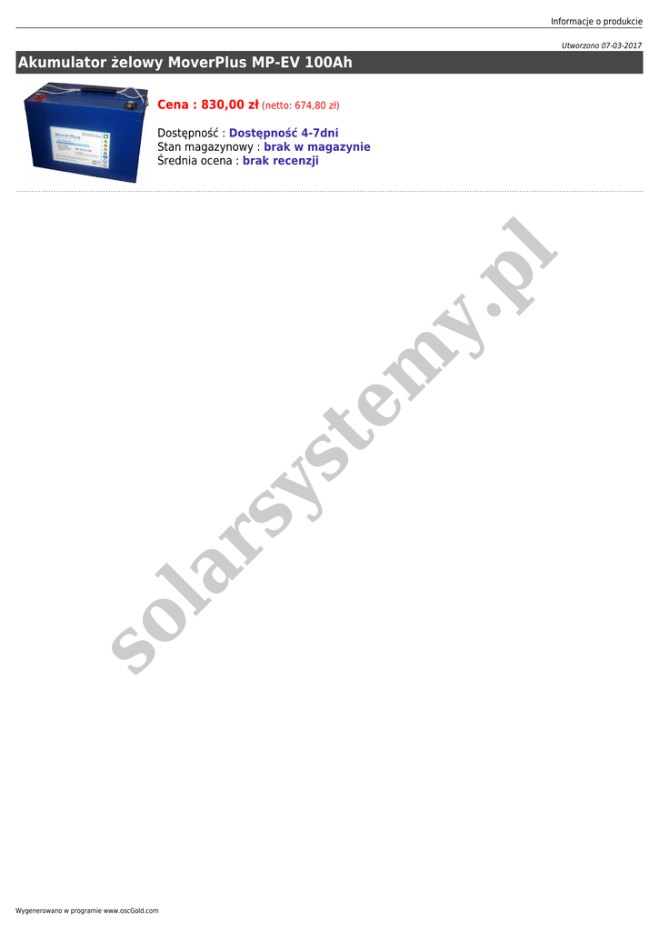 Informacje o produkcie Utworzono 07-03-2017 Akumulator żelowy MoverPlus MP-EV 100Ah Cena : 830,00 zł (netto: 674,80 zł) so la rs ys te m y. p l Dostępność : Dostępność 4-7dni Stan magazynowy : brak w magazynie Średnia ocena : brak recenzji Wygenerowano w programie www.oscGold.com Akumulator żelowy MoverPlus MP-EV 12V 100Ah wymiary [mm]:306x168x211 Charakterystyka: C5hr=78Ah; C20hr=96Ah; C100hr=110Ah Akumulatory MoverPlus to doskonałe źródło do zasilania urządzeń wymagających pracy cyklicznej takich jak baterii słonecznych, wózków inwalidzkich, łodzi i maszyn. Nowoczesna technologia produkcji zapewnia duży prąd rozruchowy pozwalający na niezawodne działanie pojazdów elektrycznych, wózków golfowych oraz rozruchu maszyn. Wzmocniona konstrukcja akumulatora żelowego oraz duża odporność na naprężenia mechaniczne pozwala na wykorzystanie akumulatorów w aplikacjach przenośnych. Zastosowania akumulatora żelowego: - Wózki inwalidzkie Jachty, łodzie Wózki golfowe Rozruch maszyn Pojazdy elektryczne Maszyny czyszczące Systemy energii odnawialnej (baterie słoneczne, panele elastyczne, turbiny wiatrowe) i wiele innych Charakterystyka: Akumulator żelowy (nie AGM). Konstrukcja szczelna, bezobsługowa. Przeznaczone są do pracy cyklicznej oraz w systemach buforowych. Wysoka trwałość użytkowa i bardzo dobre parametry pracy. l - Zalety akumulatora żelowego MoverPlus MP-EV y. p - zwiększona ilość głębokich cykli rozładowania-ładowania, - zżelowany elektrolit nie rozwarstwia się, - dobrze toleruje podwyższoną temperaturę pracy, - pełny powrót ze stanu głębokiego rozładowania, nawet jeśli ponowne ładowanie baterii ma miejsce po jakimś czasie, - bardzo dobra wydajność przy długich czasach rozładowań, - zmniejszone samorozładowanie, - do zastosowań przy niestabilnej sieci zasilającej, - do codziennych, powtarzających się rozładowań. Napięcie nominalne 12 V Długość 306 mm Szerokość 168 mm Wysokość 211 mm Waga 28.3 kg Żywotność znamionowa 12 lat Temperatura pracy -200C 500C Typ obudowy ABS Praca pionowa, pozioma Rezystancja wewnętrzna 5 mOhm 715 A ys Wartość prądu rozruchowego dla 00C te m Specyfikacja Maksymalny prąd ładowania 25 A Typ terminala śruba M8 Normy IEC 896-2, DIN 43534, BS 6290 Pt4, Eurobat la rs Charakterystyka Pojemność w funkcji temperatury dla [C20] Samorozładowanie przy składowaniu (25 C) 400C - 102% 200C - 100% 00 C - 85% -150C - 65% po 1 miesiącu - 98% po 3 miesiącach - 94% po 6 miesiącach - 86% so 100 h - 110Ah 20 h - 96 Ah 10 h - 88 Ah 5h - 78 Ah 3 h - 72 Ah 1 h - 59 Ah Pojemność 20-250C Temperaturowy współczynnik korekcji pojemności Czas rozładowania -300C -200C -100C 00C 50 C 100C 150C 200 250C 300C 400C 500C C 5-59 min 0.23 0.417 0.605 0.778 0.86 0.91 0.96 1 1.037 1.063 1.1 1-100 godz. 0.277 0.464 0.647 0.816 0.886 0.93 0.97 1 1.028 1.05 1.07 1.078 1.116 Optymalne napięcie ładowania akumulatora zależy od temperatury. Dla 15-240C zalecane napięcie wynosi 2.27-2.30V (dla pracy cyklicznej 2.40V). W poniższej tabeli przedstawiono zależność napięcia ładowania od temperatury otoczenia. Temperatura Napięcie ładowania (V/ogn.) 0-9 2.33-2.35 10-14 2.30-2.33 15-19 2,27-2,30 20-24 2,27-2,30 25-29 2,25-2,27 30-34 2,23-2,25 35-40 2,21-2,23 Parametry ładowania Producent zaleca ładowanie akumulatorów metodą stałonapięciową z ograniczonym prądem ładowania do max. C20/4 Informacje o produkcie MP EV 12-100 Napięcie pracy [ V ]: 12 Pojemność [ Ah ]: 100 Projektowana żywotność:: 12 lat Długość gwarancji:: 24 m-ce praca buforowa; 12 m-cy praca cykliczna Wymiary: ---------------------------- Długość [ mm ]: 306 Szerokość [ mm ]: 168 Wysokość [ mm ]: 211 Waga [ kg ]: 28,30 so la rs ys te m y. p l Model: Wygenerowano w programie www.oscGold.com