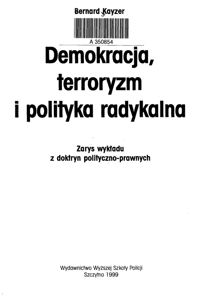 Bernard jtayzer A 350854 Demokracja, terroryzm i polityka radykalna Zarys wykładu z doktryn polityczno-prawnych Wydawnictwo Wyższej Szkoły Policji Szczytno 1999 Spis treści Wstęp 5 1. Wprowadzenie do przedmiotu 6 1.1. Kategorie 1.2. Zadania i funkcje doktryn 1.3. Klasyfikacja doktryn. Typy doktryn 6 12 12 2. Autorytaryzm i demokratyzm 15 3. Demokratyczne państwo prawne 28 2.1. Ewolucja doktryn autorytarnych 2.2. Totalitaryzm 2.3. Teokracje 2.4. Rola wolnego człowieka w demokracji 2.5. Ewolucja demokratyzmu 2.6. Polska myśl demokratyczna 3.1. Władza i demokracja 3.2. Czym jest państwo demokratyczne? 3.3. Państwo obywatelskie a narodowe 3.4. Państwo prawa a państwo przepisu prawnego 3.5. Formy władzy państwowej 3.6. Rola i funkcje policji w demokratycznym państwie prawnym. „Apolityczność" policji 3.7. Sitting i bierny opór a demokracja 3.8. Kultura polityczna 15 17 18 18 20 25 28 30 32 32 33 36 37 39 4. Liberalizm libertarny 42 5. Ekstremizm „prawicowy". Faszyzm 48 4.1. Liberalne ujęcie wolnoścH jego zasady 4.2. Ekstremizm liberalny Gibertarianizm) 5.1. 5.2. 5.3. 5.4. Faszyzm i neofaszyzm Neokonserwatyzm. „Nowa prawica" Metody Neonazizm w Polsce Demokracja, terroryzm i polityka radykalna 42 43 48 50 52 52 6. Ekstremizm „lewicowy". Goszyzm 55 6.1. Anarchistyczna interpretacja wolności. Wojna z instytucją państwa 6.2. Nurt intelektualny neoanarchizmu 6.3. Nurt terrorystyczny w neoanarchizmie 6.4. Neoanarchizm w Polsce. Organizacje i metody działania 6.5. Trockizmi neotrockizm 6.6. Maoizm pozachiński 6.7. Komunizm (leninizm i stalinizm). Eurokomunizm 6.8. „Nowa lewica" i neomarksizm 6.9. Teologia wyzwolenia 6.10. Lewica ekstremistyczna w Polsce 55 56 57 57 58 63 64 65 66 67 7. Dyskryminacja kulturowa i rasowa 69 8. Terror i terroryzm 83 9. Zwalczanie terroryzmu jako funkcja demokratycznego państwa prawa. Terroryzm w Polsce 95 7.1. Standardy europejskie wobec mniejszości kulturowych 7.2. Dyskryminacja narodowa 7.3. Dyskryminacja antropologiczna 69 69 73 8.1. Geneza i znaczenie pojęć 8.2. Terroryzm państwowy czyli terror 8.3. Terroryzm narodowowyzwoleńczy i quasi-wyzwoleńczy 8.4. Ekoterroryzm 8.5. Terroryzm „apolityczny" (grupy przestępcze, mafijność) 9.1. Terroryzm w Polsce 9.2. Zasady postępowania z terroryzmem 83 86 89 89 90 95 97 Bibliografia 102 Przypisy 107 Aneks 121 Bernard Kayzer