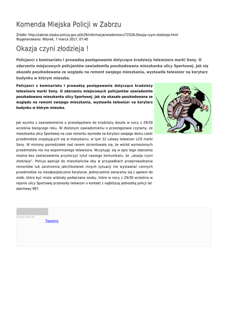 Komenda Miejska Policji w Zabrzu Źródło: http://zabrze.slaska.policja.gov.pl/k29/informacje/wiadomosci/72328,Okazja-czyni-zlodzieja.html Wygenerowano: Wtorek, 7 marca 2017, 07:40 Okazja czyni złodzieja ! Policjanci z komisariatu I prowadzą postępowanie dotyczące kradzieży telewizora marki Sony. O zdarzeniu miejscowych policjantów zawiadomiła poszkodowana mieszkanka ulicy Sportowej. Jak się okazało poszkodowana ze względu na remont swojego mieszkania, wystawiła telewizor na korytarz budynku w którym mieszka. Policjanci z komisariatu I prowadzą postępowanie dotyczące kradzieży telewizora marki Sony. O zdarzeniu miejscowych policjantów zawiadomiła poszkodowana mieszkanka ulicy Sportowej. Jak się okazało poszkodowana ze względu na remont swojego mieszkania, wystawiła telewizor na korytarz budynku w którym mieszka. Jak wynika z zawiadomienia o przestępstwie do kradzieży doszło w nocy z 29/30 września bieżącego roku. W złożonym zawiadomieniu o przestępstwie czytamy, że mieszkanka ulicy Sportowej na czas remontu wyniosła na korytarz swojego domu cześć przedmiotów znajdujących się w mieszkaniu, w tym 32 calowy telewizor LCD marki Sony. W miniony poniedziałek nad ranem zorientowała się, że wśród wyniesionych przedmiotów nie ma wspomnianego telewizora. Wczytując się w opis tego zdarzenia można bez zastanowienia przytoczyć tytuł naszego komunikatu, że „okazja czyni złodzieja”. Policja apeluje do mieszkańców aby w przypadkach przeprowadzania remontów lub zaistnienia jakichkolwiek innych sytuacji nie wystawiać cennych przedmiotów na niezabezpieczone korytarze. Jednocześnie zwracamy się z apelem do osób, które być może widziały podejrzane osoby, które w nocy z 29/30 września w rejonie ulicy Sportowej przenosiły telewizor o kontakt z najbliższą jednostką policji tel. alarmowy 997. Ocena: 0/5 (0) Tweetnij