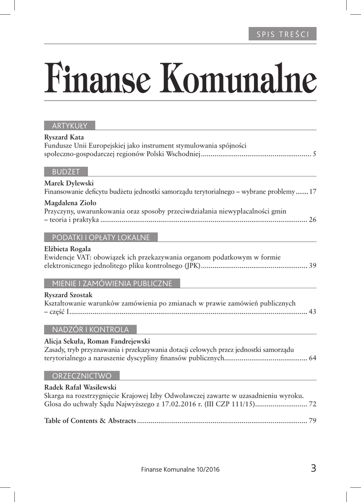 SPIS TREŚCI ARTYKUŁY Ryszard Kata Fundusze Unii Europejskiej jako instrument stymulowania spójności społeczno-gospodarczej regionów Polski Wschodniej ......................................................... 5 BUDŻET Marek Dylewski Finansowanie deficytu budżetu jednostki samorządu terytorialnego – wybrane problemy .......17 Magdalena Zioło Przyczyny, uwarunkowania oraz sposoby przeciwdziałania niewypłacalności gmin – teoria i praktyka ........................................................................................................... 26 PODATKI I OPŁATY LOKALNE Elżbieta Rogala Ewidencje VAT: obowiązek ich przekazywania organom podatkowym w formie elektronicznego jednolitego pliku kontrolnego (JPK) ....................................................... 39 MIENIE I ZAMÓWIENIA PUBLICZNE Ryszard Szostak Kształtowanie warunków zamówienia po zmianach w prawie zamówień publicznych – część I ........................................................................................................................... 43 NADZÓR I KONTROLA Alicja Sekuła, Roman Fandrejewski Zasady, tryb przyznawania i przekazywania dotacji celowych przez jednostki samorządu terytorialnego a naruszenie dyscypliny finansów publicznych........................................... 64 ORZECZNICTWO Radek Rafał Wasilewski Skarga na rozstrzygnięcie Krajowej Izby Odwoławczej zawarte w uzasadnieniu wyroku. Glosa do uchwały Sądu Najwyższego z 17.02.2016 r. (III CZP 111/15)........................... 72 Table of Contents & Abstracts ........................................................................................ 79 Finanse Komunalne 10/2016 3 WARUNKI PRZYJMOWANIA TEKSTÓW DO DRUKU Redakcja przyjmuje teksty oryginalne o objętości 10–40 tys. znaków, z wyraźnie zaznaczonym tytułem, podziałem na podrozdziały, podsumowaniem, przypisami, krótką notką o autorze oraz adresem e-mailowym. Materiały większe lub mniejsze albo już publikowane wymagają osobnej zgody redakcji. Tekst należy zaopatrzyć w abstrakt w języku polskim, o objętości nie większej niż 500 znaków. Autor może zaproponować tłumaczenie na język angielski tytułu tekstu oraz abstraktu. Przypisy powinny być opracowane w tradycyjny sposób – na dole strony. Materiały wraz z danymi autora (stanowisko, adres, numer telefonu) i ewentualnym listem polecającym prosimy przysyłać pocztą elektroniczną lub zwykłą, z załączoną płytą CD. Przekazując tekst do redakcji, autor przenosi na Wydawcę wyłączne prawo do jego publikacji. Autor ponosi odpowiedzialność za aktualny stan prawny treści utworu, przywoływanych przepisów, orzecznictwa i doktryny. Redakcja zastrzega sobie prawo skracania tekstów, zmiany tytułów, śródtytułów oraz poprawek merytorycznych i stylistycznych, również w wersji angielskiej. Materiałów niezamówionych nie zwracamy. Warunkiem publikacji artykułu jest odesłanie podpisanej umowy do Wydawnictwa. Nadesłane do Redakcji artykuły naukowe są recenzowane. Podstawowe informacje dotyczące miesięcznika „Finanse Komunalne” są dostępne na stronie www.czasopisma.wolterskluwer.pl/oferta /finanse-komunalne, natomiast zasady recenzowania tekstów oraz wymagania dla autorów dotyczące ghostwritingu są dostępne na stronie internetowej www.wolterskluwer.pl/proces-publikacji-w-czasopismie. Redakcja 4 Finanse Komunalne 10/2016 TA B L E O F CO N T E N T S & A B S T R A C T S LOCAL AUTHORITY FINANCE Monthly Magazine of the Regional Chambers of Audit ARTICLES Ryszard Kata European Union funds as an instrument for stimulating social and economic cohesion in the regions of Eastern Poland .....................................................................................................................5 The article contains an assessment of the regional income convergence processes in Poland. This issue is examined from the point of view of key developmental gaps separating the regions of Eastern Poland from other, more economically developed regions of the country. Substantial resources from the European Union’s structural funds were directed to reduce these gaps in 2004–2014, including the Development of the Eastern Poland Operational Programme (EP OP 2007-2013), which was specially assigned for this purpose. It was demonstrated that, during the period under review, significant progress took place in reducing the development gaps, such as outlay on research and development (R&D), compared with GDP, the occupational activation of the population and the development of the road infrastructure. Progress in this area would not have been possible without the support of EU funds, although the scope and scale of the positive changes did not allow for regional convergence to take place, but contributed to slowing down the processes of the further polarization of income between the regions in Poland. BUDGET Marek Dylewski Financing a local authority unit’s budget deficit – selected issues ........................................................ 17 The article presents selected problems in financing the budget deficits of local authority units, particularly with budget surpluses from prior years and debt instruments which were unused in the given year or prior years. The objective of the article is to present the financial aspects of covering the budget deficit of local authority units with the budget surplus from prior years and unused debt instruments, such as loans, borrowings and securities. The relevant considerations have been supplemented with examples of settlements of surpluses from prior years, as well as debt instruments. Magdalena Zioło Causes, conditions and methods of preventing insolvency of municipalities – theory and practice ....26 The article draws attention to the category of insolvency of public entities as an important research issue in the area of finance. It highlights the causes, determinants and methods of tackling the issue, emphasizi