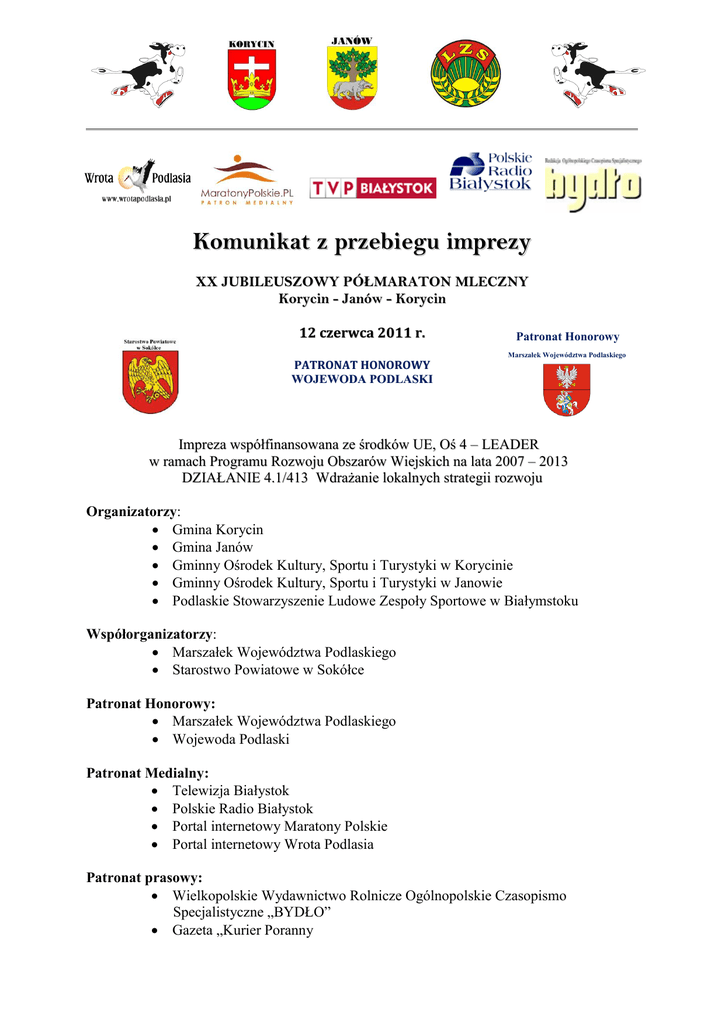 Komunikat z przebiegu imprezy XX JUBILEUSZOWY PÓŁMARATON MLECZNY Korycin - Janów - Korycin 12 czerwca 2011 r. PATRONAT HONOROWY WOJEWODA PODLASKI Patronat Honorowy Marszałek Województwa Podlaskiego Impreza współfinansowana ze środków UE, Oś 4 – LEADER w ramach Programu Rozwoju Obszarów Wiejskich na lata 2007 – 2013 DZIAŁANIE 4.1/413 Wdrażanie lokalnych strategii rozwoju Organizatorzy: Gmina Korycin Gmina Janów Gminny Ośrodek Kultury, Sportu i Turystyki w Korycinie Gminny Ośrodek Kultury, Sportu i Turystyki w Janowie Podlaskie Stowarzyszenie Ludowe Zespoły Sportowe w Białymstoku Współorganizatorzy: Marszałek Województwa Podlaskiego Starostwo Powiatowe w Sokółce Patronat Honorowy: Marszałek Województwa Podlaskiego Wojewoda Podlaski Patronat Medialny: Telewizja Białystok Polskie Radio Białystok Portal internetowy Maratony Polskie Portal internetowy Wrota Podlasia Patronat prasowy: Wielkopolskie Wydawnictwo Rolnicze Ogólnopolskie Czasopismo Specjalistyczne „BYDŁO” Gazeta „Kurier Poranny Stowarzyszenia, instytucje i osoby wspierające: Marszałek Województwa Podlaskiego Bank Spółdzielczy w Korycinie Bank Spółdzielczy w Sokółce Piekarnia „REVMOD” w Mońkach Przedsiębiorstwo Handlowo Usługowe Konar w Skindzierzu Gospodarstwo Ogrodnicze w Białousach - Jerzy Wilczewski Zajazd „Trivento” w Korycinie Sklep Spożywczy ARO w Korycinie - Jan i Beata Gołębiewscy Bar BIESIADA weselna w Kumiale Zespół Szkół w Korycinie Przedszkole im. Jana Pawła II w Korycinie Zespół Szkół Samorządowych w Janowie Ochotnicza Straż Pożarna w Korycinie Ochotnicza Straż Pożarna w Janowie POLICJA Bieg główny: Dystans - 21 097,5 m Trasa Korycin - Janów - Korycin z atestem PZLA Nagroda główna - ŻYWA KROWA Otwarcie imprezy: Teren przy Wiatraku nad Zalewem w Korycinie START - Rynek w Korycinie PÓŁMETEK w Janowie META - przystanek PKS w Mielnikach k. Korycina DEKORACJA ZWYCIĘZCÓW - Teren przy Wiatraku nad Zalewem w Korycinie W biegu głównym zarejestrowało się 164 zawodników z Polski, Białorusi, Ukrainy, Litwy i Rosji. To rekordowa liczba uczestników naszej imprezy w ciągu jej 19 edycji i średnio 36 - 40 % wzrost w stosunku do liczby zawodników w ostatnich latach. Dla organizatorów to potwierdzenie, że impreza się rozwija, zyskuje uznanie u zawodników i jest rozpoznawalna w różnych zakątkach w kraju i za zagranicą, co bardzo cieszy organizatorów. Wśród zawodników z trasą Półmaratonu Mlecznego zmierzyło się 10 zawodników na wózkach inwalidzkich (7 mężczyzn i 3 kobiety) i 6 biegaczy niepełnosprawnych z innymi dysfunkcjami, 5 biegaczy w kategorii zawodników zamieszkałych w Gminach Korycin i Janów. Zwiększa się również liczba kobiet – w tym roku 13 najwięcej w historii. Zwycięzca Tsetserukou Ihar ukończył bieg z czasem 1:07.15. Nagrodę główną w naturze, którą była młoda, rasowa, krowa, zamienił na zryczałtowaną nagrodę pieniężną w wysokości 1 500 zł. Za miejsca I – VI w każdej kategorii zawodnicy otrzymali nagrody pieniężne. Wszyscy zawodnicy, którzy ukończyli bieg zostali osobiście udekorowani, otrzymali pamiątkowe medale, dyplomy i posiłek regeneracyjny oraz zaproszenie na piknik w plenerze przy pieczonym baranie. Wśród zawodników rozlosowano również nagrody rzeczowe. Zawodnikom sprzyjała również pogoda, wielu z nich pobiło własne rekordy, jednak nie udało się pobić rekordu trasy pobitego przez Andrej Gordiejew czas: 1:05,33 Uhonorowano również dodatkową nagrodą Pana Andrzeja Zieniewicza z Białegostoku, który jako jedyny przebiegł wszystkie Półmaratony Mleczne. Jak co roku imprezie towarzyszą integracyjne biegi dzieci i młodzieży, które organizowane są na półmetku biegu głównego w Janowie. Dodatkowe atrakcje podczas imprezy: Pokaz Jazdy na łyżworolkach przez Klub MKS Juvenia Białystok: (przedstawiciel klubu w dniu imprezy zaprezentuje swój klub) Wystawa „Histria Półmaratonu Mlecznego na przełomie lat: 1992 -2010” „Kolejka Bajkowa” – przejażdżki dzieci z rodzicami wokół Korycina Turniej wiedzy o Półmaratonie Mlecznym Korycin-Janów-Korycin z nagrodami Koncert dziecięcego zespołu wokalnego z GOKSiT w Korycinie - instruktor Małgorzata Trojanowska Prezentacje taneczne zespołów tańca nowoczesnego i tańca towarzyskiego w Korycinie MUZYKA na żywo - zespół muzyczny „Golden” z Sokółki Skład zespołu: Rafał Bierko, Krzysztof Grynczel, Małgorzata Bakun Prezentacje artystyczne : TANIEC TOWARZYSKI Klub tańca towarzyskiego „PRESTIGRE” : Instruktor grupy i prezes klubu Pani Izabela Słomka Łabanowska Zajęcia tańca towarzyskiego w GOKSiT odbywają się od X.2009 r. w dwóch grupach wiekowych 5- 11 lat i 12 – 15 lat. Zajęcia prowadzą instruktorzy Klubu tańca towarzyskiego „PRESTIGE” (czyt. prestiż) Tancerze tańczą w kategorii tańca rekreacyjnego wykonają różne układy taneczne i mają już osiągnięcia. Dziś zaprezentują się tancerze ze starszej grupy Zapowiada instruktor TANIEC NOWOCZESNY Instruktorem i choreografem jest Artur Krzywosz - Vice mistrz Polski w hip – hopie i street dance show Układ 1 - grupa tańca nowoczesnego – najmłodsi tancerze z Gminy Korycin Grupa działa przy GOKSiT w Korycinie pod kierunkiem Artura Krzywosza jako 10 – osobowa grupa początkująca w wieku 5 – 10 lat z terenu Gminy Korycin. Rekrutacja do grupy tanecznej będzie trwać całe wakacje. Wszystkie chętne dzieci zapraszamy na zajęcia taneczne w każdy czwartek. Układ 2 - grupa zaawansowana tańca nowoczesnego „FREESTYLE” Grupa „Freestyle” działa przy GOKSiT w Korycinie pod kierunkiem Artura Krzywosza jako 12– osobowa grupa. Skupia młodzież gimnazjalną w wieku 13 – 15 lat z terenu Gminy Korycin. Część grupy tańczy dłuższy czas, ale są też osoby, które tańczą pierwszy rok z bardzo dobrym skutkiem. Nazwa grupy „Freestyle” oznacza brak przeciwwskazań do tego, by się uczyć do