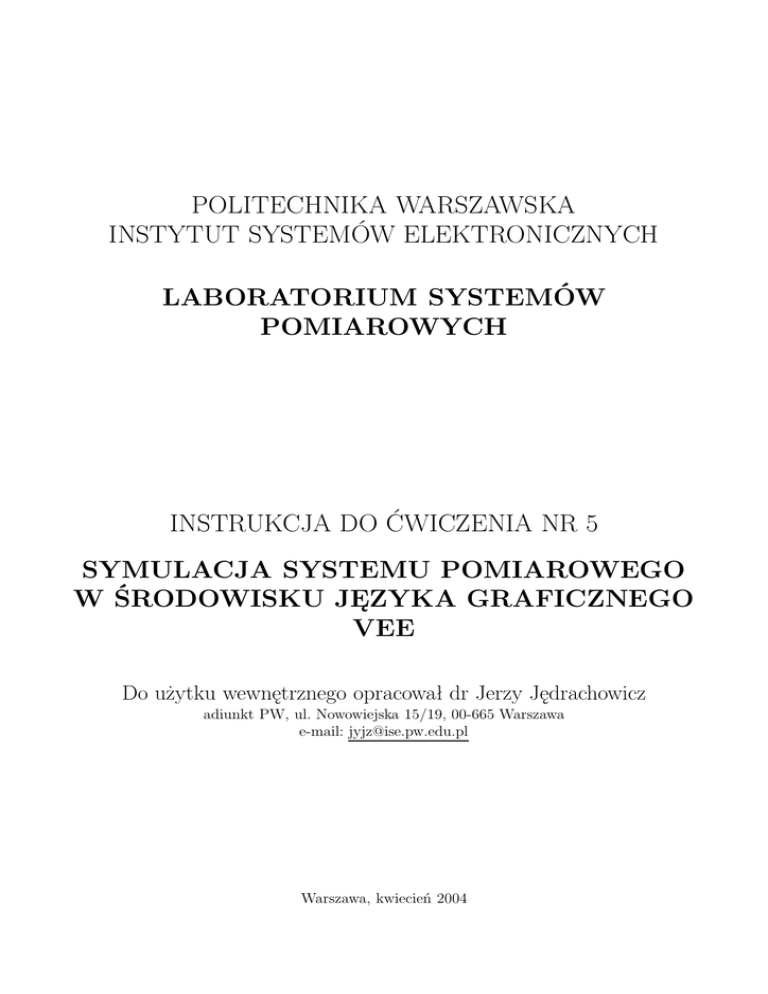 POLITECHNIKA WARSZAWSKA INSTYTUT SYSTEMÓW ELEKTRONICZNYCH LABORATORIUM SYSTEMÓW POMIAROWYCH INSTRUKCJA DO ĆWICZENIA NR 5 SYMULACJA SYSTEMU POMIAROWEGO W ŚRODOWISKU JĘZYKA GRAFICZNEGO VEE Do użytku wewnętrznego opracował dr Jerzy Jędrachowicz adiunkt PW, ul. Nowowiejska 15/19, 00-665 Warszawa e-mail: [email protected] Warszawa, kwiecień 2004 1. Cel ćwiczenia Celem ćwiczenia jest pokazanie przydatności graficznego języka VEE1 [4] w projektowaniu cyfrowego analizatora widma (AW) sygnałów kwazistacjonarnych. Przyjmuje się przy tym założenie, że AW powinien pracować w czasie na bieżąco a bank analizujących widmo filtrów pasmowych będzie emulowany za pomocą algorytmu FFT. Stąd głównym celem metrologicznym ćwiczenia jest pokazanie, jak w rzeczywistych warunkach pomiarowych zachowuje się estymata widma sygnału sinusoidalnego [5]. Język graficzny VEE wspomaga pracę projektanta na wszystkich istotnych etapach budowy systemu pomiarowo-kontrolnego (SPK): poczynając od wyboru sprzętu, jego oprogramowania, obróbki uzyskanych danych, a na prezentacji i archiwizacji wyników kończąc [3]. Stąd pomocniczym, ale bardzo istotnym celem ćwiczenia jest poznanie konstrukcji środowiska języka graficznego VEE, w szczególności pod kątem zasad korzystania z jego zasobów [1], przynajmniej w zakresie procesu projektowania wspomnianego AW. 2. Opis ćwiczenia Zastosowanie obiektów graficznych (bloków) w projektowaniu SPK zostało wymuszone przez stopień złożoności współczesnych zadań metrologicznych, wymagających niejednokrotnie zaawansowanego cyfrowego przetwarzania sygnałów. Typowe, programowe środowisko języka graficznego wykorzystuje gotowe bloki do projektowania SPK na wszystkich etapach jego powstawania. Architektura SPK staje się przez to bardziej czytelna i zrozumiała, nawet dla osób nie znających szczegółów konstrukcyjnych poszczególnych obiektów. Nie jest ważne jak dany blok jest dokładnie zbudowany ale ważne jest, co otrzymuje się na wyjściu przy zadanym wejściu. Podejście blokowe znacząco skraca czas projektowania i uruchomienia SPK, ale może też prowadzić do zaskakujących wyników, jeżeli stosuje się bloki bez rozumienia ich funkcji (np. FFT). Środowisko VEE oferuje szereg bloków i innych pomocniczych narzędzi programowych umożliwiających akwizycję danych, ich obróbkę, a na wizualizacji i archiwizacji kończąc. Do najważniejszych z nich należą: 1. programowe sterowniki2 rzeczywistych przyrządów pomiarowych (PP) oraz sterowniki zastosowanych interfejsów (np. HP-IB, Fire-Wire, USB) do komunikacji z PP, 2. bloki arytmetyczne, funktory logiczne, bloki funkcji matematycznych, oraz bloki sterujące wykonaniem programu (instrukcje warunkowe, pętle, przełączniki), 3. bloki wizualizacji danych, bloki zapisu i odczytu danych z plików. Podobnie jak większość współczesnych języków graficznych wspomagających projektowanie, również VEE posiada możliwości symulacji i uruchamiania (debugowania) SPK. Z narzędzi symulacyjnych najistotniejsze dla konstruktora są symulatory pracy rzeczywistych przyrządów. Pozwalają bowiem budować i weryfikować konstrukcję SPK bez pełnego zabezpieczenia sprzętowego. Sprawdzenie na drodze symulacji większości funkcji konkretnego PP ułatwia późniejszą budowę SPK współpracującego z fizycznie istniejącym PP, na przykład generatorem funkcyjnym. 1 2 Visual Engineering Environment Nazywane też drajwerami przyrządów pomiarowych 1 Do najważniejszych mechanizmów służących uruchamianiu SPK należą: — — — — — możliwość pracy krokowej, śledzenie przepływu danych i wykonania programu, możliwość wprowadzenia pułapek i przerwań, podgląd danych na bieżąco lub na żądanie, możliwość monitorowania stanu interfejsów komunikacyjnych. SYSTEM POMIAROW0-KONTROLNY Sterownik SPK Zrodlo pobudzenia Przyrzad pomiarowy BADANY OBIEKT Rysunek 1. Model prostego SPK. Na rysunku 1 pokazany został schemat blokowy prostego SPK. W pierwszym przybliżeniu można uznać, że składa się on, obok sterownika i obiektu badanego, ze źródła sygnału pobudzającego obiekt i przyrządu pomiarowego zbierającego próbki sygnału na wyjściu obiektu. Jak zostało wcześniej powiedziane, środowisko VEE umożliwia symulację różnych urządzeń, co jest szczególnie przydatne w sytuacji, gdy chwilowo ich fizycznie nie posiadamy. Zauważmy, że możemy również zasymulować obiekt badany, jeżeli tylko jesteśmy w stanie opisać go za pomocą matematycznego modelu. Pozwala to etapowo uruchamiać SPK od symulacji poczynając, poprzez stopniowe włączanie rzeczywistych urządzeń, a na finalnej konstrukcji SPK kończąc. 3. Zadania do wykonania Zadanie pierwsze ma na celu poznanie podstawowych bloków środowiska VEE i zasad ich wykorzystania na przykładzie budowy SPK do badania modelu generatora funkcyjnego. W drugim zadaniu zostanie zbudowany symulator do badań AW pracującego w czasie na bieżąco. Trzecie zadanie stanowi wprowadzenie do zagadnień realizowanych w ćwiczeniu nr. 8, które poświęcone będzie wykorzystaniu środowiska VEE do konstrukcji rzeczywistego AW pracującego w czasie na bieżąco. 3.1. Podstawowe bloki funkcjonalne środowiska VEE i zasady ich wykorzystania Celem tego zadania jest poznanie zasad: - korzystania z dostępnych w VEE bloków, programowania bloków, łączenia bloków, przepływu danych między blokami, sterowania wykonaniem programu. Realizacja zadania polega na napisaniu prostego programu do badania modelu generatora funkcyjnego. Blok generatora funkcyjnego dostępny jest w menu Device ⇒ Virtual Source ⇒ Function Generator (rysunek 2A). W modelu generatora należy wprowadzić terminale wejściowe umożliwiające regulację dwóch jego podstawowych parametrów: częstotliwości i amplitudy. Do regulacji tych parametrów należy wykorzystać dwa bloki regulatorów dostępne w menu Data ⇒ Continuous ⇒ Real64 Slider, z