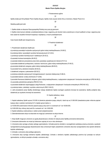 STATUT Master Pharm Spółka Akcyjna I. Postanowienia ogólne §1 Spółka działa pod firmą Master Pharm Spółka Akcyjna. Spółka może używać skrótu firmy w brzmieniu: Master Pharm S.A. §2 Siedzibą spółki jest Łódź. §3 1. Spółka działa na obszarze Rzeczypospolitej Polskiej oraz poza jej granicami. 2. Spółka może tworzyć oddziały i przedstawicielstwa w kraju i zagranicą, jak również może uczestniczyć w innych spółkach w kraju i zagranicą oraz brać udział we wszelkich formach kooperacji i współpracy z innymi przedsiębiorcami. §4 Czas trwania Spółki jest nieograniczony. II. Przedmiot działalności §5 1. Przedmiotem działalności Spółki jest: a) produkcja pozostałych artykułów spożywczych gdzie indziej niesklasyfikowana (10.89.Z), b) produkcja leków i pozostałych wyrobów farmaceutycznych (21.20.Z), c) produkcja wyrobów kosmetycznych i toaletowych (20.42.Z), d) sprzedaż hurtowa kosmetyków (46.45.Z), e) sprzedaż detaliczna prowadzona przez domy sprzedaży wysyłkowej lub internet (47.91.Z), f) pozostała działalność profesjonalna, naukowa i techniczna, gdzie indziej niesklasyfikowana (74.90.Z), g) pozostała działalność usługowa, gdzie indziej niesklasyfikowana (96.09.Z), h) pozostałe formy udzielania kredytów (64.92.Z), i) działalność związana z pakowaniem (82.92.Z), j) produkcja artykułów spożywczych homogenizowanych i żywności dietetycznej (10.86.Z), k) pozostałe badania i analizy techniczne (71.20.B), l) pozostała finansowa działalność usługowa, gdzie indziej niesklasyfikowana, z wyłączeniem ubezpieczeń i funduszów emerytalnych (PKD 64.99.Z), m) pozostałe pośrednictwo pieniężne (PKD 64.19.Z), n) pozostała działalność wspomagająca usługi finansowe, z wyłączeniem ubezpieczeń i funduszów emerytalnych (PKD 66.19.Z), o) produkcja kakao, czekolady i wyrobów cukierniczych (PKD 10.82.Z). 2. Jeśli prowadzenie przez Spółkę określonego rodzaju działalności będzie wymagać uzyskania koncesji lub zezwolenia, Spółka podejmie taką działalność po uzyskaniu koncesji lub zezwolenia. III. Kapitał zakładowy i akcje §6 1. Kapitał zakładowy Spółki wynosi 215.000 zł (dwieście piętnaście tysięcy złotych) i dzieli się na 21.500.000 (dwadzieścia jeden milionów pięćset tysięcy) akcji o wartości nominalnej 0,01 zł (jeden grosz) każda, tj.: a) 18.500.000 (osiemnaście milionów pięćset tysięcy) akcji serii A o numerach od 1 do 18.500.000, b) 3.000.000 (trzy miliony) akcji serii B o numerach od 1 do 3.000.000. 2. Kapitał zakładowy został pokryty w całości przed zarejestrowaniem. 3. Zdematerializowane akcje na okaziciela nie mogą być zamieniane na akcje imienne. §7 1. Akcje Spółki mogą być umorzone za zgodą akcjonariusza w drodze ich nabycia przez Spółkę (umorzenie dobrowolne). 2. Umorzenie dobrowolne nie może być dokonane częściej niż raz w roku obrotowym. 3. Umorzenie akcji wymaga uchwały walnego zgromadzenia. Uchwała powinna określać w szczególności podstawę prawną umorzenia, wysokość wynagrodzenia przysługującego akcjonariuszowi akcji umorzonych bądź uzasadnienie umorzenia akcji bez wynagrodzenia oraz sposób obniżenia kapitału zakładowego. 4. Uchwała o umorzeniu akcji podlega ogłoszeniu. 5. Umorzenie akcji wymaga obniżenia kapitału zakładowego. Uchwała o obniżeniu kapitału zakładowego powinna być powzięta na walnym zgromadzeniu, na którym powzięto uchwałę o umorzeniu akcji. 6. Wymogów, o których mowa w art. 456 Kodeksu spółek handlowych, nie stosuje się do umorzenia w pełni pokrytych akcji: a) gdy Spółka umarza akcje własne nabyte nieodpłatnie w celu ich umorzenia lub b) jeżeli wynagrodzenie akcjonariuszy akcji umorzonych ma być wypłacone wyłącznie z kwoty, która zgodnie z art. 348 § 1 Kodeksu spółek handlowych może być przeznaczona do podziału, lub c) gdy umorzenie następuje bez jakichkolwiek świadczeń na rzecz akcjonariuszy, z wyjątkiem przyznania im świadectw użytkowych. 7. Umorzenie akcji następuje z chwilą obniżenia kapitału zakładowego. Jednakże w przypadku określonym w ust. 6 lit. b, od chwili spełnienia świadczenia przez Spółkę na rzecz akcjonariusza, z umarzanych akcji nie można wykonywać praw udziałowych. IV. Organy spółki §8 Organami Spółki są: Zarząd, Rada Nadzorcza, Walne Zgromadzenie. A. Zarząd §9 1. W skład Zarządu wchodzi od jednego do czterech członków, w tym Prezes Zarządu. 2. Członków Zarządu, w tym Prezesa Zarządu, powołuje i odwołuje Rada Nadzorcza. 3. Kadencja Zarządu trwa trzy lata. Członkowie Zarządu powoływani są na okres wspólnej kadencji, przy czym członków pierwszego Zarządu powołuje zgromadzenie wspólników poprzednika prawnego Spółki, tj. „Master Pharm Polska" Spółka z ograniczoną odpowiedzialnością z siedzibą w Łodzi. §10 Do reprezentacji Spółki i składania oświadczeń w imieniu Spółki uprawnieni są: 1) w przypadku Zarządu jednoosobowego - Prezes Zarządu samodzielnie, 2) w przypadku Zarządu wieloosobowego – Prezes Zarządu jednoosobowo, dwaj członkowie Zarządu łącznie albo jeden członek Zarządu łącznie z prokurentem. §11 Zarząd jest uprawniony do wypłaty akcjonariuszom zaliczek na poczet przewidywanej dywidendy za rok obrotowy na zasadach określonych w Kodeksie spółek handlowych. B. Rada Nadzorcza §12 1. Członków Rady Nadzorczej powołuje i odwołuje Walne Zgromadzenie, przy czym członków pierwszej Rady Nadzorczej powołuje zgromadzenie wspólników poprzednika prawnego Spółki, tj. „Master Pharm Polska" Spółka z ograniczoną odpowiedzialnością z siedzibą w Łodzi.. 2. W skład Rady Nadzorczej wchodzi od trzech do pięciu członków, przy czym począwszy od uzyskania przez Spółkę statusu spółki publicznej Rada Nadzorcza liczy pięciu członków. 3. Kadencja członków Rady Nadzorczej trwa trzy lata. Członkowie Rady Nadzorczej powoływani są na okres wspólnej kadencji
