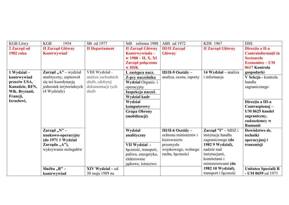 KGB Litwy 2 Zarząd od 1982 roku KGB 1954 II Zarząd Główny Kontrwywiad SB od 1977 II Departament 1 Wydział – kontrwywiad przeciw USA, Kanadzie, RFN, Wlk. Brytanii, Francji, Izraelowi, Zarząd „A” – wydział analityczny, zajmował się też koordynacją jednostek terytorialnych (4 Wydziały) VIII Wydział analiza zachodnich służb, zdobytej dokumentacji tych służb Zarząd „N” – naukowo-operacyjny (do 1971 1 Wydział Zarządu „A”), wykrywanie nielegałów Służba „R” – kontrwywiad StB reforma 1988 II Zarząd Główny Kontrwywiadu – w 1988 – II, X, XI Zarząd połączono w HSK I. zastępca nacz. Z-pcy naczelnika Wydział Organiz. i operacyjny Inspekcja naczel. Wydział kadr Wydział komputerowy Grupa Obrony (mobilizacji) ABS od 1972 III/II Zarząd Główny Wydział analityczny III/II-6 Osztály – ochrona ministerstw i kierownictw przemysłu wojskowego, wolnego ruchu, łączności VII Wydział łączność, transport, paliwa, energetyka, elektrownie jądrowe, lotnictwo XIV Wydział – od 30 maja 1989 na KDS 1967 II Zarząd Główny 14 Wydział – analiza III/II-9 Osztály – analiza, ocena, raporty i informacja Zarząd ”I” – MHZ i instytucje handlu zagranicznego (do 1982 9 Wydzial), nadzór nad instytucjami, komitetami i ministerstwami (do 1982 10 Wydział), transport i łączność DSS Direcţia a II-a Contrainformaţii in Sectoarele Economice – UM 0617 Kontrola gospodarki V Sekcja - kontrola handlu zagranicznego Direcţia a III-a Contraspionaj – UM 0625 handel zagraniczny, cudzoziemcy w Rumunii Dowództwo ds. techniki operacyjnej i transmisji Unitatea Specială R - UM 0659 od 1973 radiotechniczny; Zarząd „P” – ochrona gospodarki i zbrojeniówki, od 1982 jako VI Zarząd Zarząd „T” – bezpieczeństwo transportu, od 1981 r. jako IV Zarząd 1 Wydział – zwalczanie USA 2 Wydział – zwalczanie Wielkiej Brytanii i Wspólnoty 3 Wydział – zwalczanie Republiki Federalnej Niemiec, Austrii i krajów skandynawskich; bazie Biura „W” XV Wydział - od 30 maja 1989 na bazie Biura „W” XVI Wydział - od 30 maja 1989 na bazie Biura „W” Patrz: V Departament V Wydział – ochrona istotnych gałęzi przemysłu i rolnictwa, międzynarodowa współpraca ekonomiczna XI Wydział VI Wydział – transport MHZ, firmy i centrale handlu, przedstawicielstwa obcych firm I Wydział - USA I Wydział – USA, kraje Ameryki Łacińskiej II Wydział - Wielka III Wydział – Brytania, Kanada i Wlk. Brytania Australia Francja, europejscy członkowie NATO, ochrona FMSZ III Wydział – RFN II Wydział – RFN, Austria, ich ambasady III/II-11 Osztály – archiwa, operacyjna rejestracja, zaopatrzenie (do 1982 11 Wydział), kartoteki operacyjne (do 1982 12 Wydział), – przechwytywanie transmisji radiowych Unitatea specială S od 1973 - UM 0647 – przechwytywanie i kontrola korespondencji III/II-1 Osztály – USA i Ameryka Łacińska III/II-2 Osztály – europejscy członkowie NATO - 01 Wydział – USA III/II-3 Osztály – RFN, Austria 03 Wydział Republiki Federalnej Niemiec, Austrii, Szwajcaria, Francja 02 Wydział - Wielka Brytania i Włochy 4 Wydział – Japonia, Azja Płd.-Wschodnia, Australia 5 Wydział – Azja, Afryka, Bliski Wschód 6 Wydział – cudzoziemcy na krótkim pobycie 7 Wydział - kontrola dziennikarzy zagranicznych 8 Wydział – kraje Ameryki Łacińskiej V Wydział pracownicy europejskich państw neutralnych oraz państw Afryki, Azji, Ameryki Łacińskiej akredytowanych w Polsce, zabezpiecz. kontrwywiadowcze placówek dyplomat. państw socjalist. VII Wydział korespondenci prasy zachodniej, zachodni przedstawiciele handlowi, obozy dla uchodźców, uciekinierzy i ich powroty do kraju XV Wydział – 1981-1988 – prasa zagraniczna, Agencja Interpress (poprzednio sekcja zabezpieczenia operacyjnego dziennikarzy krajów kapitalistycznych Wydziału VII) XIII Wydział ośrodki polskiego radia i tv IV Wydział – III/II-4 Osztály działania ambasad - Środkowy i Daleki Azja, Afryka, Wschód Chiny, terroryzm, ochrona wojsk sowieckich, ucieczki zagranicę, wybrane ambasady afrykańskie i azjatyckie IX Wydział – kontrola Kościoła, wspólnot wiernych i sekt, międzynarodowe organizacje, syjoniści, przemyt literatury religijnej X Wydział – wrogie grupy - d. wróg wew.: prawicowy oportunizm, ideologie burżuazyjne, działania zagraniczne grup antysoc., wpływ wroga wewnętrznego i 07 Wydział – Azja, Afryka, Ameryka Łacińska, Izrael zagranicznego, przemyt i kolportaż bibuły, terroryzm krajowy XIV Wydział 1981 - XI Wydział – 1988 - agencje ochrona młodzieży, prasowe, sfery szkolnictwa, czasopisma, nauki, kultury, dzienniki, media sportu, zdrowia, studenci zagraniczni XVI Wydział poligrafia 9 Wydział – Francja, Benelux, Włochy, Grecja, Turcja 10 Wydział – przemyt i cinkciarze 11 Wydział: walka z terroryzmem międzynarodowym 12 Wydział – zagraniczni studenci i specjaliści 2 Wydział – turyści zagraniczni 13 Wydział – Turystyka międzynarodowa i IV Wydział Francja, Włochy, Dania, Belgia, Norwegia, Holandia Grecja, Turcja, Portugalia, Luksemburg, Izrael 04 Wydział - Turcja 05 Wydział - Grecja III/II-7 Osztály – międzynarodowe obszary współpracy III/II-10 Osztály międzynarodowa współpraca, wywiad w krajach trzecich III/II-8 Osztály – turystyka, emigranci wracający po amnestii 17 Wydział - walka z terroryzmem międzynarodowym oraz przemyt broni i narkotyków 08 Wydział – turystyka międzynarodowa i 3 Wydział obywatele sowieccy zagranicą, przemyt obywatele sowieccy zagranicą osoby w tranzycie 14 Wydział – gry operacyjne 15 Wydział – Technika operacyjna III/II-5 Osztály – działania operacyjne poza granicami IX Wydział zabezpieczenie technicznooperacyjne dla wydziałów Departamentu II, PP, PT, PTT, PTG, rkp (podsłuchy) XII Wydział – centra dywersji ideologicznej i ośrodki emigracyjne 16 Wydział - Chiny 17 Wydział – brak danych VI Wydział ochrona kontrwyw