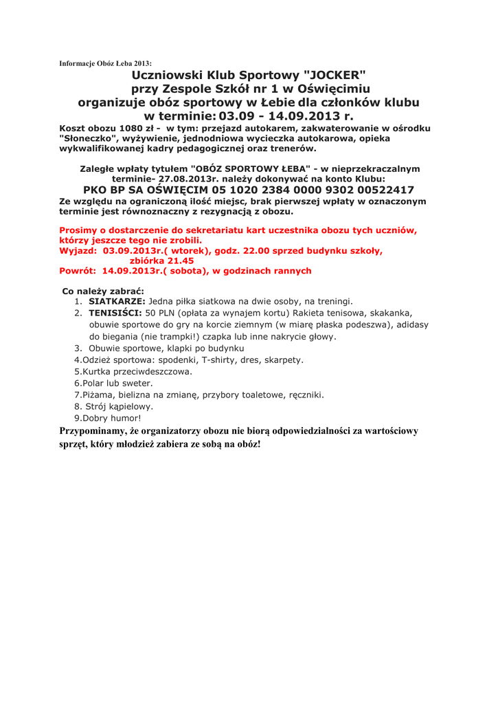 Informacje Obóz Łeba 2013: Uczniowski Klub Sportowy "JOCKER" przy Zespole Szkół nr 1 w Oświęcimiu organizuje obóz sportowy w Łebie dla członków klubu w terminie: 03.09 - 14.09.2013 r. Koszt obozu 1080 zł - w tym: przejazd autokarem, zakwaterowanie w ośrodku "Słoneczko", wyżywienie, jednodniowa wycieczka autokarowa, opieka wykwalifikowanej kadry pedagogicznej oraz trenerów. Zaległe wpłaty tytułem "OBÓZ SPORTOWY ŁEBA" - w nieprzekraczalnym terminie- 27.08.2013r. należy dokonywać na konto Klubu: PKO BP SA OŚWIĘCIM 05 1020 2384 0000 9302 00522417 Ze względu na ograniczoną ilość miejsc, brak pierwszej wpłaty w oznaczonym terminie jest równoznaczny z rezygnacją z obozu. Prosimy o dostarczenie do sekretariatu kart uczestnika obozu tych uczniów, którzy jeszcze tego nie zrobili. Wyjazd: 03.09.2013r.( wtorek), godz. 22.00 sprzed budynku szkoły, zbiórka 21.45 Powrót: 14.09.2013r.( sobota), w godzinach rannych Co należy zabrać: 1. SIATKARZE: Jedna piłka siatkowa na dwie osoby, na treningi. 2. TENISIŚCI: 50 PLN (opłata za wynajem kortu) Rakieta tenisowa, skakanka, obuwie sportowe do gry na korcie ziemnym (w miarę płaska podeszwa), adidasy do biegania (nie trampki!) czapka lub inne nakrycie głowy. 3. Obuwie sportowe, klapki po budynku 4.Odzież sportowa: spodenki, T-shirty, dres, skarpety. 5.Kurtka przeciwdeszczowa. 6.Polar lub sweter. 7.Piżama, bielizna na zmianę, przybory toaletowe, ręczniki. 8. Strój kąpielowy. 9.Dobry humor! Przypominamy, że organizatorzy obozu nie biorą odpowiedzialności za wartościowy sprzęt, który młodzież zabiera ze sobą na obóz!