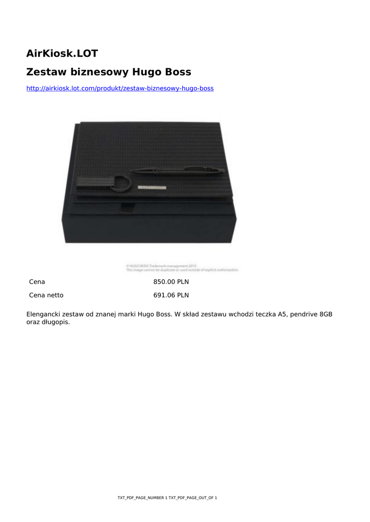 AirKiosk.LOT Zestaw biznesowy Hugo Boss http://airkiosk.lot.com/produkt/zestaw-biznesowy-hugo-boss Cena 850.00 PLN Cena netto 691.06 PLN Elengancki zestaw od znanej marki Hugo Boss. W skład zestawu wchodzi teczka A5, pendrive 8GB oraz długopis. TXT_PDF_PAGE_NUMBER 1 TXT_PDF_PAGE_OUT_OF 1
