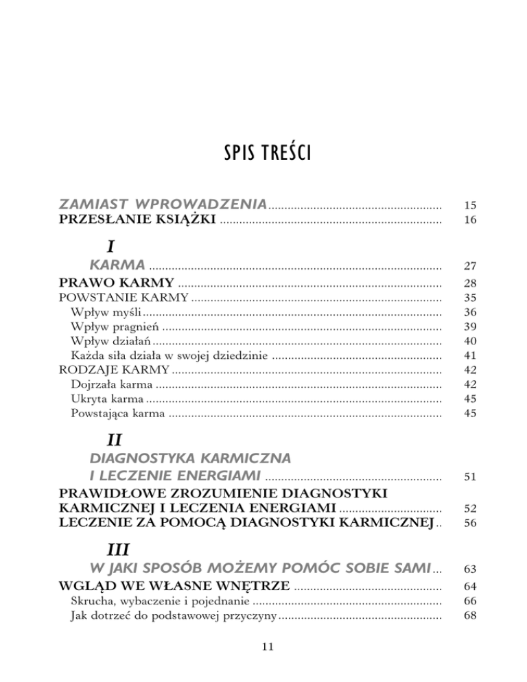 I KARMA SPIS TREŚCI ZAMIAST WPROWADZENIA ...................................................... PRZESŁANIE KSIĄŻKI ..................................................................... 15 16 I KARMA ........................................................................................... 27 PRAWO KARMY .................................................................................. 28 35 36 39 40 41 42 42 45 45 POWSTANIE KARMY .............................................................................. Wpływ myśli ............................................................................................. Wpływ pragnień ....................................................................................... Wpływ działań .......................................................................................... Każda siła działa w swojej dziedzinie ..................................................... RODZAJE KARMY .................................................................................... Dojrzała karma ......................................................................................... Ukryta karma ............................................................................................ Powstająca karma ..................................................................................... II DIAGNOSTYKA KARMICZNA I LECZENIE ENERGIAMI ....................................................... 51 PRAWIDŁOWE ZROZUMIENIE DIAGNOSTYKI KARMICZNEJ I LECZENIA ENERGIAMI ................................ LECZENIE ZA POMOCĄ DIAGNOSTYKI KARMICZNEJ .. 52 56 III W JAKI SPOSÓB MOŻEMY POMÓC SOBIE SAMI ... 63 WGLĄD WE WŁASNE WNĘTRZE .............................................. 64 66 68 Skrucha, wybaczenie i pojednanie ........................................................... Jak dotrzeć do podstawowej przyczyny ................................................... 11 SPIS TREŚCI PROCES TRANSFORMACJI ........................................................... POSTĘPOWANIE ...................................................................................... WARUNKI NIEZBĘDNE DO ROZWIĄZYWANIA PROBLEMÓW . 71 71 74 Podjęcie decyzji / Wzięcie odpowiedzialności / Spokojne miejsce / Oddychanie / Skoncentrowanie się na określonej sytuacji lub problemie / Cierpliwość / Wybaczenie / Sytuacyjne rozwiązywanie problemów / Pomoc przy zmienianiu siebie PRZYCZYNY NIEPOWODZENIA TERAPII ........................................ Przeciwna motywacja ............................................................................... ...i inne przyczyny .................................................................................... Szybki proces samopomocy ..................................................................... 79 81 83 86 IV ŚWIADOME I PODŚWIADOME ODCZUWANIE SIEBIE I ŚRODOWISKA ........................................................... AGRESJA .................................................................................................. ŚWIADOMA AGRESJA ............................................................................ PODŚWIADOMA AGRESJA ................................................................... Sposoby powstawania agresji ................................................................... SZKODLIWE PROGRAMY W PODŚWIADOMOŚCI .......... PRZYCZYNY TKWIĄCE W NASZEJ PODŚWIADOMOŚCI ............. 89 90 91 93 94 101 103 Złość / Pretensje, obraza / Osądzanie / Obmowa / Odmowa miłości / Żal, obraza / Traumy i negatywne doświadczenia / Świadome negatywne programowanie / Wampiryzm energetyczny / Łączenie pól żywych i zmarłych / Samobójstwo / Aborcja PRZYCZYNY ZEWNĘTRZNE ................................................................. 108 Programy z poprzednich wcieleń / Programy naszych przodków / Programy z okresu ciąży matki / Programy społeczeństwa i środowiska / Programy idoli / Programy nauczycieli duchowych, guru / Programy przywódców, dyrektorów / Szkodliwa żywność i napoje REZONANS PODOBNYCH PROGRAMÓW W PODŚWIADOMOŚCI .......................................................................... 111 V PODŚWIADOME UZALEŻNIENIA ..................................... 115 INNE UZALEŻNIENIA ...................................................................... 116 12 SPIS TREŚCI W JAKI SPOSÓB ODNALEŹĆ WŁASNE UZALEŻNIENIA NA POZIOMIE PODŚWIADOMOŚCI ................................................... NAJCZĘSTSZE PODŚWIADOME UZALEŻNIENIA ........................... 118 119 Jestem najlepszy i odnoszę sukcesy / Mam rację i się nie mylę / Idealizowanie wszystkiego co nas otacza / Idealizowanie partnera / Potrzeba uznania / Nadmierne dążenie do posiadania dóbr materialnych / Uzależnienie od seksu / Uzależnienie od dzieci / Uzależnienie od zdolności / Uzależnienie od duchowości i wiary / Uzależnienie od nauczyciela, grupy ludzi, sekty / Życie przeszłością / Życie przyszłością / Bycie doskonałym VI CO WPŁYWA NA TO, KIM JESTEŚMY W CHWILI OBECNEJ ............................................................... 139 CIAŁO I OSOBOWOŚĆ ..................................................................... KIM I DLACZEGO JESTEŚMY TU I TERAZ ...................................... WPŁYWY PRZED I W CHWILI POCZĘCIA ....................................... Wpływy niematerialne ............................................................................. 140 142 144 147 Wpływy kosmiczne (astrologia wedyjska) / Archetypy / Świadomość zbiorowa / Wzorce myślowe / Wpływ istot duchowych / Wpływ świadomości Ziemi ŻYCIE W ŁONIE MATKI I NARODZINY ............................................ 153 Okres po poczęciu / Pierwsze ruchy / Okres przed urodzeniem / Narodziny WPŁYW RODZICÓW W OKRESIE CIĄŻY ......................................... TRAUMY Z OKRESU PORODU ............................................................ WYDARZENIA W ŻYCIU ................................