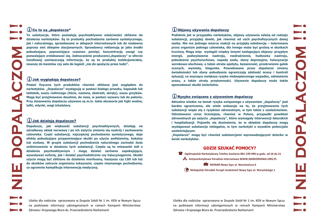 Co to są „dopalacze” Objawy używania dopalaczy To substancje, które posiadają psychoaktywne właściwości zbliżone do działania narkotyków. Są to produkty pochodzenia zarówno syntetycznego, jak i naturalnego, sprzedawane w sklepach internetowych lub do niedawna poprzez sieć sklepów stacjonarnych. Sprzedawcy reklamują je jako środki pobudzające, poprawiające czasowo pamięć, koncentrację uwagi czy pozwalające zrelaksować się. Jednocześnie producenci„dopalaczy” w ofercie handlowej zamieszczają informacje, że są to produkty kolekcjonerskie, nawozy do kwiatów czy sole do kąpieli „nie do spożycia przez ludzi”. Podobnie jak w przypadku narkotyków, objawy używania zależą od rodzaju substancji, przyjętej dawki, jak również od cech psychofizycznych danej osoby. Nie ma jednego wzorca reakcji na przyjętą substancję – tolerowana przez organizm jednego człowieka, dla innego może być groźną w skutkach trucizną. Mogą więc wystąpić między innymi następujące objawy: przypływ energii, podwyższenie nastroju, rozdrażnienie, huśtawka nastroju, pobudzenie psychoruchowe, napady szału, stany depresyjne, halucynacje wzrokowo-słuchowe, a także utrata apetytu, bezsenność, przekrwienie gałek ocznych, wymioty, biegunka. Powodowane przez dopalacze zmiany świadomości lub stany pobudzenia ograniczają zdolność oceny i kontroli sytuacji, co znacząco zwiększa ryzyko niebezpiecznego wypadku, odniesienia urazu, a także utraty przytomności. Używanie dopalaczy może także spowodować skutki śmiertelne. Jak wyglądają dopalacze? Postać fizyczna tych produktów również zbliżona jest wyglądem do narkotyków. „Dopalacze” występują w postaci białego proszku, kapsułek lub tabletek, suszu roślinnego (liście, nasiona, ekstrakt, skręty), suszu grzybów. Mogą być przyjmowane doustnie, do nosa, w postaci wywaru lub do palenia. Przy stosowaniu dopalaczy używane są m.in. takie akcesoria jak fajki wodne, lufki, młynki, wagi inhalatory. Jak działają dopalacze? Dopalacze, jak większość substancji psychoaktywnych, działają na ośrodkowy układ nerwowy i po ich zażyciu zmienia się nastrój i zachowanie człowieka. Część substancji, najczęściej pochodzenia syntetycznego, daje efekty pobudzające przypominające skutki po użyciu amfetaminy, kokainy lub ecstasy. W grupie substancji pochodzenia naturalnego zachodzi duże zróżnicowanie w działaniu tych substancji. Często są to mieszanki ziół o działaniu psychoaktywnym i mogą działać zarówno uspokajająco, wywoływać euforię, jak i działać psychodelicznie czy halucynogennie. Skutki użycia mogą być zbliżone do działania marihuany, haszyszu czy LSD lub też do skutków zatrucia organizmu toksynami, często nieznanego pochodzenia, co ogromnie komplikuje interwencję medyczną. Ulotka dla rodziców opracowana w Zespole Szkół Nr 1 im. KEN w Nowym Sączu na podstawie informacji udostępnionych w ramach Kampanii Ministerstwa Zdrowia i Krajowego Biura ds. Przeciwdziałania Narkomanii Ryzyko związane z używaniem dopalaczy Aktualna wiedza na temat ryzyka związanego z używaniem „dopalaczy” jest bardzo ograniczona, ale wiele wskazuje na to, że przyjmowanie tych substancji wiąże się z ryzykiem zdrowotnym, w tym także z uzależnieniem. Odnotowano coraz liczniejsze, również w Polsce, przypadki powikłań zdrowotnych po zażyciu „dopalaczy”, które wymagały interwencji lekarskich i hospitalizacji. Pojawiły się doniesienia, że w składzie dopalaczy mogą występować substancje nielegalne, w tym narkotyki o wysokim potencjale uzależniającym. „Dopalacze” mogą być również substancjami wprowadzającymi dziecko w świat narkotyków. GDZIE SZUKAĆ POMOCY? Ogólnopolski Narkotykowy Telefon Zaufania 801-199-990 w godz. od 16 do 21 Antynarkotykowa Poradnia Internetowa WWW.NARKOMANIA.ORG.PL MONAR Nowy Sącz ul. Narutowicza 6 Małopolski Ośrodek Terapii Uzależnień Nowy Sącz ul. Waryńskiego 1 Ulotka dla rodziców opracowana w Zespole Szkół Nr 1 im. KEN w Nowym Sączu na podstawie informacji udostępnionych w ramach Kampanii Ministerstwa Zdrowia i Krajowego Biura ds. Przeciwdziałania Narkomanii