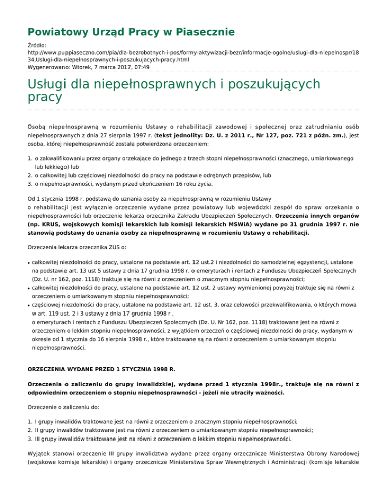 Powiatowy Urząd Pracy w Piasecznie Źródło: http://www.puppiaseczno.com/pia/dla-bezrobotnych-i-pos/formy-aktywizacji-bezr/informacje-ogolne/uslugi-dla-niepelnospr/18 34,Uslugi-dla-niepelnosprawnych-i-poszukujacych-pracy.html Wygenerowano: Wtorek, 7 marca 2017, 07:49 Usługi dla niepełnosprawnych i poszukujących pracy Osobą niepełnosprawną w rozumieniu Ustawy o rehabilitacji zawodowej i społecznej oraz zatrudnianiu osób niepełnosprawnych z dnia 27 sierpnia 1997 r. (tekst jednolity: Dz. U. z 2011 r., Nr 127, poz. 721 z późn. zm.), jest osoba, której niepełnosprawność została potwierdzona orzeczeniem: 1. o zakwalifikowaniu przez organy orzekające do jednego z trzech stopni niepełnosprawności (znacznego, umiarkowanego lub lekkiego) lub 2. o całkowitej lub częściowej niezdolności do pracy na podstawie odrębnych przepisów, lub 3. o niepełnosprawności, wydanym przed ukończeniem 16 roku życia. Od 1 stycznia 1998 r. podstawą do uznania osoby za niepełnosprawną w rozumieniu Ustawy o rehabilitacji jest wyłącznie orzeczenie wydane przez powiatowy lub wojewódzki zespół do spraw orzekania o niepełnosprawności lub orzeczenie lekarza orzecznika Zakładu Ubezpieczeń Społecznych. Orzeczenia innych organów (np. KRUS, wojskowych komisji lekarskich lub komisji lekarskich MSWiA) wydane po 31 grudnia 1997 r. nie stanowią podstawy do uznania osoby za niepełnosprawną w rozumieniu Ustawy o rehabilitacji. Orzeczenia lekarza orzecznika ZUS o: ● całkowitej niezdolności do pracy, ustalone na podstawie art. 12 ust.2 i niezdolności do samodzielnej egzystencji, ustalone na podstawie art. 13 ust 5 ustawy z dnia 17 grudnia 1998 r. o emeryturach i rentach z Funduszu Ubezpieczeń Społecznych (Dz. U. nr 162, poz. 1118) traktuje się na równi z orzeczeniem o znacznym stopniu niepełnosprawności; ● całkowitej niezdolności do pracy, ustalone na podstawie art. 12 ust. 2 ustawy wymienionej powyżej traktuje się na równi z orzeczeniem o umiarkowanym stopniu niepełnosprawności; ● częściowej niezdolności do pracy, ustalone na podstawie art. 12 ust. 3, oraz celowości przekwalifikowania, o których mowa w art. 119 ust. 2 i 3 ustawy z dnia 17 grudnia 1998 r . o emeryturach i rentach z Funduszu Ubezpieczeń Społecznych (Dz. U. Nr 162, poz. 1118) traktowane jest na równi z orzeczeniem o lekkim stopniu niepełnosprawności, z wyjątkiem orzeczeń o częściowej niezdolności do pracy, wydanym w okresie od 1 stycznia do 16 sierpnia 1998 r., które traktowane są na równi z orzeczeniem o umiarkowanym stopniu niepełnosprawności. ORZECZENIA WYDANE PRZED 1 STYCZNIA 1998 R. Orzeczenia o zaliczeniu do grupy inwalidzkiej, wydane przed 1 stycznia 1998r., traktuje się na równi z odpowiednim orzeczeniem o stopniu niepełnosprawności - jeżeli nie utraciły ważności. Orzeczenie o zaliczeniu do: 1. I grupy inwalidów traktowane jest na równi z orzeczeniem o znacznym stopniu niepełnosprawności; 2. II grupy inwalidów traktowane jest na równi z orzeczeniem o umiarkowanym stopniu niepełnosprawności; 3. III grupy inwalidów traktowane jest na równi z orzeczeniem o lekkim stopniu niepełnosprawności. Wyjątek stanowi orzeczenie III grupy inwalidztwa wydane przez organy orzecznicze Ministerstwa Obrony Narodowej (wojskowe komisje lekarskie) i organy orzecznicze Ministerstwa Spraw Wewnętrznych i Administracji (komisje lekarskie MSWiA). Traktowane jest ono jako orzeczenie o braku niepełnosprawności, ponieważ dotyczy osób zdolnych do pracy poza służbą. Zakwalifikowanie do lekkiego stopnia niepełnosprawności może mieć miejsce tylko wtedy, gdy orzeczenie o III grupie inwalidztwa z tytułu niezdolności do służby mundurowej zawiera równocześnie orzeczenie III grupy inwalidztwa z ogólnego stanu zdrowia. Osoby o stałej albo długotrwałej niezdolności do pracy w gospodarstwie rolnym uznaje się za niepełnosprawne, z tym że: 1. osoby, którym przysługuje zasiłek pielęgnacyjny, traktuje się jako zaliczone do znacznego stopnia niepełnosprawności; 2. pozostałe osoby traktuje się jako zaliczone do lekkiego stopnia niepełnosprawności. Podstawa prawna Ustawa o rehabilitacji zawodowej i społecznej oraz zatrudniania osób niepełnosprawnych (otwierany w nowym oknie) (Dz. U. z 2011 nr 127 poz. 721) Metryka strony 09.01.2015 Rejestr zmian Osoba publikująca: Karol Wiśniewski Autor: Karol Wiśniewski Liczba wejść: 988 Drukuj Generuj PDF Powiadom znajomego Wstecz