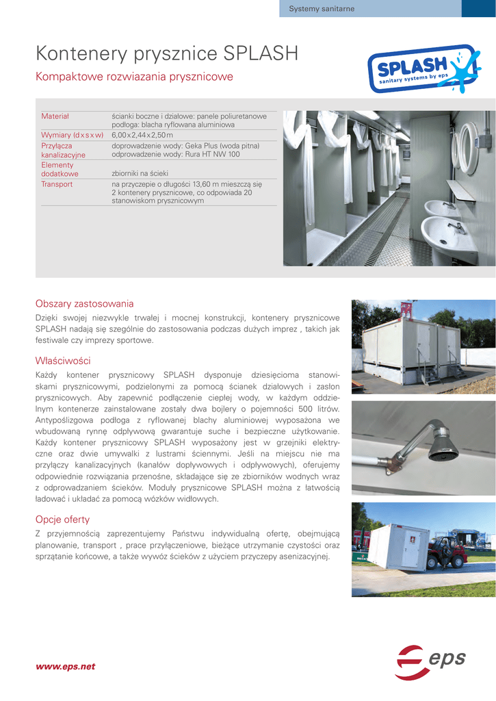 Systemy sanitarne Kontenery prysznice SPLASH Kompaktowe rozwiazania prysznicowe Materiał Wymiary (d x s x w) Przyłącza kanalizacyjne Elementy dodatkowe Transport ścianki boczne i działowe: panele poliuretanowe podłoga: blacha ryflowana aluminiowa 6,00 x 2,44 x 2,50 m doprowadzenie wody: Geka Plus (woda pitna) odprowadzenie wody: Rura HT NW 100 zbiorniki na ścieki na przyczepie o długości 13,60 m mieszczą się 2 kontenery prysznicowe, co odpowiada 20 stanowiskom prysznicowym Obszary zastosowania Dzięki swojej niezwykle trwałej i mocnej konstrukcji, kontenery prysznicowe SPLASH nadają się szególnie do zastosowania podczas dużych imprez , takich jak festiwale czy imprezy sportowe. Właściwości Każdy kontener prysznicowy SPLASH dysponuje dziesięcioma stanowiskami prysznicowymi, podzielonymi za pomocą ścianek działowych i zasłon prysznicowych. Aby zapewnić podłączenie ciepłej wody, w każdym oddzielnym kontenerze zainstalowane zostały dwa bojlery o pojemności 500 litrów. Antypoślizgowa podłoga z ryflowanej blachy aluminiowej wyposażona we wbudowaną rynnę odpływową gwarantuje suche i bezpieczne użytkowanie. Każdy kontener prysznicowy SPLASH wyposażony jest w grzejniki elektryczne oraz dwie umywalki z lustrami ściennymi. Jeśli na miejscu nie ma przyłączy kanalizacyjnych (kanałów dopływowych i odpływowych), oferujemy odpowiednie rozwiązania przenośne, składające się ze zbiorników wodnych wraz z odprowadzaniem ścieków. Moduły prysznicowe SPLASH można z łatwością ładować i układać za pomocą wózków widłowych. Opcje oferty Z przyjemnością zaprezentujemy Państwu indywidualną ofertę, obejmującą planowanie, transport , prace przyłączeniowe, bieżące utrzymanie czystości oraz sprzątanie końcowe, a także wywóz ścieków z użyciem przyczepy asenizacyjnej. www.eps.net Systemy sanitarne Kontenery prysznice SPLASH Zastosowania Kontenery prysznicowe SPLASH, teren zu sceną, Hurricane Festival Każda kabina prysznicowa posiada zasłonę i mydelniczkę Kontener prysznicowy SPLASH ze zbiornikiem na ścieki Łatwy montaż za pomocą wózka widłowego © eps Wieszaki na ubrania i kosmetyczki w kontenerze prysznicowym Kontakt i więcej informacji: [email protected]