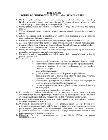 REGULAMIN BOISKA DO PIŁKI NOŻNEJ PRZY UL. ADM. STEYERA W HELU. 1. Boisko do piłki nożnej ze sztuczną nawierzchnią przy ul. Adm. Steyera, zwane dalej Boiskiem, administrowane jest przez Zespół Zakładów Obsługi Miasta w Helu z siedzibą przy ul. Kuracyjnej 3, zwanego dalej ZZOM. 2. Osoby przebywające na Boisku i korzystający z niego nie pozostają pod opieką ZZOM. 3. ZZOM nie ponosi żadnej odpowiedzialności za wypadki osób przebywających na w/w terenie. 4. ZZOM udostępnia boisko nieodpłatnie w każdym dniu tygodnia (poza specjalnymi rezerwacjami) od świtu do zmierzchu. 5. Rezerwacji boiska należy dokonywać z dwudniowym wyprzedzeniem w ZZOM. 6. Z boiska należy korzystać zgodnie z jego przeznaczeniem w sposób niezagrażający innym użytkownikom boiska, nie doprowadzając do uszkodzeń powierzchni boiska. 7. Wszelkie uwagi i usterki należy zgłaszać w ZZOM. 8. Osoby przebywające na terenie obiektu sportowego zobowiązane są do zachowania porządku i przestrzegania powyższego regulaminu. 9. Za wszelkie szkody odpowiada materialnie osoba, która wyrządziła szkodę lub jej prawni opiekunowie. 10. Zabrania się: palenia tytoniu, wnoszenia i spożywania alkoholu i innych używek, korzystania z obiektu i ich urządzeń niezgodnie z przeznaczeniem, niszczenia urządzeń i sprzętu znajdującego się na obiekcie i terenach przyległych, wprowadzania zwierząt, przeskakiwania oraz wchodzenia przez i na płoty i bramki, korzystania z boiska w obuwiu niesportowym oraz jazdy rowerem, wrotkach, i innym podobnym sprzęcie, wchodzenia i przebywania na boisku w stanie wskazującym na spożycie alkoholu oraz środków odurzających, wnoszenia pojemników do rozpylania gazów, substancji żrących lub farbujących, naruszania innych przepisów porządkowych, 11. Korzystający z Boiska zobowiązani są do używania strojów sportowych oraz odpowiedniego obuwia sportowego. Wprowadza się bezwzględny zakaz używania obuwia piłkarskiego z kołkami wkręcanymi (metalowymi lub plastikowymi). 12. Obsługa Boiska może kontrolować wszystkie zajęcia, a w razie uchybień zakazać dalszego korzystania z Boiska. 13. Wszystkich użytkowników Boiska i osób przebywających na jego terenie i w miejscach przeznaczonych dla widzów i zawodników rezerwowych obowiązuje ścisłe przestrzeganie przepisów przeciwpożarowych, przepisów BHP oraz zachowanie porządku i czystości na obiekcie sportowym i w jego bezpośrednim otoczeniu oraz przestrzeganie powyższego regulaminu. 14. UWAGA! Za rzeczy pozostawione na terenie Boiska ZZOM nie ponosi odpowiedzialności.