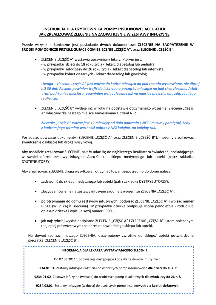 INSTRUKCJA DLA UŻYTKOWNIKA POMPY INSULINOWEJ ACCU-CHEK JAK ZREALIZOWAĆ ZLECENIE NA ZAOPATRZENIE W ZESTAWY INFUZYJNE Przede wszystkim konieczne jest posiadanie dwóch dokumentów: ZLECENIE NA ZAOPATRZENIE W ŚRODKI POMOCNICZE PRZYSŁUGUJĄCE COMIESIĘCZNIE „CZĘŚĆ A”, oraz ZLECENIE „CZĘŚĆ B”. · ZLECENIE „CZĘŚĆ A” wystawia uprawniony lekarz, którym jest: - w przypadku dzieci do 18 roku życia - lekarz diabetolog lub pediatra, - w przypadku młodzieży do 26 roku życia - lekarz diabetolog lub internista, - w przypadku kobiet ciężarnych - lekarz diabetolog lub ginekolog. Uwaga – zlecenie „część A” jest ważne do końca miesiąca na jaki zostało wystawione, nie dłużej niż 30 dni! Pacjent powinien trafić do lekarza na początku miesiąca na jaki chce zlecenie. Jeżeli trafi pod koniec miesiąca, powninien wziąć zlecenie już na miesiąc przyszły, aby zdążyć z jego realizacją. · ZLECENIE „CZĘŚĆ B” wydaje raz w roku na podstawie otrzymanego wcześniej Zlecenia „Część A” właściwy dla naszego miejsca zamieszkania Oddział NFZ. Zlecenie „Część B” ważne jest 12 miesięcy od dnia pobrania z NFZ i musimy pamiętać, żeby z końcem jego terminu ważności pobrać z NFZ kolejne, na kolejny rok. Posiadając powyższe dokumenty (ZLECENIE „CZĘŚĆ A” oraz ZLECENIE „CZĘŚĆ B”), możemy zrealizować świadczenie osobiście lub drogą wysyłkową. Aby osobiście zrealizować ZLECENIE, należy udać się do najbliższego Realizatora świadczeń, posiadającego w swojej ofercie zestawy infuzyjne Accu-Chek - sklepu medycznego lub apteki (patrz zakładka DYSTRYBUTORZY). Aby zrealizować ZLECENIE drogą wysyłkową i otrzymać towar bezpośrednio do domu należy: · zadzwonić do sklepu medycznego lub apteki (patrz zakładka DYSTRYBUTORZY), · złożyć zamówienie na zestawy infuzyjne zgodnie z wpisem ze ZLECENIA „CZĘŚĆ A”, · po otrzymaniu do domu zestawów infuzyjnych, podpisać ZLECENIE „CZĘŚĆ A” i wpisać numer PESEL (w IV. części zlecenia). W przypadku dziecka podpisuje osoba pełnoletnia - rodzic lub opiekun dziecka i wpisuje swój numer PESEL, · jak najszybciej wysłać podpisane ZLECENIE „CZĘŚĆ A” i ZLECENIE „CZĘŚĆ B” listem poleconym (najlepiej priorytetowym) na adres odpowiedniego sklepu lub apteki. Na dowód realizacji naszego ZLECENIA, otrzymujemy zwrotnie od sklepu/ apteki potwierdzone pieczątką ZLECENIE „CZĘŚĆ B”. INFORMACJA DLA LEKARZA WYSTAWIAJĄCEGO ZLECENIE Od 07.03.2011r. obowiązują następujące kody dla zestawów infuzyjnych: 9234.01.01- Zestawy infuzyjne (wkłucia) do osobistych pomp insulinowych dla dzieci do 18 r. ż. 9234.01.02- Zestawy infuzyjne (wkłucia) do osobistych pomp insulinowych dla młodzieży do 26 r. ż. 9234.02.01- Zestawy infuzyjne (wkłucia) do osobistych pomp insulinowych dla kobiet ciężarnych.