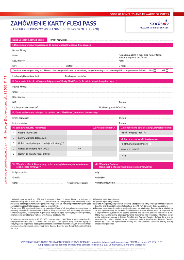 ZAMÓWIENIE KARTY FLEXI PASS (FORMULARZ PROSIMY WYPEŁNIAĆ DRUKOWANYMI LITERAMI) Dane Doradcy Klienta Sodexo Imię i nazwisko:.......................................................................................................................................................................................... I. Dane podmiotu zamawiającego do dokumentów finansowo-księgowych: Nazwa Firmy: ............................................................................................................................................................................................................................................................... Ulica: ........................................................................................................................................................................... Na podany adres e-mail oraz numer faksu zostanie wysłana pro forma: Kod, miasto: .............................................................................................................................................................. Faks: .................................................................................... NIP: .............................................................................. Telefon: ........................................................................... E-mail: ................................................................................. www.sodexomotywacja.pl, e-mail: [email protected], tel.: 22 535 11 11 Oświadczenie na potrzeby art. 28b ust. 2 ustawy o VAT – dot. podatników, zarejestrowanych na potrzeby VAT poza granicami Polski* Liczba użytkowników Kart: ...................................... TAK NIE Liczba pracowników: ........................... II. Dane podmiotu, do którego należy przesłać Karty Flexi Pass (o ile różnią się od danych z części I): Nazwa Firmy: ............................................................................................................................................................................................................................................................... Ulica: .............................................................................................................................................................................................................................................................................. Kod, miasto: ................................................................................................................................................................................................................................................................ NIP: ............................................................................................................................................................................. Telefon: ................................................................................ Liczba punktów doręczeń: ..................................................................................................... Liczba użytkowników Kart: ................................................................................ III. Dane osób upoważnionych do odbioru Kart Flexi Pass (minimum dwie osoby): Imię i nazwisko: ........................................................................................................................................................ Telefon: ................................................................................ Imię i nazwisko: ........................................................................................................................................................ Telefon: ................................................................................ IV. Zamawiam Karty Flexi Pass: A Łączna liczba Kart: B Łączna wartość doładowań: C Opłata manipulacyjna (1 miejsce dostawy) (3): D Opłata za wydanie Kart (A*D): E Razem do zapłaty (poz. B+C+D) Wartość łącznie (PLN) V. Proponowana data dostawy Kart/doładowania: (dzień – miesiąc – rok) (1): ............................................ VI. Karty proszę zasilić i aktywować: Po otrzymaniu należności: 6 zł Konkretna data (2): ........................................................ Uwagi: VII. W ypełnia Klient: Dane osoby, która sporządziła niniejsze zamówienie oraz pieczęć firmowa: (4) VIII. W ypełnia Sodexo: Dane osoby, która przyjęła niniejsze zamówienie: Imię i nazwisko: ........................................................................................................... Imię: ............................................................................................................................... E-mail: ........................................................................... Nazwisko: ..................................................................................................................... Data: .............................................................................. Pieczęć firmowa i podpis Numer zamówienia: .................................................................................................... * Oświadczenie w myśl art. 28b ust. 2 ustawy z dnia 11 marca 2004 r. o podatku od towarów i usług (Dz. U. z 2011 r. nr 117, poz 1054 ze zm.) o wykorzystaniu zakupionej usługi związanej z obsługą systemu funkcjonowania Kuponów lub Kart dla potrzeb stałego miejsca prowadzenia działalności gospodarczej na terenie Polski. Zaznaczenie TAK oznacza deklarację, że zakupione Kupony lub Karty będą wykorzystane na potrzeby działalności prowadzonej w Polsce. Przy zaznaczeniu NIE lub żadnej odpowiedzi, Sodexo przyjmuje, że zakupione Kupony lub Karty nie będą wykorzystywane na potrzeby działalności prowadzonej w Polsce, czyli faktura ze stawką NP. 1)Zgodnie z pkt 3 regulaminu. 2)Zgodnie z pkt 4 regulaminu. 3) Opłata manipulacyjna pokrywa dostawę, ubezpieczenie Kart, operacje fina