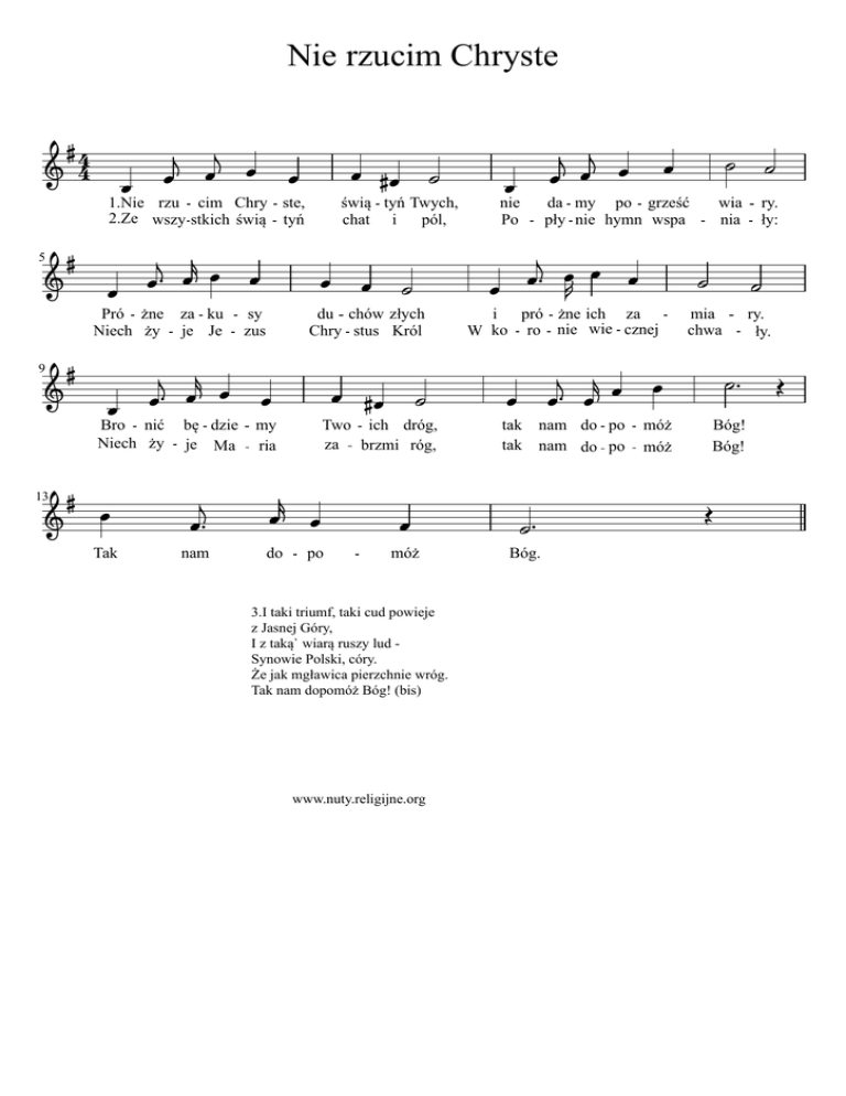 Nie rzucim Chryste 4 1.Nie rzu cim Chry ste, 2.Ze wszy stkich świą tyń 5 Pró żne za ku Niech ży je Je 9 Bro nić Niech ży sy zus świą tyń Twych, chat i pól, du chów złych Chry stus Król bę dzie my je Ma ria Two ich dróg, za brzmi róg, nie Po Tak nam do po móż 3.I taki triumf, taki cud powieje z Jasnej Góry, I z taką` wiarą ruszy lud Synowie Polski, córy. Że jak mgławica pierzchnie wróg. Tak nam dopomóż Bóg! (bis) www.nuty.religijne.org da my po grześć pły nie hymn wspa i pró żne ich za W ko ro nie wie cznej tak nam do po tak nam do po 13 Bóg. wia nia ry. ły: mia chwa móż móż Bóg! Bóg! ry. ły.