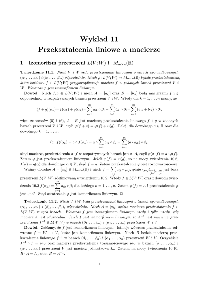 Wyklad 11 Przeksztalcenia liniowe a macierze 1 Izomorfizm przestrzeni L(V ; W ) i Mm×n (R) Twierdzenie 11.1. Niech V i W bed , , a, przestrzeniami liniowymi o bazach uporzadkowanych (α1 , . . . , αn ) i (β1 , . . . , βm ) odpowiednio. Niech ϕ : L(V ; W ) → Mm×n (R) bedzie przekszta lceniem, , które każdemu f ∈ L(V ; W ) przyporzadkowuje macierz f w podanych bazach przestrzeni V i , W . Wówczas ϕ jest izomorfizmem liniowym. Dowód. Niech f, g ∈ L(V ; W ) i niech A = [aij ] oraz B = [bij ] bed , a, macierzami f i g odpowiednio, w rozpatrywanych bazach przestrzeni V i W . Wtedy dla k = 1, . . . , n mamy, że (f + g)(αk ) = f (αk ) + g(αk ) = m X aik ◦ βi + i=1 m X bik ◦ βi = i=1 m X (aik + bik ) ◦ βi , i=1 wiec, ze wzorów (5) i (6), A + B jest macierza, przeksztalcenia liniowego f + g w zadanych , bazach przestrzeni V i W , czyli ϕ(f + g) = ϕ(f ) + ϕ(g). Dalej, dla dowolnego a ∈ R oraz dla dowolnego k = 1, . . . , n (a · f )(αk ) = a ◦ f (αk ) = a ◦ m X aik ◦ βi = i=1 m X (a · aik ) ◦ βi , i=1 skad , macierza, przeksztalcenia a · f w rozpatrywanych bazach jest a · A, czyli ϕ(a · f ) = a · ϕ(f ). Zatem ϕ jest przeksztalceniem liniowym. Jeżeli ϕ(f ) = ϕ(g), to na mocy twierdzenia 10.6, f (α) = g(α) dla dowolnego α ∈ V , skad przeksztalcenie ϕ jest różnowartościowe. , f = g. Zatem X Weźmy dowolne A = [aij ] ∈ Mm×n (R) i niech f = aij ◦ ϕij , gdzie (ϕij )i=1,...,m jest baza, i,j j=1,...,n przestrzeni L(V ; W ) zdefiniowana, w twierdzeniu 10.2. Wtedy f ∈ L(V ; W ) oraz z dowodu twierm X dzenia 10.2 f (αk ) = aik ◦ βi dla każdego k = 1, . . . , n. Zatem ϕ(f ) = A i przeksztalcenie ϕ i=1 jest ,,na”. Stad , ostatecznie ϕ jest izomorfizmem liniowym. 2 Twierdzenie 11.2. Niech V i W bed , , a, przestrzeniami liniowymi o bazach uporzadkowanych (α1 , . . . , αn ) i (β1 , . . . , βn ), odpowiednio. Niech A = [aij ] bedzie macierz a przekszta lcenia f ∈ , , L(V ; W ) w tych bazach. Wówczas f jest izomorfizmem liniowym wtedy i tylko wtedy, gdy macierz A jest odwracalna. Jeżeli f jest izomorfizmem liniowym, to A−1 jest macierza, przeksztalcenia f −1 ∈ L(W ; V ) w bazach (β1 , . . . , βn ) i (α1 , . . . , αn ) przestrzeni W i V . Dowód. Zalóżmy, że f jest izomorfizmem liniowym. Istnieje wówczas przeksztalcenie odwrotne f −1 : W → V , które jest izomorfizmem liniowym. Niech B bedzie macierza, prze, −1 ksztalcenia liniowego f w bazach (β1 , . . . , βn ) i (α1 , . . . , αn ) przestrzeni W i V . Oczywiście −1 f ◦ f = idV oraz macierza, przeksztalcenia tożsamościowego idV w bazach (α1 , . . . , αn ) i (α1 , . . . , αn ) przestrzeni V jest macierz jednostkowa In . Zatem, na mocy twierdzenia 10.10, −1 B · A = In , skad , B =A . 1 Na odwrót, zalóżmy, że macierz A jest odwracalna. Istnieje wtedy macierz B ∈ Mn (R) taka, że B ·A = A·B = In . Z twierdzenia 11.1 istnieje przeksztalcenie g ∈ L(W ; V ), którego macierza, w bazach (β1 , . . . , βn ) i (α1 , . . . , αn ) przestrzeni W i V jest B. Z twierdzenia 10.10 otrzymujemy zatem, że In = B · A jest macierza, przeksztalcenia g ◦ f w bazach (α1 , . . . , αn ) i (α1 , . . . , αn ) przestrzeni V , skad , g ◦ f = idV . Ponadto z twierdzenia 10.10, In = A · B jest macierza, przeksztalcenia f ◦ g w bazach (β1 , . . . , βn ) i (β1 , . . . , βn ) przestrzeni W . Stad , f ◦ g = idW . −1 Zatem g = f i f jest izomorfizmem liniowym. 2 2 Macierz przejścia Niech (α1 , . . . , αn ) i (α10 , . . . , αn0 ) bed bazami przestrzeni linio, , a, dwiema uporzadkowanymi a1i wej V . Niech dla i = 1, . . . , n, ... bedzie wektorem wspólrzednych wektora αi0 w bazie , , ani (α1 , . . . , αn ), tzn. αi0 = a1i ◦ α1 + . . . + ani ◦ αi . Wówczas macierz kwadratowa, a11 a12 . . . a1n a21 a22 . . . a2n A= . .. .. .. ∈ Mn (R) . . . .. (1) an1 an2 . . . ann nazywamy macierza, przejścia od bazy (α1 , . . . , αn ) do bazy (α10 , . . . , αn0 ). Równoważnie, A jest macierza, przeksztalcenia tożsamościowego idV : V → V w bazach (α10 , . . . , αn0 ) i (α1 , . . . , αn ) przestrzeni V . Ponieważ idV jest izomorfizmem liniowym, wiec , z twierdzeń 11.2 i 10.6 uzyskujemy od razu nastepuj ace , , Twierdzenie 11.3. Macierz przejścia A od bazy (α1 , . . . , αn ) do bazy (α10 , . . . , αn0 ) przestrzeni liniowej V jest macierza, odwracalna, i A−1 jest macierza, przejścia od bazy (α10 , . . . , αn0 ) do bazy a1 (α1 , . . . , αn ). Jeżeli ... jest wektorem wspólrzednych wektora α ∈ V w bazie (α1 , . . . , αn ), , an to A−1 a1 .. · . jest wektorem wspólrzednych wektora α w bazie (α10 , . . . , αn0 ). 2 , an Przyklad 11.4. Zalóżmy, że (α1 , . . . , αn ) jest baza, przestrzeni Rn oraz αi = [ai1 , ai2 , . . . , ain ] dla i = 1, . . . , n. Wówczas macierza, przejścia od bazy kanonicznej (ε1 , . . . , εn ) do bazy a11 a21 . . . an1 a12 a22 . . . an2 (α1 , . . . , αn ) jest A = .. .. .. .. . Np. dla n = 3, macierza, przejścia od bazy . . . . a1n a2n . . . ann 2 1 0 0 (ε1 , ε2 , ε3 ) do bazy ([1, 1, 1], [0, 1, 2], [0, 0, 1]) jest 1 1 0 . 2 1 2 1 Twierdzenie 11.5. Zalóżmy, że (α1 , . . . , αn ), (α10 , . . . , αn0 ), (α1 ”, . . . , αn ”) sa, bazami przestrzeni liniowej V . Jeżeli A jest macierza, przejścia od bazy (α1 , . . . , αn ) do bazy (α10 , . . . , αn0 ) oraz B jest macierza, przejścia od bazy (α10 , . . . , αn0 ) do bazy (α1 ”, . . . , αn ”), to A·B jest macierza, przejścia od bazy (α1 , . . . , αn ) do bazy (α1 ”, . . . , αn ”). Dowd. Niech f : V → V bedzie przeksztalceniem liniowym danym wzorem f (α) = α dla , α ∈ V . Wtedy A jest macierza, f w bazach (α10 , . . . , αn0 ) i (α1 , . . . , αn ). Niech g : V → V bedzie przeksztalceniem liniowym danym wzorem g(α) = α dla α ∈ V . Wtedy B jest macierza, , g w bazach (α1 ”, . . . , αn ”) i (α10 , . . . , αn0 ). Wówczas z twierdzenia 10.10, A · B jest macierza, przek