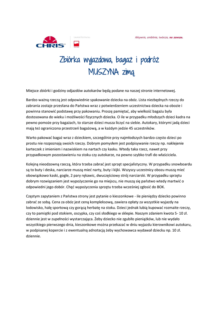 Zbiórka wyjazdowa, bagaż i podróż MUSZYNA zimą Miejsce zbiórki i godziny odjazdów autokarów będą podane na naszej stronie internetowej. Bardzo ważną rzeczą jest odpowiednie spakowanie dziecka na obóz. Lista niezbędnych rzeczy do zabrania zostaje przesłana do Państwa wraz z potwierdzeniem uczestnictwa dziecka na obozie i powinna stanowić podstawę przy pakowaniu. Proszę pamiętać, aby wielkość bagażu była dostosowana do wieku i możliwości fizycznych dziecka. O ile w przypadku młodszych dzieci kadra na pewno pomoże przy bagażach, to starsze dzieci musza liczyć na siebie. Autokary, którymi jadą dzieci mają też ograniczona przestrzeń bagażową, a w każdym jedzie 45 uczestników. Warto pakować bagaż wraz z dzieckiem, szczególnie przy najmłodszych bardzo często dzieci po prostu nie rozpoznają swoich rzeczy. Dobrym pomysłem jest podpisywanie rzeczy np. naklejenie karteczek z imieniem i nazwiskiem na nartach czy kasku. Wtedy taka rzecz, nawet przy przypadkowym pozostawieniu na stoku czy autokarze, na pewno szybko trafi do właściciela. Kolejną nieodzowną rzeczą, która trzeba zabrać jest sprzęt specjalistyczny. W przypadku snowboardu są to buty i deska, narciarze muszą mieć narty, buty i kijki. Wszyscy uczestnicy obozu muszą mieć obowiązkowo kaski, gogle, 2 pary rękawic, dwuczęściowy strój narciarski. W przypadku sprzętu dobrym rozwiązaniem jest wypożyczenie go na miejscu, nie muszą się państwo wtedy martwić o odpowiedni jego dobór. Chęć wypożyczenia sprzętu trzeba wcześniej zgłosić do BOK. Częstym zapytaniem z Państwa strony jest pytanie o kieszonkowe - ile pieniędzy dziecko powinno zabrać ze sobą. Cena za obóz jest ceną kompleksową, zawiera opłaty za wszystkie wyjazdy na lodowisko, halę sportową czy gorącą herbatę na stoku. Dzieci jednak lubią kupować rozmaite rzeczy, czy to pamiątki pod stokiem, oscypka, czy coś słodkiego w sklepie. Naszym zdaniem kwota 5- 10 zł. dziennie jest w zupełności wystarczająca. Żeby dziecko nie zgubiło pieniążków, lub nie wydało wszystkiego pierwszego dnia, kieszonkowe można przekazać w dniu wyjazdu kierownikowi autokaru, w podpisanej kopercie i z ewentualną adnotacją żeby wychowawca wydawał dziecku np. 10 zł. dziennie.