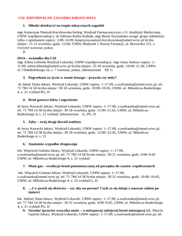 CSI: KRYMINALNE ZAGADKI WROCŁAWIA 1. Młodzi detektywi na tropie toksycznych zagadek mgr Katarzyna Namysł-Kuczkowska biolog, Wydział Farmaceutyczny z O. Analityki Medycznej, UMW współprowadzący: dr Adriana Kubis-Kubiak, mgr Beata Szymańska uwagi: grupy młodzieży tylko z opiekunem zapisy: 3.08–14.09, [email protected] liczba miejsc: 15 12 września, godz. 12:00, UMW, Budynek 1 Nowej Farmacji, ul. Borowska 211, s. ćwiczeń warsztat, pokaz 2. DNA – światełko dla CSI mgr Arleta Lebioda Wydział Lekarski, UMW współprowadzący: mgr Anna Jonkisz zapisy: 1– 11.09, [email protected] liczba miejsc: 25 18 września, godz. 10:00–11:30, UMW, ul. Chałubińskiego 2a, s. 7 warsztat, pokaz, laboratorium SP, G 3. Pogrzebani za życia w stanie letargu – prawda czy mity? dr Jakub Trnka lekarz, Wydział Lekarski, UMW zapisy: 1–17.09, [email protected], tel. 71 784 14 58 liczba miejsc: 30 18 września, godz. 10:00–10:45, UMW, ul. Mikulicza-Radeckiego 4, s. 21 wykład PG, D 4. Broń gazowa fakty i zagrożenia dr Jerzy Kawecki lekarz, Wydział Lekarski, UMW zapisy: 1–17.09, [email protected], tel. 71 784 14 58 liczba miejsc: 30 18 września, godz. 11:00–11:45, UMW, ul. MikuliczaRadeckiego 4, s. 21 wykład, laboratorium G, PG, D 5. Zęby – twój drugi dowód osobisty dr Jerzy Kawecki lekarz, Wydział Lekarski, UMW zapisy: 1–17.09, [email protected], tel. 71 784 14 58 liczba miejsc: 30 18 września, godz. 12:00–12:45, UMW, ul. MikuliczaRadeckiego 4, s. 21 6. Anatomia wypadku drogowego lek. Wojciech Golema lekarz, Wydział Lekarski, UMW zapisy: 1–17.09, [email protected], tel. 71 784 14 58 liczba miejsc: 30 21 września, godz. 9:00–9:45 UMW, ul. Mikulicza-Radeckiego 4, s. 21 wykład 7. Mam gaz – ewolucja broni pneumatycznej od początku do czasów współczesnych lek. Wojciech Golema lekarz, Wydział Lekarski, UMW zapisy: 1–17.09, [email protected], tel. 71 784 14 58 liczba miejsc: 30 21 września, godz. 10:00–10:45, UMW, ul. Mikulicza-Radeckiego 4, s. 23 wykład G, D 8. ...I w proch się obrócisz – czy aby na pewno? Czyli co się dzieje z naszym ciałem po śmierci lek. Jędrzej Siuta lekarz, Wydział Lekarski, UMW zapisy: 1–17.09, [email protected], tel. 71 784 14 58 liczba miejsc: 30 22 września, godz. 9:00–9:45, UMW, ul. Mikulicza-Radeckiego 4, s. 21 wykład PG, D 9. Strzelać (prawie) wszystko może – o nietypowej zabójczej broni miotającej lek. Marcin Gęsicki lekarz, Wydział Lekarski, UMW zapisy: 1–17.09, [email protected], tel. 71 784 14 58 liczba miejsc: 30 22 września, godz. 10:00–10:45, UMW, ul. MikuliczaRadeckiego 4, s. 21 10. Dlaczego i jak umieramy? lek. Patryk Pilecki lekarz, Wydział Lekarski, UMW zapisy: 1–17.09, [email protected], tel. 71 784 14 58 liczba miejsc: 30 22 września, godz. 11:00–11:45, UMW, ul. MikuliczaRadeckiego 4, s. 21 wykład PG, D 11. CSI – symulacja miejsca zbrodni dr Łukasz Szleszkowski lekarz, Wydział Lekarski, UMW współprowadzący: mgr Agata Thannhauser, lek. Aleksander Krzywulski zapisy: 1–17.09, [email protected], tel. 71 784 14 58 liczba miejsc: 30 23 września, godz. 9:00–10:00, 10:00–11:00, 11:00–12:00, UMW, ul. Mikulicza-Radeckiego 4, s. 21
