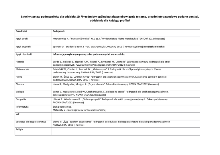 Szkolny zestaw podręczników dla oddziału 1D /Przedmioty ogólnokształcące obowiązują te same, przedmioty zawodowe podano poniżej, oddzielnie dla każdego profilu/ Przedmiot Podręcznik Język polski Mrowcewicz K.: ”Przeszłość to dziś” KL.1 cz. I / Wydawnictwo Piotra Marciszuka STENTOR/ 2012 (i nowsze) Język angielski Spencer D. : Student’s Book 2 - GATEWAY plus /MCMILLAN/ 2012 (i nowsze wydanie) (niebieska okładka) Język niemiecki Informację o wybranym podręczniku poda nauczyciel we wrześniu. Historia Burda B., Halczak B., Józefiak R.M., Roszak A., Szymczak M.: „Historia” Zakres podstawowy. Podręcznik dla szkół ponadgimnazjalnych /Wydawnictwo Pedagogiczne OPERON/ 2012 (i nowsze) Matematyka Babiański W., Chańko L., Ponczek D.: „Matematyka” 1 Podręcznik dla szkół ponadgimnazjalnych. Zakres podstawowy i rozszerzony / NOWA ERA/ 2012 (i nowsze) Fizyka Braun M., Śliwa W.: „Odkryć fizykę” Podręcznik dla szkół ponadgimnazjalnych. Kształcenie ogólne w zakresie podstawowym/NOWA ERA/ 2012 (i nowsze) Chemia Hassa R., Mrzigod A., Mrzigod J.: „To jest chemia”. Zakres Podstawowy / NOWA ERA/ 2012 (i nowsze) Biologia Bonar E., Krzeszowiec-Jeleń W., Czachorowski S.: „Biologia na czasie” Podręcznik dla szkół ponadgimazjalnych. Zakres podstawowy / NOWA ERA/ 2012 (i nowsze) Geografia Uliszak R., Wiedermann K.: „Oblicza geografii” Podręcznik dla szkół ponadgimnazjalnych. Zakres podstawowy /NOWA ERA/ 2012 (i nowsze) Informatyka Brak podręcznika. Materiały e - learningowe w formie elektronicznej WF Edukacja dla bezpieczeństwa Religia Słoma J.: „Żyję i działam bezpiecznie” Podręcznik do edukacji dla bezpieczeństwa dla szkół ponadgimnazjalnych / NOWA ERA/ 2012 (i nowsze) Wychowanie do życia w rodzinie Informację o wybranym podręczniku poda nauczyciel we wrześniu. TECHNIKUM MECHANICZNE PRZEDMIOTY ZAWODOWE Podstawy konstrukcji maszyn i maszynoznawstwo Informację o wybranym podręczniku poda nauczyciel we wrześniu. Technologia Informację o wybranym podręczniku poda nauczyciel we wrześniu. Pracownia podstaw konstrukcji maszyn Informację o wybranym podręczniku poda nauczyciel we wrześniu. Pracownia technologii Informację o wybranym podręczniku poda nauczyciel we wrześniu. Wychowanie do życia w rodzinie Informację o wybranym podręczniku poda nauczyciel we wrześniu. TECHNIKUM MECHATRONICZNE PRZEDMIOTY ZAWODOWE Podstawy mechatroniki Informację o wybranym podręczniku poda nauczyciel we wrześniu. Technologie i konstrukcje mechaniczne Informację o wybranym podręczniku poda nauczyciel we wrześniu. Urządzenia i systemy mechatroniczne Informację o wybranym podręczniku poda nauczyciel we wrześniu. Montaż urządzeń i systemów mechatronicznych Informację o wybranym podręczniku poda nauczyciel we wrześniu. Pracownia technologii i konstrukcji maszyn Informację o wybranym podręczniku poda nauczyciel we wrześniu. Pracownia montażu urządzeń i systemów mechatronicznych Informację o wybranym podręczniku poda nauczyciel we wrześniu. Szkolny zestaw podręczników dla oddziału 1I Przedmiot Podręcznik Język polski Mrowcewicz K.: „Przeszłość to dziś” KL.1 cz. I / Wydawnictwo Piotra Marciszuka STENTOR/ 2012 (i nowsze) Język angielski Spencer D. : Student’s Book 2 - GATEWAY plus /MCMILLAN/ 2012 (i nowsze wydanie) (niebieska okładka) Język niemiecki Informację o wybranym podręczniku poda nauczyciel we wrześniu. Historia Burda B., Halczak B., Józefiak R.M., Roszak A., Szymczak M.: „Historia”Zakres podstawowy. Podręcznik dla szkół ponadgimnazjalnych /Wydawnictwo Pedagogiczne OPERON/ 2012 (i nowsze) Matematyka Babiański W., Chańko L. Ponczek D.: „Matematyka”1 Podręcznik dla szkół ponadgimnazjalnych. Zakres podstawowy i rozszerzony / NOWA ERA/ 2012 (i nowsze) Fizyka Braun M., Śliwa W.: „Odkryć fizykę” Podręcznik dla szkół ponadgimnazjalnych. Kształcenie ogólne w zakresie podstawowym/NOWA ERA/ 2012 (i nowsze) Chemia Hassa R., Mrzigod A., Mrzigod J.: „To jest chemia”. Zakres Podstawowy / NOWA ERA/ 2012 (i nowsze) Biologia Bonar E., Krzeszowiec-Jeleń W., Czachorowski S.: „Biologia na czasie”Podręcznik dla szkół ponadgimazjalnych. Zakres podstawowy / NOWA ERA/ 2012 (i nowsze) Geografia Uliszak R., Wiedermann K.: „Oblicza geografii”Podręcznik dla szkół ponadgimnazjalnych. Zakres podstawowy /NOWA ERA/ 2012 (i nowsze) Informatyka Bez podręcznika Materiały e-learningowe w formie elektronicznej WF Edukacja dla bezpieczeństwa Słoma J.: „Żyję i działam bezpiecznie” Podręcznik do edukacji dla bezpieczeństwa dla szkół ponadgimnazjalnych / NOWA ERA/ 2012 (i nowsze) Religia Montowanie i eksploatowanie komputerów osobistych oraz urządzeń peryferyjnych (moduł) Kwalifikacja E12 Bezpieczeństwo i higiena pracy przy komputerze (moduł) Kowalski T.: "Kwalifikacja E.12. Montaż i eksploatacja komputerów osobistych oraz urządzeń peryferyjnych". Podręcznik do nauki zawodu technik informatyk. / HELION EDUKACJA/ 2012 (i nowsze) Informację o wybranym podręczniku poda nauczyciel we wrześniu. Projektowanie lokalnych sieci informatycznych i administrowanie nimi (moduł) Kwalifikacja E13 Wychowanie do życia w rodzinie Halska B., Bensel P.: "Kwalifikacja E.13. Projektowanie lokalnych sieci komputerowych i administrowanie sieciami. Podręcznik do nauki zawodu technik informaty / HELION EDUKACJA/ 2012 (i nowsze) Informację o wybranym podręczniku poda nauczyciel we wrześniu. Szkolny zestaw podręczników dla oddziału 1K Przedmiot Podręcznik Język polski Mrowcewicz K.: „Przeszłość to dziś” KL.1 cz. I / Wydawnictwo Piotra Marciszuka STENTOR/ 2012 (i nowsze) Język angielski Spencer D. : Student’s Book 2 - GATEWAY plus /MCMILLAN/ 2012 (i nowsze wydanie) (niebieska okładka) Język niemiecki Informację o wybranym podręczniku poda nauczyciel we wrześniu. Historia Burda B., Halczak B., Józefiak R.M., Roszak A., Szymczak M.: „Historia”Zakres po