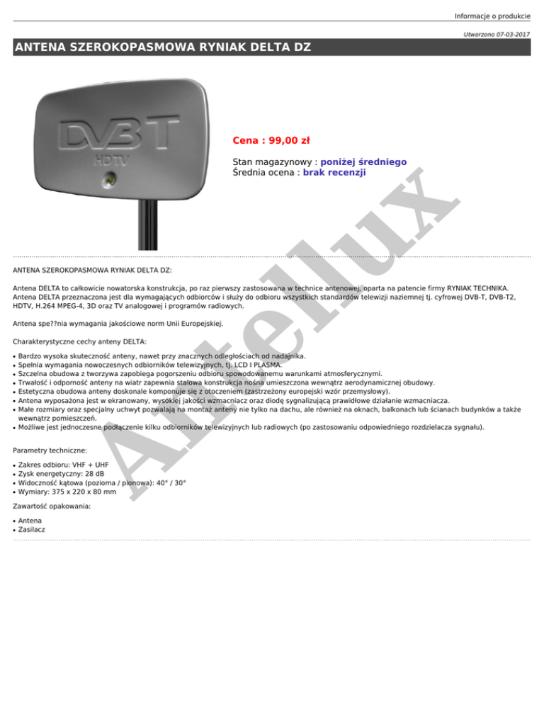 Informacje o produkcie Utworzono 07-03-2017 ANTENA SZEROKOPASMOWA RYNIAK DELTA DZ Cena : 99,00 zł ANTENA SZEROKOPASMOWA RYNIAK DELTA DZ: lu x Stan magazynowy : poniżej średniego Średnia ocena : brak recenzji te l Antena DELTA to całkowicie nowatorska konstrukcja, po raz pierwszy zastosowana w technice antenowej, oparta na patencie firmy RYNIAK TECHNIKA. Antena DELTA przeznaczona jest dla wymagających odbiorców i służy do odbioru wszystkich standardów telewizji naziemnej tj. cyfrowej DVB-T, DVB-T2, HDTV, H.264 MPEG-4, 3D oraz TV analogowej i programów radiowych. Antena spe??nia wymagania jakościowe norm Unii Europejskiej. Charakterystyczne cechy anteny DELTA: ● ● ● ● ● ● ● Bardzo wysoka skuteczność anteny, nawet przy znacznych odległościach od nadajnika. Spełnia wymagania nowoczesnych odbiorników telewizyjnych, tj. LCD I PLASMA. Szczelna obudowa z tworzywa zapobiega pogorszeniu odbioru spowodowanemu warunkami atmosferycznymi. Trwałość i odporność anteny na wiatr zapewnia stalowa konstrukcja nośna umieszczona wewnątrz aerodynamicznej obudowy. Estetyczna obudowa anteny doskonale komponuje się z otoczeniem (zastrzeżony europejski wzór przemysłowy). Antena wyposażona jest w ekranowany, wysokiej jakości wzmacniacz oraz diodę sygnalizującą prawidłowe działanie wzmacniacza. Małe rozmiary oraz specjalny uchwyt pozwalają na montaż anteny nie tylko na dachu, ale również na oknach, balkonach łub ścianach budynków a także wewnątrz pomieszczeń. Możliwe jest jednoczesne podłączenie kilku odbiorników telewizyjnych lub radiowych (po zastosowaniu odpowiedniego rozdzielacza sygnału). An ● Parametry techniczne: ● ● ● ● Zakres odbioru: VHF + UHF Zysk energetyczny: 28 dB Widoczność kątowa (pozioma / pionowa): 40° / 30° Wymiary: 375 x 220 x 80 mm Zawartość opakowania: ● ● Antena Zasilacz