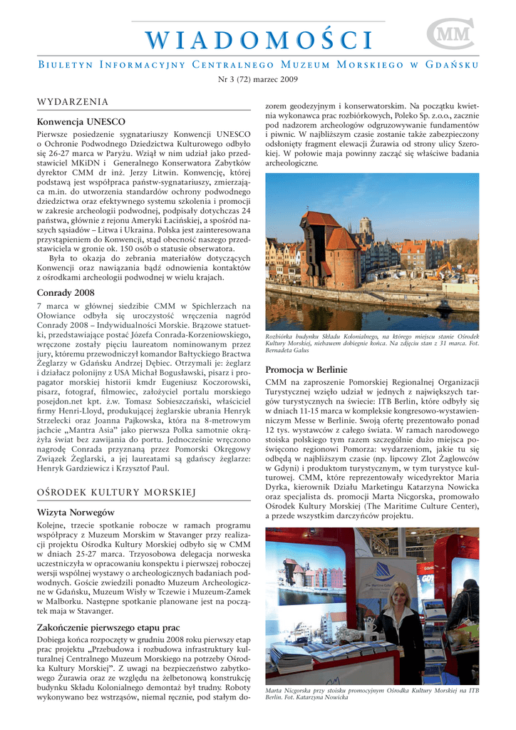 WIADOMOŚCI BIULETYN INFORMACYJNY CENTRALNEGO MUZEUM MORSKIEGO W GDAŃSKU Nr 3 (72) marzec 2009 WYDA RZENIA Konwencja UNESCO Pierwsze posiedzenie sygnatariuszy Konwencji UNESCO o Ochronie Podwodnego Dziedzictwa Kulturowego odbyło się 26-27 marca w Paryżu. Wziął w nim udział jako przedstawiciel MKiDN i Generalnego Konserwatora Zabytków dyrektor CMM dr inż. Jerzy Litwin. Konwencję, której podstawą jest współpraca państw-sygnatariuszy, zmierzająca m.in. do utworzenia standardów ochrony podwodnego dziedzictwa oraz efektywnego systemu szkolenia i promocji w zakresie archeologii podwodnej, podpisały dotychczas 24 państwa, głównie z rejonu Ameryki Łacińskiej, a spośród naszych sąsiadów – Litwa i Ukraina. Polska jest zainteresowana przystąpieniem do Konwencji, stąd obecność naszego przedstawiciela w gronie ok. 150 osób o statusie obserwatora. Była to okazja do zebrania materiałów dotyczących Konwencji oraz nawiązania bądź odnowienia kontaktów z ośrodkami archeologii podwodnej w wielu krajach. zorem geodezyjnym i konserwatorskim. Na początku kwietnia wykonawca prac rozbiórkowych, Poleko Sp. z.o.o., zacznie pod nadzorem archeologów odgruzowywanie fundamentów i piwnic. W najbliższym czasie zostanie także zabezpieczony odsłonięty fragment elewacji Żurawia od strony ulicy Szerokiej. W połowie maja powinny zacząć się właściwe badania archeologiczne. Conrady 2008 7 marca w głównej siedzibie CMM w Spichlerzach na Ołowiance odbyła się uroczystość wręczenia nagród Conrady 2008 – Indywidualności Morskie. Brązowe statuetki, przedstawiające postać Józefa Conrada-Korzeniowskiego, wręczone zostały pięciu laureatom nominowanym przez jury, któremu przewodniczył komandor Bałtyckiego Bractwa Żeglarzy w Gdańsku Andrzej Dębiec. Otrzymali je: żeglarz i działacz polonijny z USA Michał Bogusławski, pisarz i propagator morskiej historii kmdr Eugeniusz Koczorowski, pisarz, fotograf, filmowiec, założyciel portalu morskiego posejdon.net kpt. ż.w. Tomasz Sobieszczański, właściciel fi rmy Henri-Lloyd, produkującej żeglarskie ubrania Henryk Strzelecki oraz Joanna Pajkowska, która na 8-metrowym jachcie „Mantra Asia” jako pierwsza Polka samotnie okrążyła świat bez zawijania do portu. Jednocześnie wręczono nagrodę Conrada przyznaną przez Pomorski Okręgowy Związek Żeglarski, a jej laureatami są gdańscy żeglarze: Henryk Gardziewicz i Krzysztof Paul. OŚRODEK KULTU RY M O RS K I E J Wizyta Norwegów Rozbiórka budynku Składu Kolonialnego, na którego miejscu stanie Ośrodek Kultury Morskiej, niebawem dobiegnie końca. Na zdjęciu stan z 31 marca. Fot. Bernadeta Galus Promocja w Berlinie CMM na zaproszenie Pomorskiej Regionalnej Organizacji Turystycznej wzięło udział w jednych z największych targów turystycznych na świecie: ITB Berlin, które odbyły się w dniach 11-15 marca w kompleksie kongresowo-wystawienniczym Messe w Berlinie. Swoją ofertę prezentowało ponad 12 tys. wystawców z całego świata. W ramach narodowego stoiska polskiego tym razem szczególnie dużo miejsca poświęcono regionowi Pomorza: wydarzeniom, jakie tu się odbędą w najbliższym czasie (np. lipcowy Zlot Żaglowców w Gdyni) i produktom turystycznym, w tym turystyce kulturowej. CMM, które reprezentowały wicedyrektor Maria Dyrka, kierownik Działu Marketingu Katarzyna Nowicka oraz specjalista ds. promocji Marta Nicgorska, promowało Ośrodek Kultury Morskiej (The Maritime Culture Center), a przede wszystkim darczyńców projektu. Kolejne, trzecie spotkanie robocze w ramach programu współpracy z Muzeum Morskim w Stavanger przy realizacji projektu Ośrodka Kultury Morskiej odbyło się w CMM w dniach 25-27 marca. Trzyosobowa delegacja norweska uczestniczyła w opracowaniu konspektu i pierwszej roboczej wersji wspólnej wystawy o archeologicznych badaniach podwodnych. Goście zwiedzili ponadto Muzeum Archeologiczne w Gdańsku, Muzeum Wisły w Tczewie i Muzeum-Zamek w Malborku. Następne spotkanie planowane jest na początek maja w Stavanger. Zakończenie pierwszego etapu prac Dobiega końca rozpoczęty w grudniu 2008 roku pierwszy etap prac projektu „Przebudowa i rozbudowa infrastruktury kulturalnej Centralnego Muzeum Morskiego na potrzeby Ośrodka Kultury Morskiej”. Z uwagi na bezpieczeństwo zabytkowego Żurawia oraz ze względu na żelbetonową konstrukcję budynku Składu Kolonialnego demontaż był trudny. Roboty wykonywano bez wstrząsów, niemal ręcznie, pod stałym do- Marta Nicgorska przy stoisku promocyjnym Ośrodka Kultury Morskiej na ITB Berlin. Fot. Katarzyna Nowicka WSPÓŁ PRACA Z ZAG RAN I CĄ Projekt Seaside Realizowany przez CMM wraz z 12 partnerami z Niemiec, Szwecji i Litwy projekt Seaside (finansowany przez EFRR w ramach programu Południowy Bałtyk) nabiera rozpędu. 18 i 19 marca w Säro w Szwecji odbyło się czwarte już spotkanie, w którym ze strony CMM uczestniczyli: Katarzyna Nowicka, Jadwiga Klim, Tomasz Bednarz i Paweł Lassota. W trakcie spotkania omówiono m.in. kwestie logo i zawartości strony internetowej projektu oraz plan i metody działań marketingowych. Z kolei zebranie grupy muzealnej, której głównym zadaniem jest przygotowanie wspólnej wystawy, poświęcone zostało ostatecznym ustaleniom dotyczącym struktury i terminów prezentacji wystawy w poszczególnych muzeach (w CMM od września do listopada 2010 r.) oraz języków, w których sporządzone będą teksty. Drugi dzień spotkania poświęcono na wizytę na targach turystycznych w Göteborgu – największej tego typu imprezie w Szwecji, gdzie była okazja do poznania zróżnicowanych metod promocji oraz nawiązania nowych kontaktów. Morski krajobraz kulturowy W dniach 11-13 marca dr Robert Domżał i Marcin Kłos z Działu Historii Budownictwa Okrętowego wzięli udział w konferencji naukowej „Morski krajobraz kulturowy”, zorganizowanej w Kaliningradzie w ramach projektu „Crossroads – Lagoons as the cultural and histori