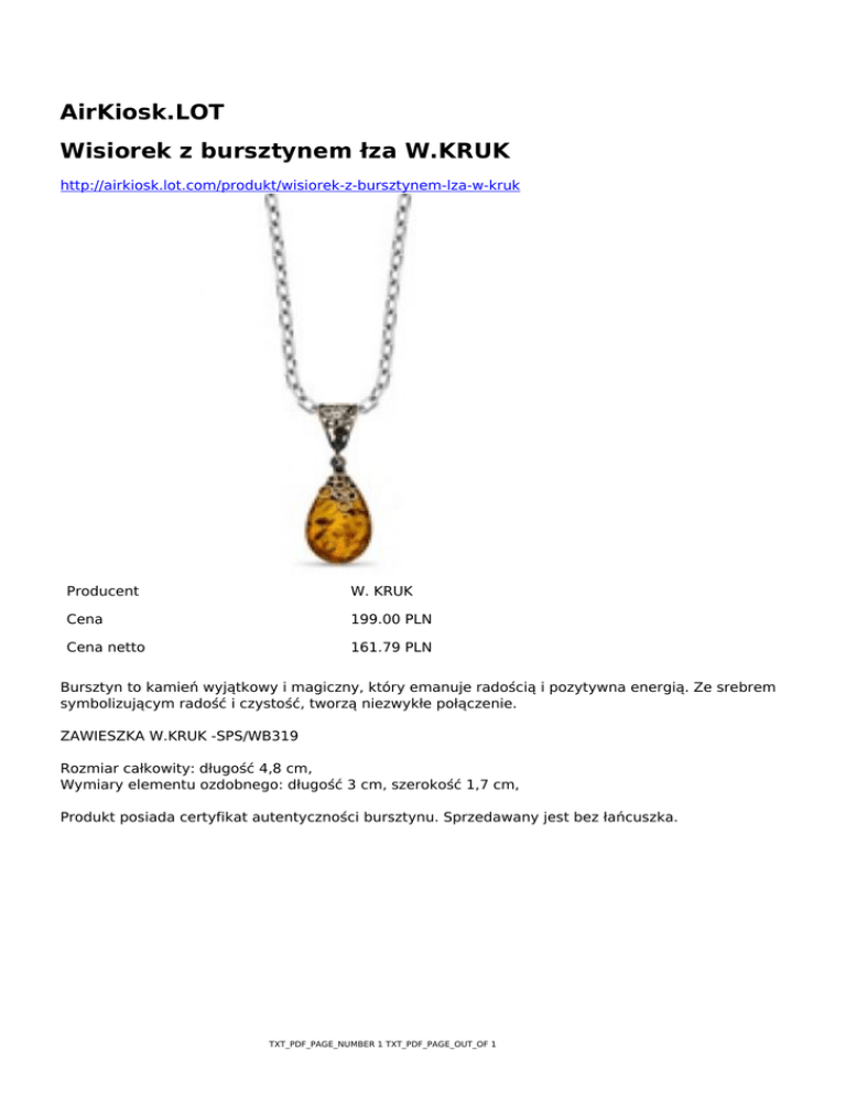 AirKiosk.LOT Wisiorek z bursztynem łza W.KRUK http://airkiosk.lot.com/produkt/wisiorek-z-bursztynem-lza-w-kruk Producent W. KRUK Cena 199.00 PLN Cena netto 161.79 PLN Bursztyn to kamień wyjątkowy i magiczny, który emanuje radością i pozytywna energią. Ze srebrem symbolizującym radość i czystość, tworzą niezwykłe połączenie. ZAWIESZKA W.KRUK -SPS/WB319 Rozmiar całkowity: długość 4,8 cm, Wymiary elementu ozdobnego: długość 3 cm, szerokość 1,7 cm, Produkt posiada certyfikat autentyczności bursztynu. Sprzedawany jest bez łańcuszka. TXT_PDF_PAGE_NUMBER 1 TXT_PDF_PAGE_OUT_OF 1