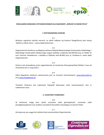 REGULAMIN KONKURSU FOTOGRAFICZNEGO DLA MŁODZIEŻY „ROŚLINY W MOIM ŻYCIU” I. POSTANOWIENIA OGÓLNE § 1 Niniejszy regulamin określa warunki, na jakich odbywa się konkurs fotograficzny pod nazwą "Rośliny w Moim Życiu”, zwany dalej Konkursem. § 2 Organizatorami Konkursu są Międzyuczelniany Wydział Biotechnologii Uniwersytetu Gdańskiego i Gdańskiego Uniwersytetu Medycznego mający siedzibę w Gdańsku kod 80‐822 przy ul. Kładki 24 oraz Centrum Hewelianum z siedzibą w Gdańsku kod 80‐802 przy ul. Gradowa 6, zwani dalej Organizatorami. § 3 Konkurs jest prowadzony przez organizatorów na terytorium Rzeczypospolitej Polskiej i trwa od 24 kwietnia do 11 maja 2012 r. § 4 Pełny Regulamin Konkursu zamieszczony jest na stronach internetowych: www.dzienroslin.pl oraz www.hewelianum.pl. § 5 Tematem Konkursu jest wykonanie fotografii dotyczącej roślin towarzyszących nam w codziennym życiu. II. UCZESTNICY KONKURSU § 6 W Konkursie mogą brać udział uczniowie szkół gimnazjalnych, uczniowie szkół ponadgimnazjalnych oraz studenci wszystkich kierunków mieszkający na terenie Polski. § 7 W Konkursie nie mogą brać udziału dzieci pracowników Organizatorów. III. ZASADY KONKURSU § 8 Udział w Konkursie polega na dostarczeniu prac z Formularzem zgłoszenia oraz Deklaracją do dnia 11 maja 2012 r. na adres: PKFM „Twierdza Gdańsk”, ul. Gradowa 6, 80‐802 Gdańsk, z dopiskiem na kopercie „Konkurs_Imię i Nazwisko_wiek”. § 9 Udział w konkursie mogą wziąć fotografie wykonane dowolną techniką i reprezentujące dowolny gatunek fotografii, w dowolnym formacie. Prace należy dostarczyć w oryginale. Mile widziane są dodatkowe kopie w wersji elektronicznej. § 10 Formularz zgłoszenia podpisuje uczestnik konkursu lub w przydatku uczestnictwa w konkursie osób niepełnoletnich jeden z rodziców lub inny przedstawiciel ustawowy uczestnika. § 11 Deklaracja musi być wypełniona i podpisana przez uczestnika konkursu lub w przydatku uczestnictwa w konkursie osób niepełnoletnich rodzica lub przedstawiciela ustawowego uczestnika. Wzór Deklaracji i Formularz stanowią integralną część niniejszego regulaminu. § 12 Formularz zgłoszenia do Konkursu oraz Deklaracja uczestnika/rodzica powinny znajdować się w jednej kopercie wraz ze zdjęciem. Prace bez dołączonego Formularza zgłoszeniowego i Deklaracji nie będą rozpatrywane. § 13 Każdy uczestnik Konkursu może zgłosić dowolną ilość prac spełniających warunki konkursowe. § 14 Organizator zastrzega sobie prawo do odrzucenia zdjęć niezwiązanych z tematyką konkursu lub sprzecznych z dobrymi obyczajami, naruszającymi ogólnie przyjęte wartości. § 15 Termin uważa się za dotrzymany, jeżeli przesyłka zawierająca prace, Formularz zgłoszeniowy oraz Deklarację zostanie doręczona pod wyżej wskazany adres (PKFM „Twierdza Gdańsk”, ul. Gradowa 6, 80‐802 Gdańsk) do dnia 11 maja 2012 r. § 16 Uczestnik/rodzic lub inny przedstawiciel ustawowy, składając podpis na Formularzu zgłoszenia i Deklaracji: 1) oświadcza, że uczestnik jest autorem pracy zgłoszonej do konkursu i posiada autorskie prawa majątkowe do zdjęć i przenosi je na Organizatorów w zakresie niezbędnym do jego publikacji i/lub innego rozpowszechniania oraz dokonywania jego opracowania w stopniu, jaki Organizatorzy uznają za stosowny i wskazany dla prawidłowej realizacji założeń Konkursu, ze szczególnym uwzględnieniem konieczności dostosowania zdjęć do wymogów, jakie muszą zostać spełnione przy jego publikacji w materiałach promocyjnych i edukacyjnych związanych z konkursem oraz w innych publikacjach związanych z działalnością Organizatorów. Autorskie prawa majątkowe zostają przez uczestnika konkursu przeniesione nieodpłatnie na rzecz Organizatorów bez ograniczeń czasowych i terytorialnych, na następujących polach: a) w zakresie utrwalania i zwielokrotniania utworu – wytwarzanie utworu techniką drukarską, reprograficzną, zapisu magnetycznego oraz techniką cyfrową b) w zakresie obrotu oryginałem albo egzemplarzami, na których utwór utrwalono – wprowadzenie do obrotu, użyczenie lub najem oryginału albo egzemplarzy c) w zakresie rozpowszechniania utworu ‐ wprowadzenie do obrotu, użyczenie lub najem oryginału albo egzemplarzy – samodzielnie bądź w tytułach prasowych, publiczne wystawienie, wyświetlenie, odtworzenie, nadawanie i reemitowanie, w tym w materiałach promocyjnych, reklamowych i wystawach, a także publiczne udostępnianie utworu w taki sposób, aby każdy mógł mieć do niego dostęp w miejscu i czasie przez siebie wybranym (Internet) 2) wyraża zgodę na przetwarzanie i udostępnianie danych osobowych, a także rozpowszechnianie wizerunku, zgodnie z § 26 niniejszego regulaminu. 3) W Formularzu zgłoszenia do Konkursu powinny znaleźć się ponadto następujące dane: a) tytuł pracy – "Rośliny w Moim Życiu”; b) pozostałe dane kontaktowe: telefon lub adres poczty elektronicznej autora pracy i jego przedstawiciela ustawowego. § 17 Organizator nie jest zobowiązany do zwrotu nadesłanych materiałów. IV. NAGRODY § 18 Nagrodami w konkursie są książki, nośniki pamięci typu Pendrive, zestawy pióro i długopis. § 19 Prace będą oceniane przez Organizatorów w trzech różnych kategoriach wiekowych: uczniowie szkół gimnazjalnych, uczniowie szkół ponadgimnazjalnych, studenci. W każdej z tych kategorii zostaną przyznane trzy nagrody. § 20 Nagrody otrzymają autorzy trzech prac, które otrzymają najwięcej głosów. § 21 Laureaci konkursu zostaną ogłoszeni w dniu 18.05.2012 r. o godzinie 11.30, w trakcie trwania imprezy „Fascynujący Świat Roślin” na terenie Fortu Góry Gradowej w Gdańsku, w budynku Redity Napoleońskiej. Informacja o rozstrzygnięciu konkursu zostanie także umieszczona na witrynach internetowych Organizatorów (na stronach www.dzienroslin.pl i www.hewelianum.pl). § 22 Nagrody zostaną rozdane w dniu 18.05.2012 r.